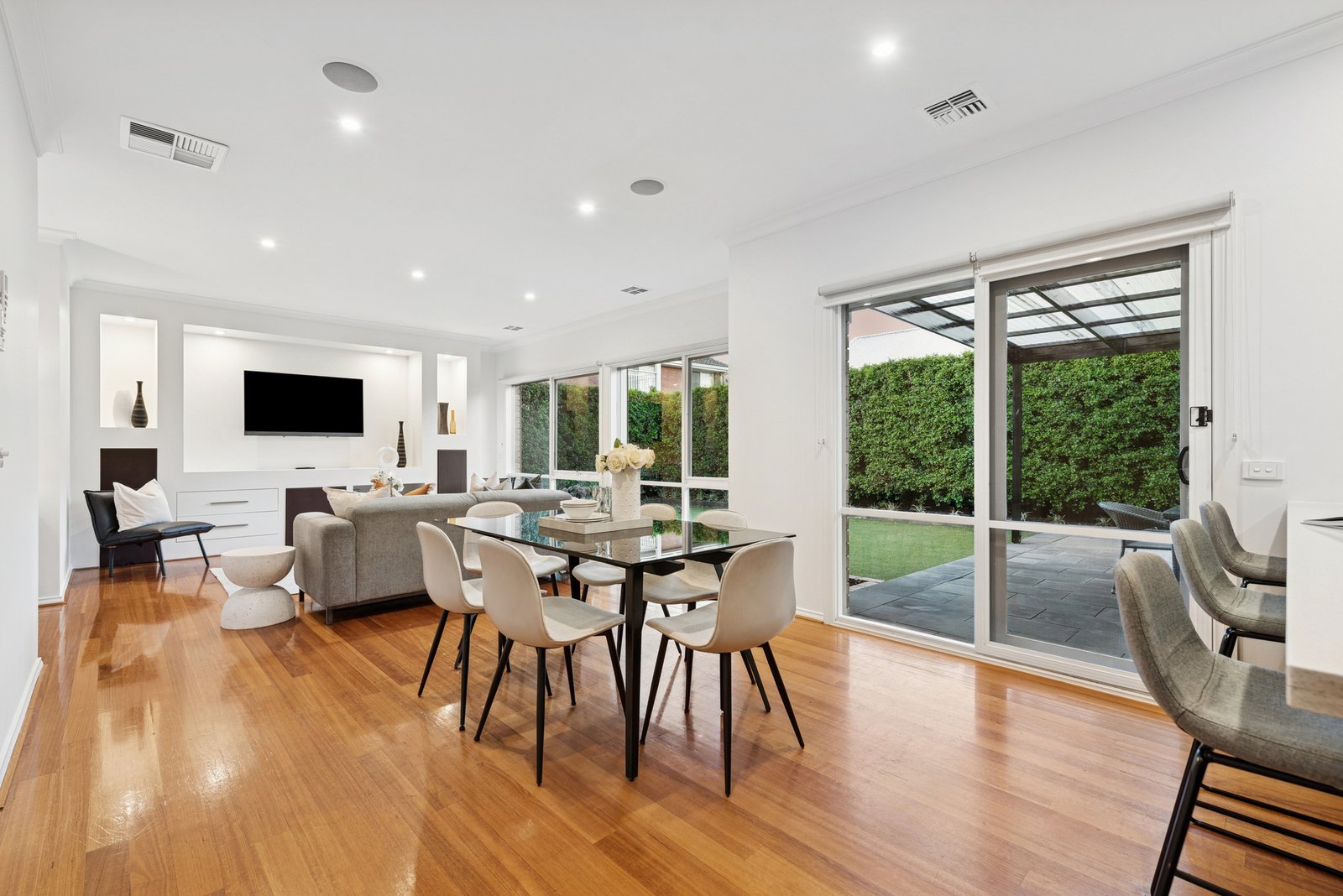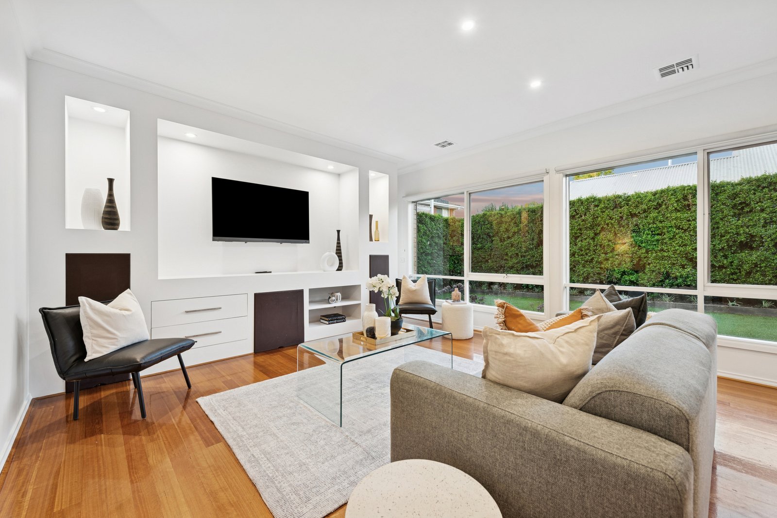 Appointed with high-end extras including solid hardwood floors, quality window furnishings, and built-in mirrored-robes, this classic home is prestige-appointed with ducted heating, cooling, and vacuum. Even the outdoors go above and beyond with triple auto-garaging with through-access to a very private, very sunny north-facing backyard wrapped by manicured hedges.