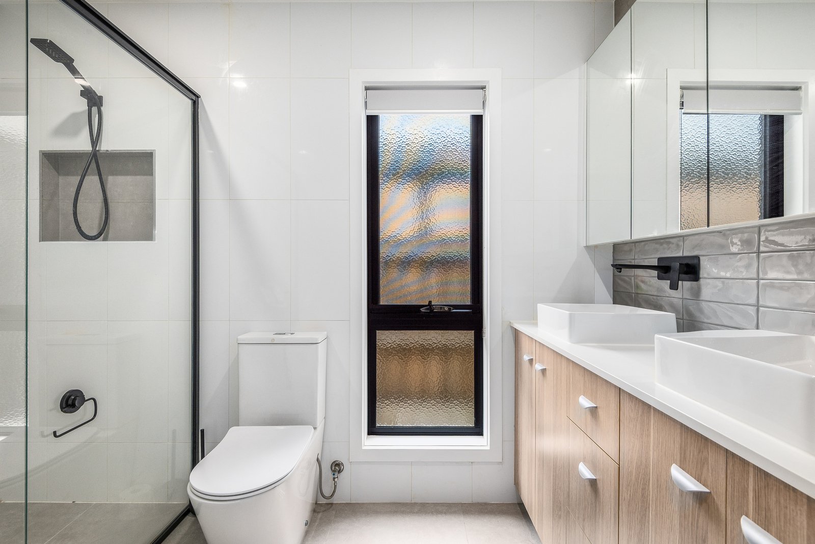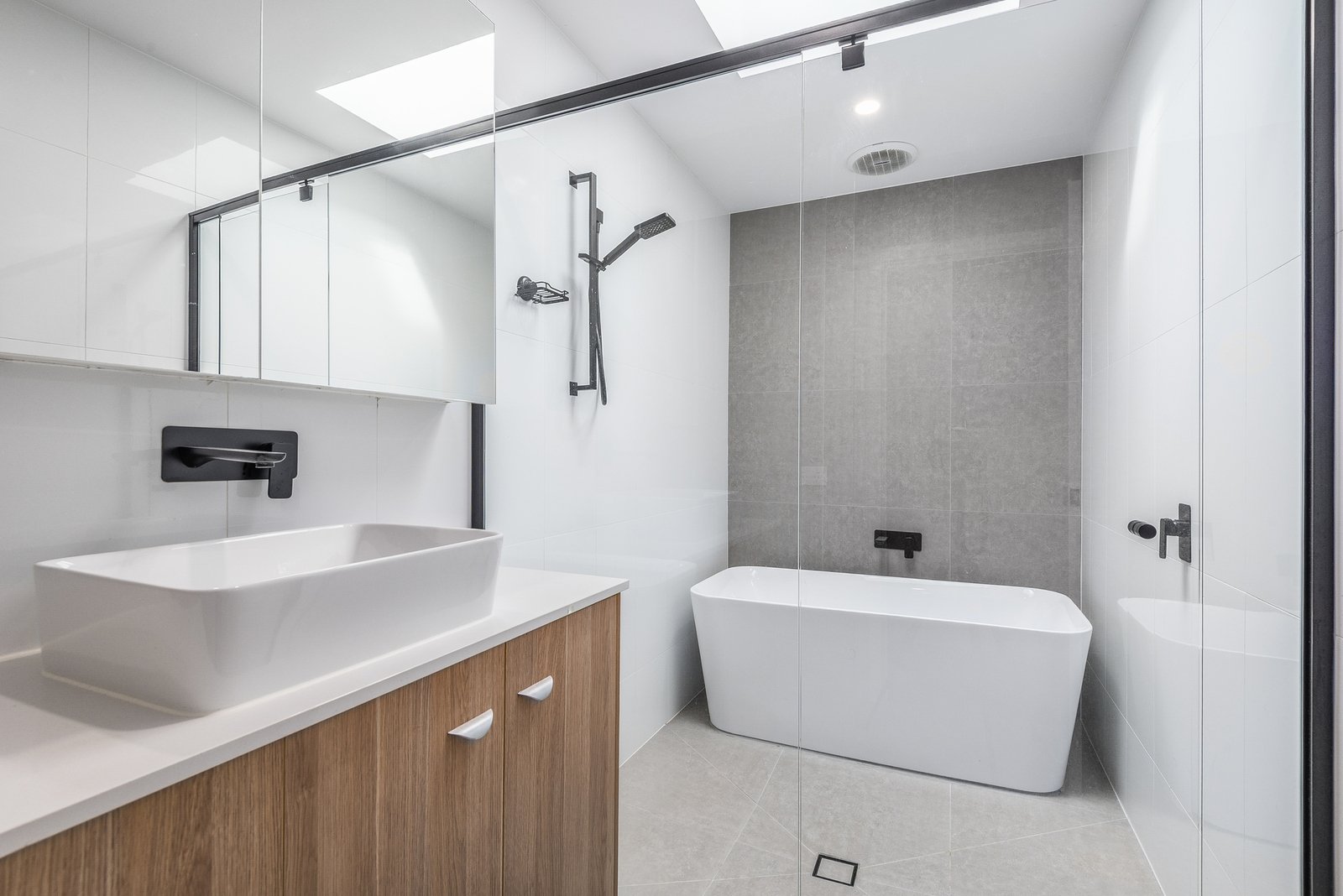 The main bedroom features walk in robes and a tastefully presented ensuite with a stone topped double vanity, mirror cabinet storage and chic black tapware and fittings. Two additional bedrooms include built in robes, serviced by a stunning main bathroom finished in floor to ceiling tiles, featuring a wet zone with freestanding bath, beautiful skylight and modern vanity. A separate powder room caters for family functionality.