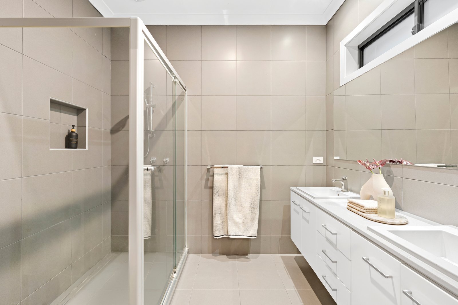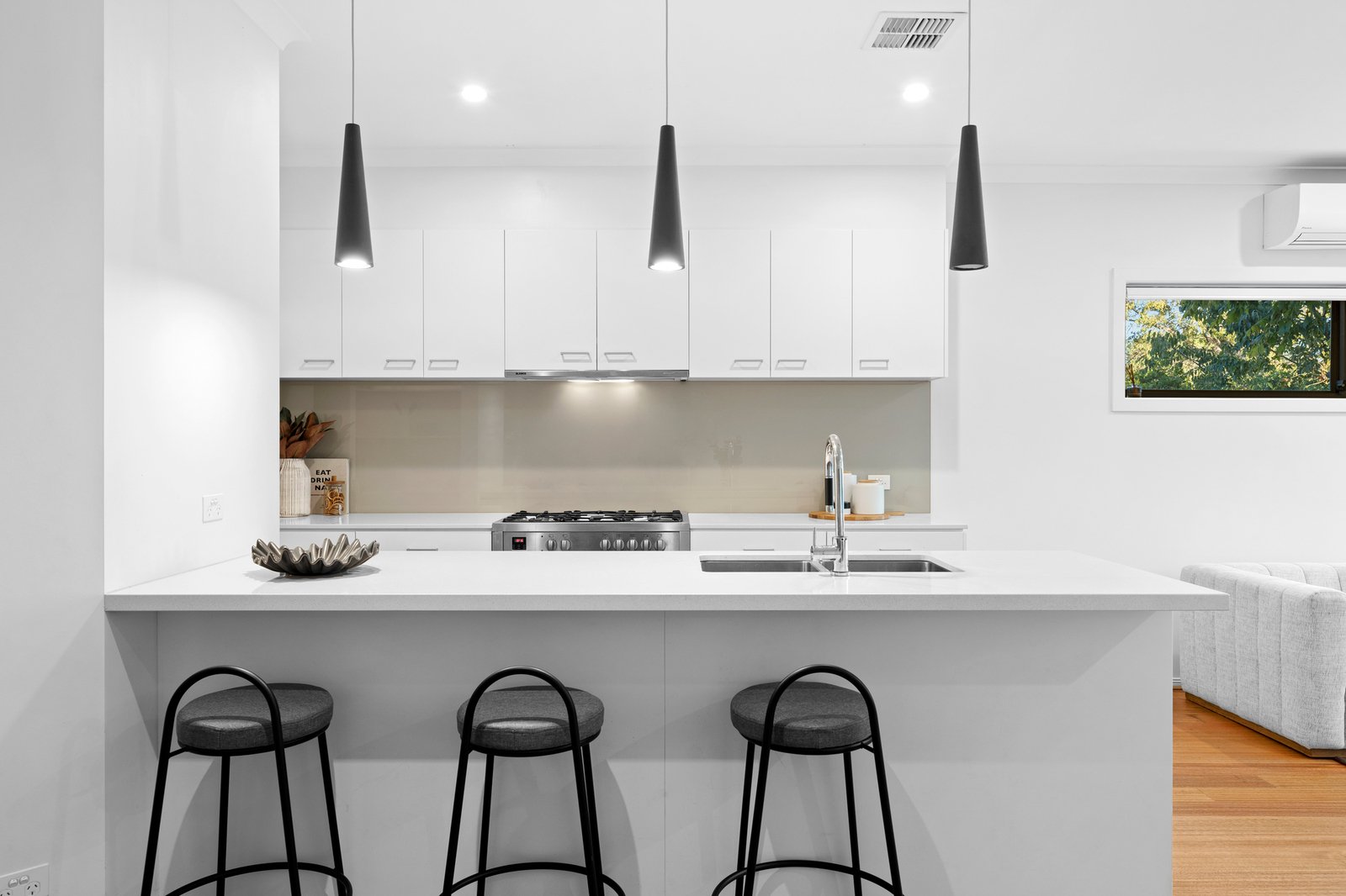 Sophisticated, welcoming interiors are underpinned by stone and timber finishes in the kitchen and bathrooms, nowhere more evident than in the downstairs master bedroom suite with its elegant ensuite and twin vanities.
