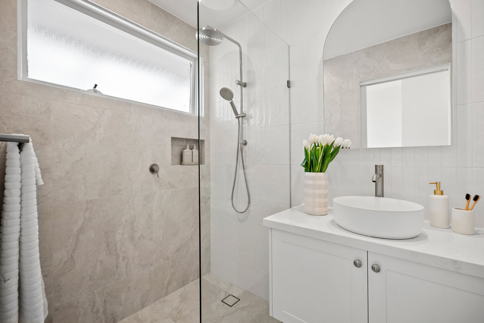 Both bedrooms are generous in size and feature built-in storage - they share the beautifully appointed bathroom with stunning floor-to-ceiling tiles, floating vanity, mirror storage and rain shower.