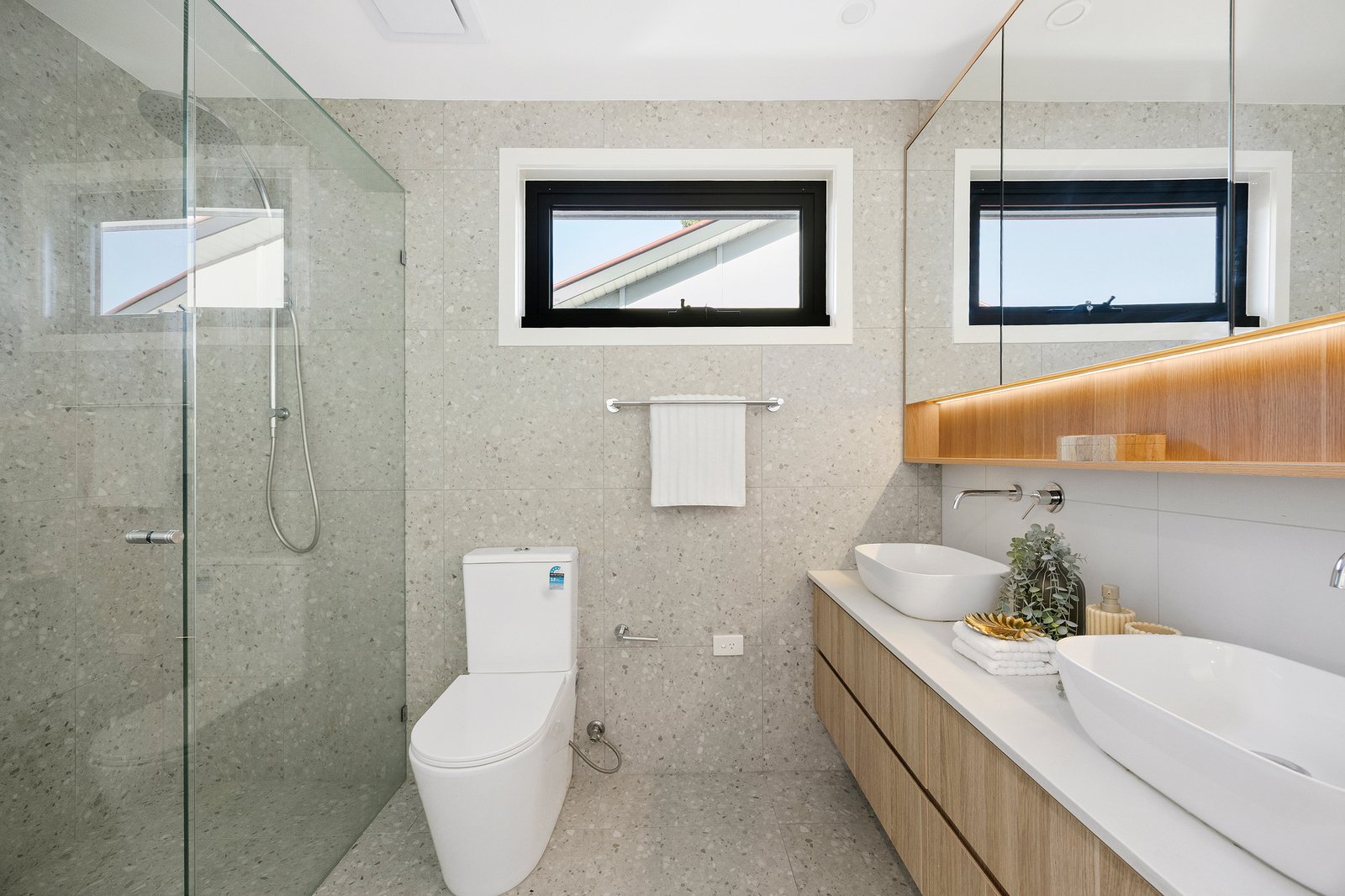 The well separated master suite is pampered by a suite of storage alongside a terrazzo bathroom with a rainfall shower and stone topped vanity. While two further bedrooms are served by a matching central bathroom with a practical wet room configured bath with shower.