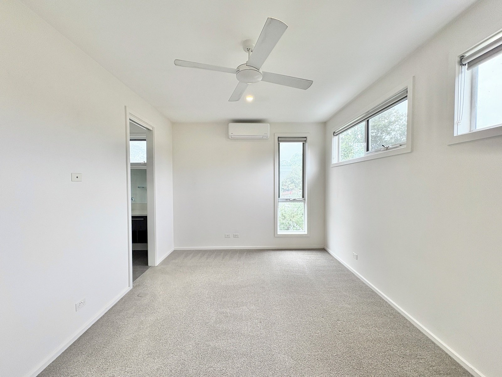 - Master bedroom featuring ceiling fan, split system heating and cooling, walk-in robe and ensuite