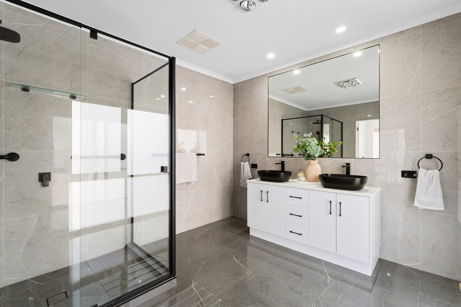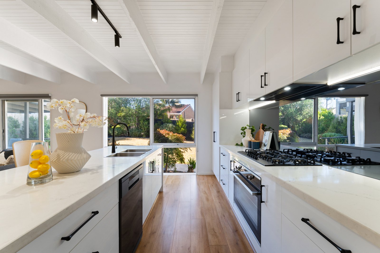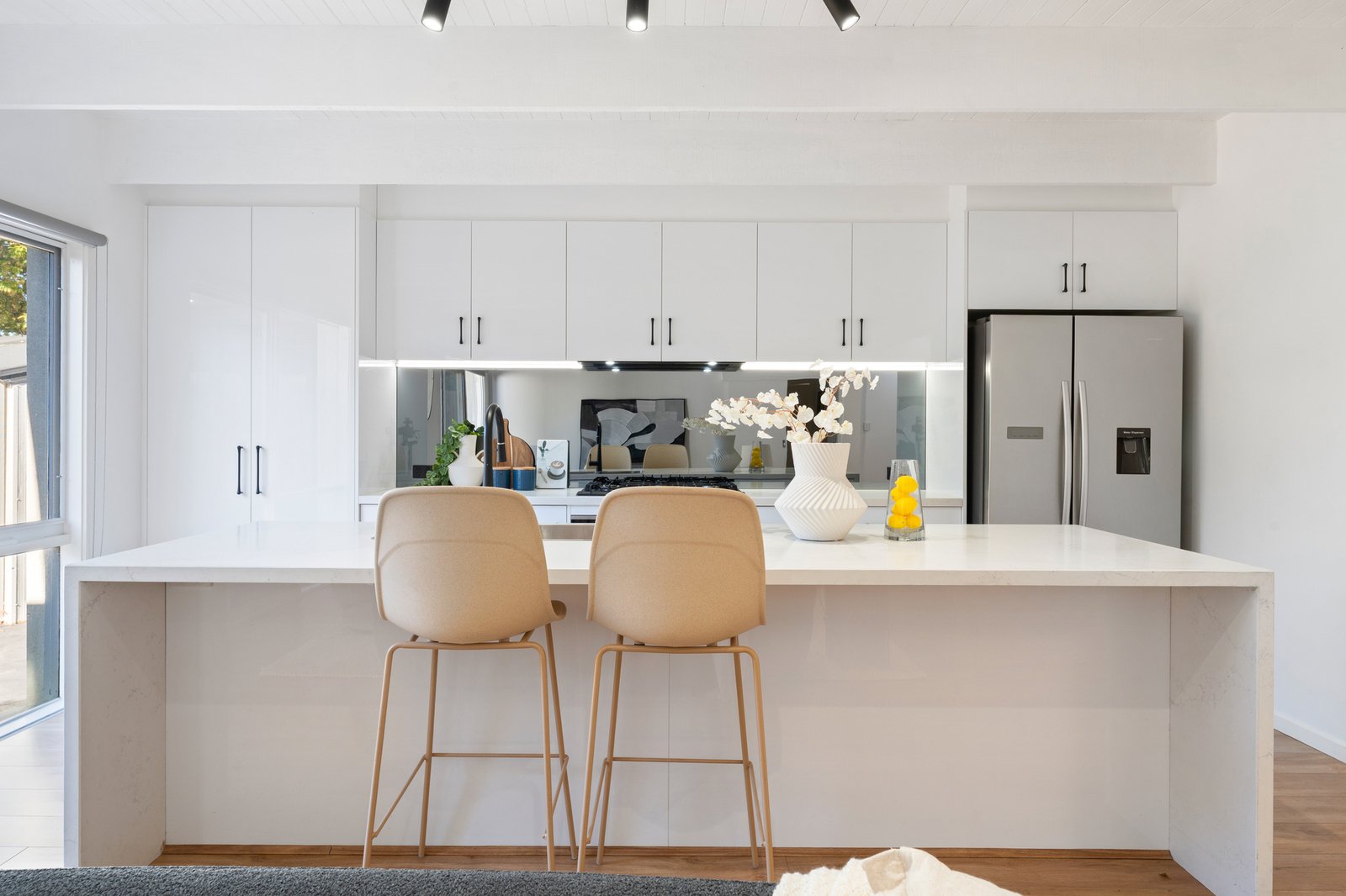 At the heart of the home, a statement kitchen showcases European appliances, a mirrored splashback and an oversized stone-wrapped dining bench that anchors the open-plan living area. Comfort is assured with central heating, cooling and an alarm system, while the bathrooms impress with an ice-white spa bathroom, a five-star dual-vanity ensuite to the principal suite, and premium finishes throughout — from Calacatta stone surfaces and wide oak floorboards to sleek block-out blinds.