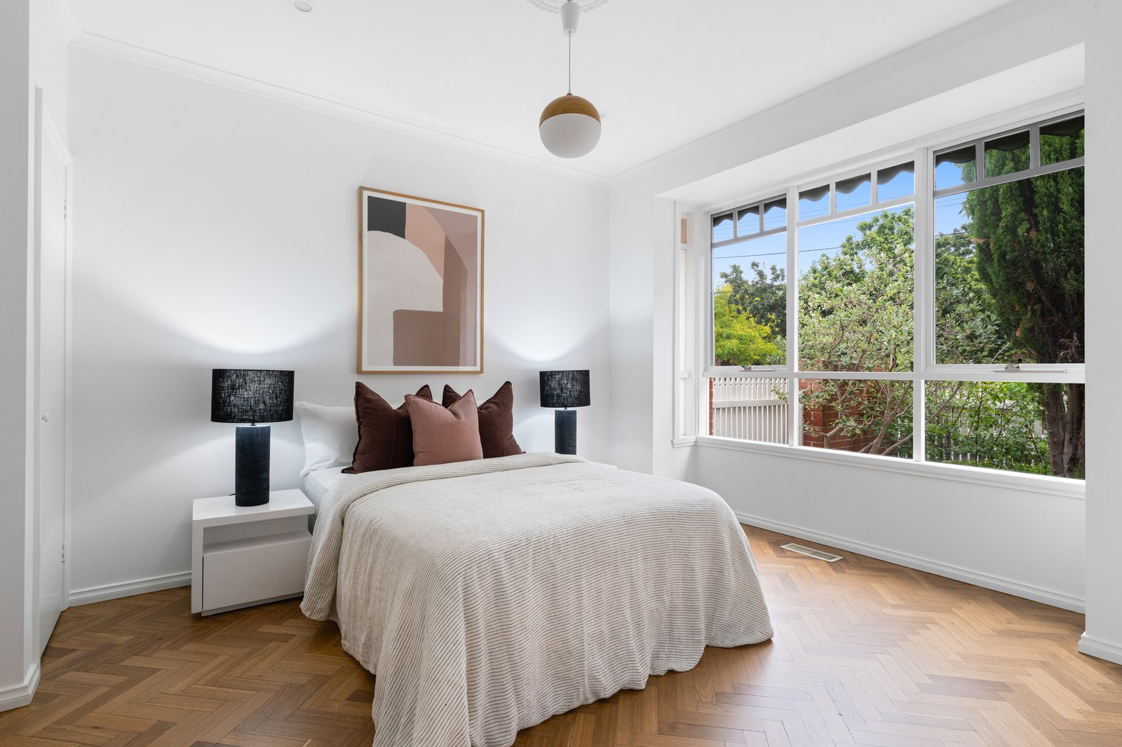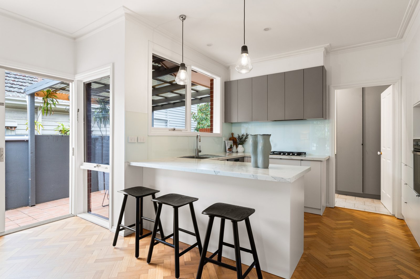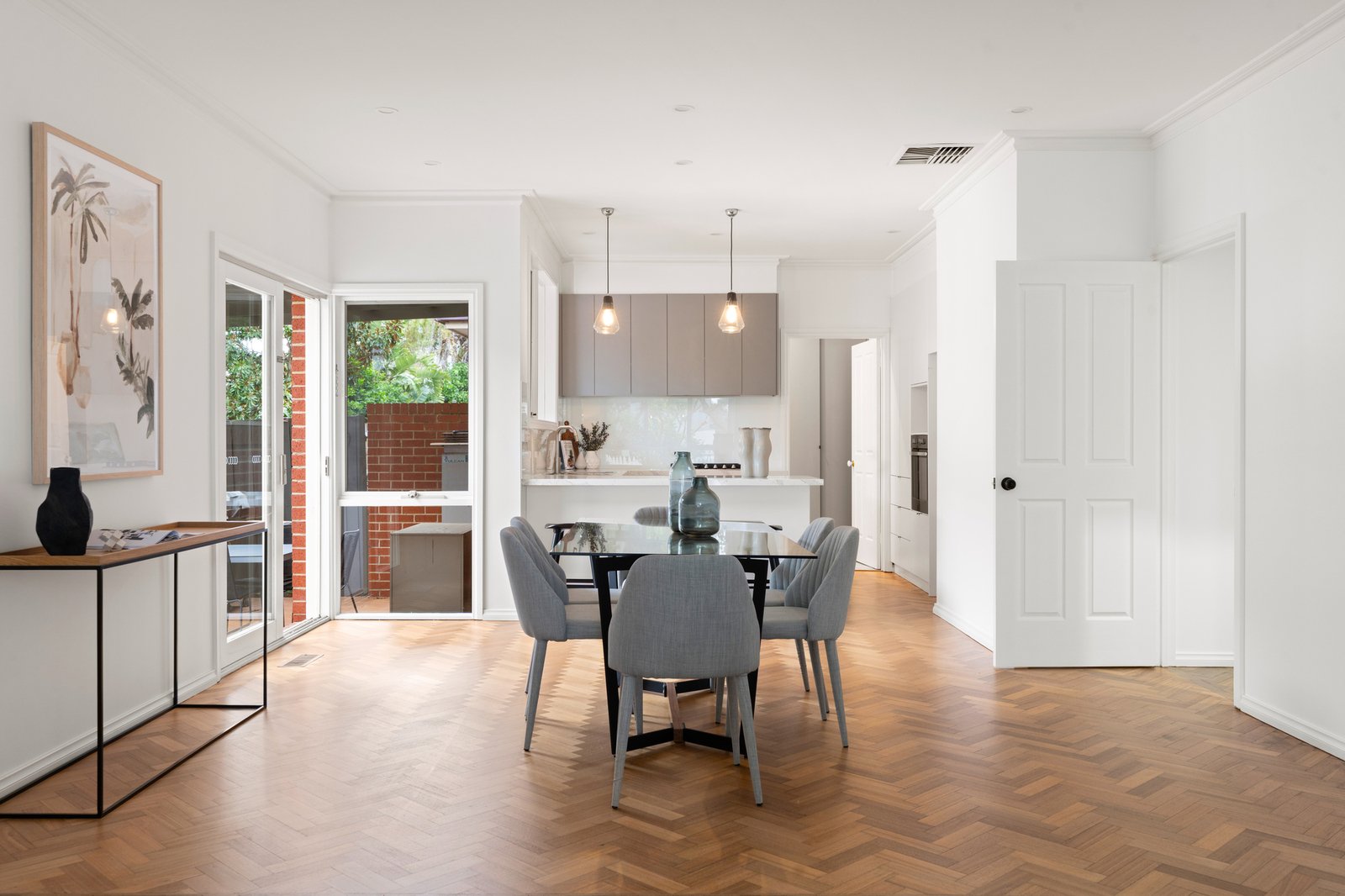 Styled for today with a sleek stone and prestige appliance kitchen (with Bosch dishwasher) and a new designer laundry with the same sleek finishes, the home is appointed with contemporary comforts including tall mirrored robes, ducted heating and cooling and additional reverse-cycle air-conditioning. Timeless by design with authentic herringbone parquetry and classic marbleised stone benchtops, this inspired home features beautiful architectural detail including classic cabinetry and high-corniced ceilings centred on period ceiling-roses.