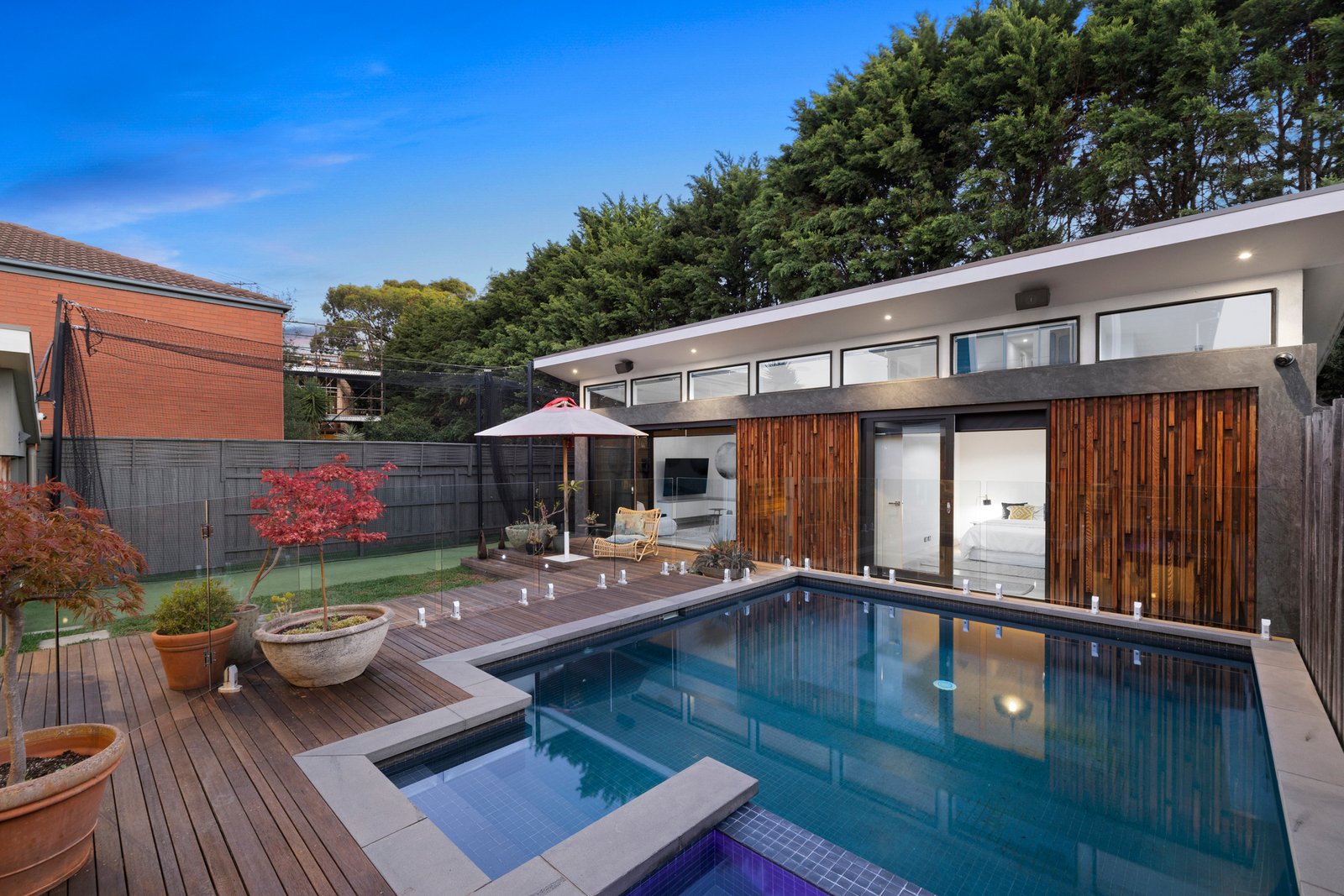In the main property, all bedrooms enjoy the luxury of bathroom access – the ground-floor main with a sophisticated ensuite and dressing room area. Upstairs are three further bedrooms – one with a full ensuite and two flanking a designer Jack & Jill bathroom, while also on this level is a practical study zone and sensational pool-view rumpus set beneath a pitched ceiling. Yet another bedroom & bathroom are also downstairs, but it is the separate accommodation that opens up a wealth of options. With a generous living/dining area and kitchen, plus a double bedroom with luxe bathroom, this is ideally suited for in-laws, older children or long-term guests.