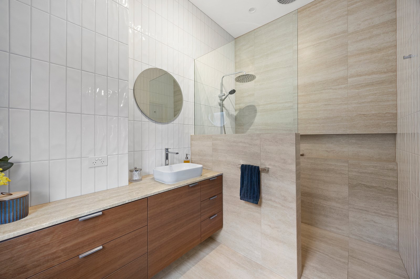 The master suite is peacefully positioned on the ground floor, featuring abundant built-in robes and a luxurious ensuite with an oversized shower and striking floor-to-ceiling feature tiles. A front lounge with fireplace detail, private study, full-sized laundry, and powder room add to the practical ground level layout.