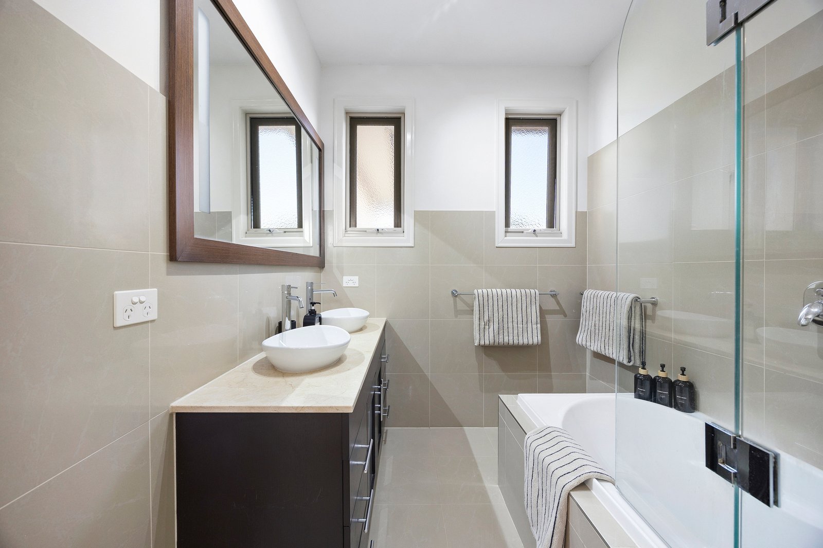 Upstairs, three bedrooms with built-in robes are serviced by a central bathroom with bathtub and separate WC, complemented by a retreat for kids or quiet relaxation.