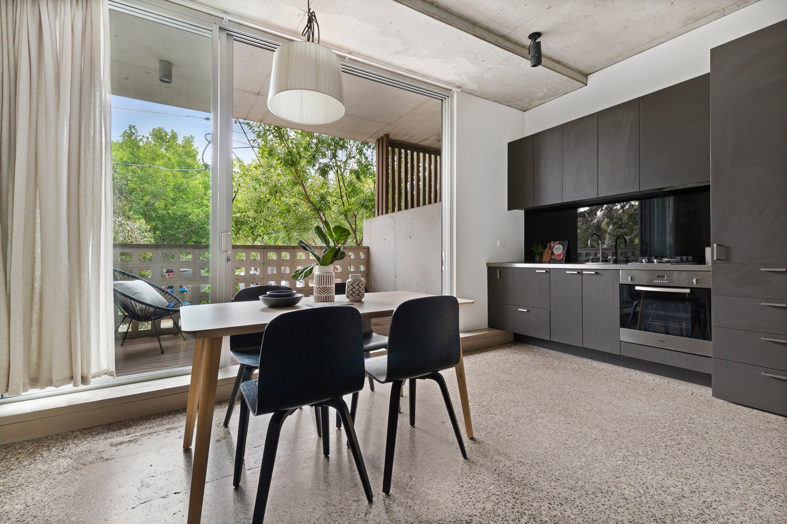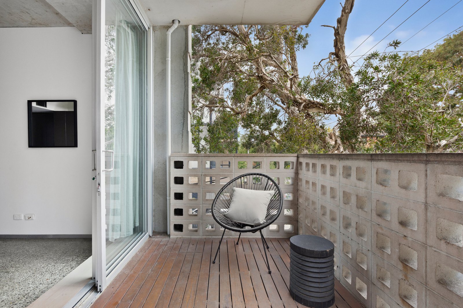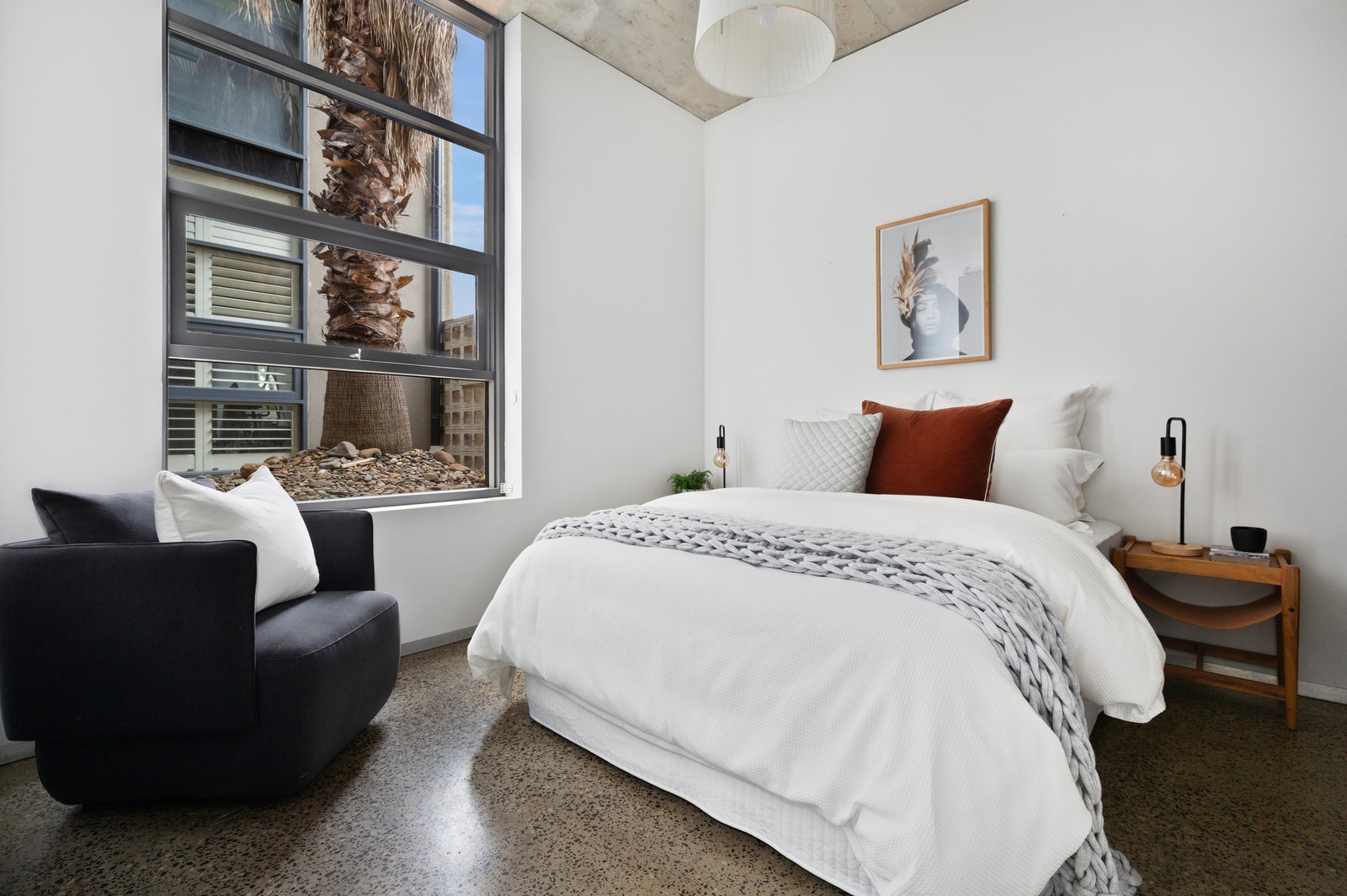 The robed bedroom is generous in size and naturally lit with a striking palm tree aspect, superbly serviced by a pristine bathroom with full-height tiles, mirrored cabinetry, and a rainfall shower fitting. Special features include secure parking, a storage cage, concealed study nook with a built-in workstation, a Euro laundry, ducted heating and cooling throughout, and intercom entry. Designer additions include soaring concrete ceilings, chic terrazzo flooring, and exquisite feature lighting.