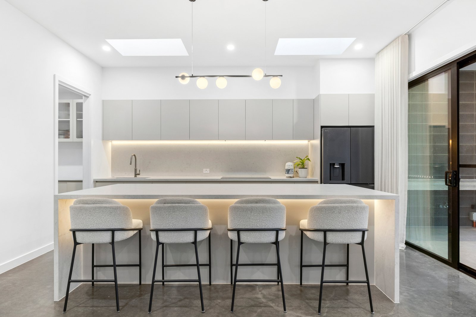 The striking façade presents an aesthetic blend of brick, render and textural cladding, introducing the sophisticated theme of the home. Inside, the breathtaking entry features a soaring high void, statement pendant lighting, polished concrete floors and a stunning timber staircase with ambient recessed wall lighting, showcasing the impressive scale and high-end quality within. From the entry, the spacious open plan kitchen, dining and living area reveals floor-to-ceiling sheers and glass sliders connecting with the alfresco for effortless indoor–outdoor living and entertaining. The stunning kitchen features a large island, waterfall stone benchtops, quality Fisher & Paykel appliances including a 900mm oven, induction cooktop and fully integrated double-drawer dishwasher, sleek cabinetry and generous storage with a large walk-in pantry. LED strip lighting and beautiful skylights enhance the refined sense of style in this space.