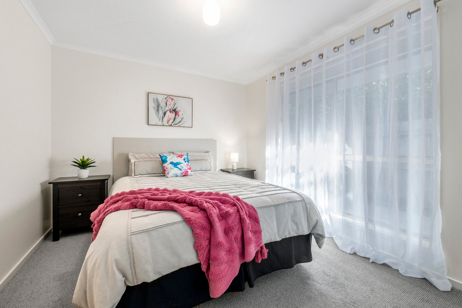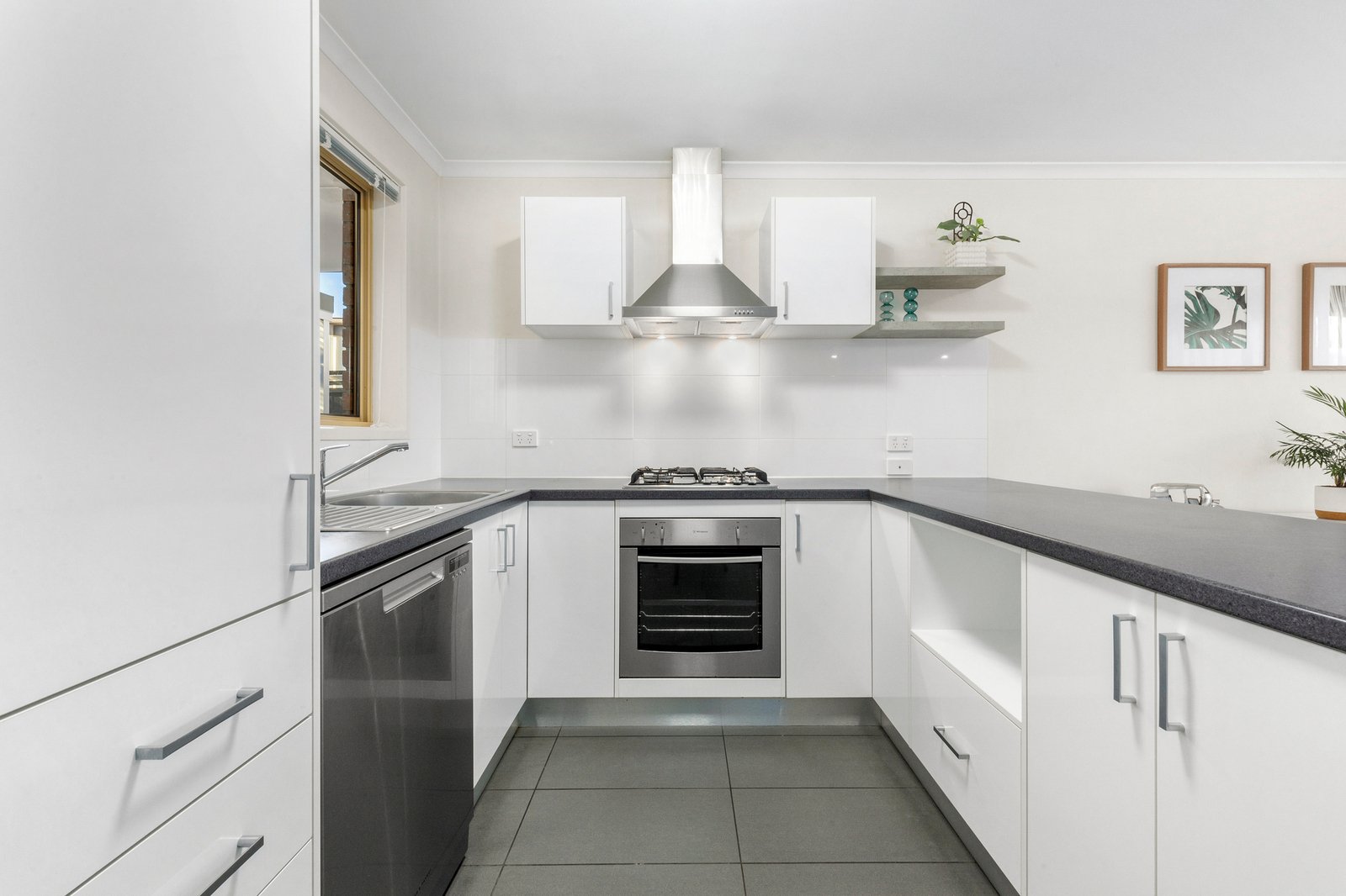 The sunlit open-plan living and dining zone provides a relaxed everyday retreat, while the contemporary kitchen is designed to impress, featuring stainless steel appliances, a gas cooktop, oven and dishwasher to cater for both daily meals and entertaining.