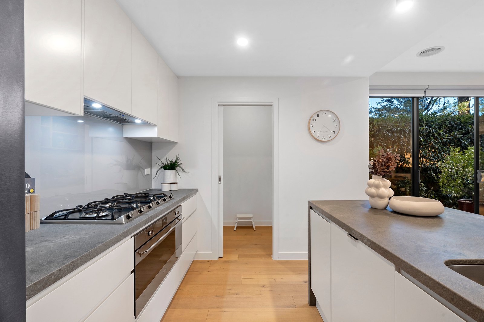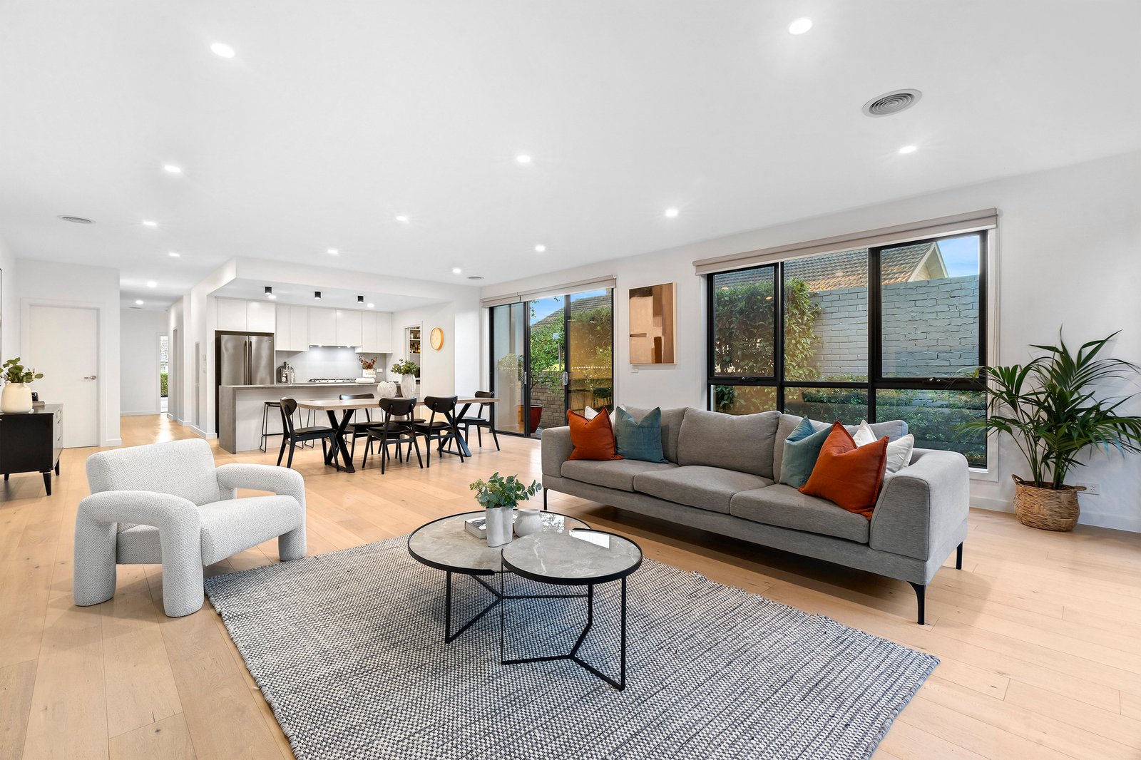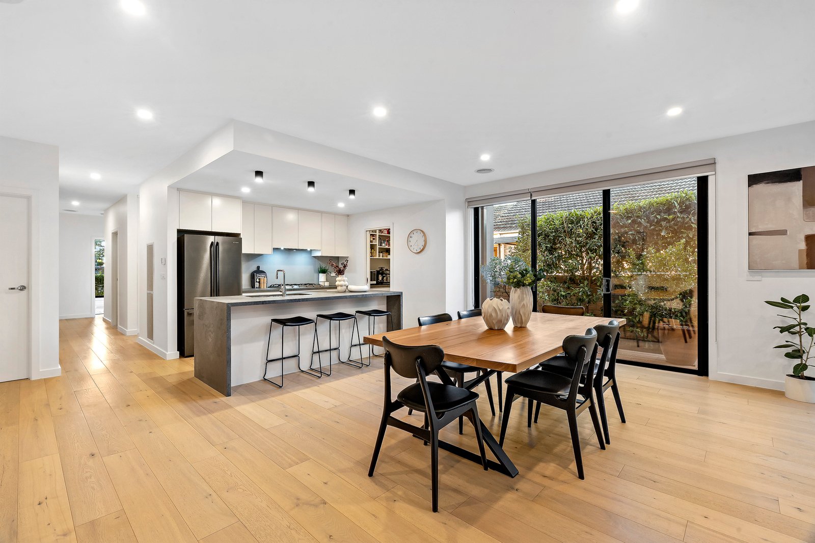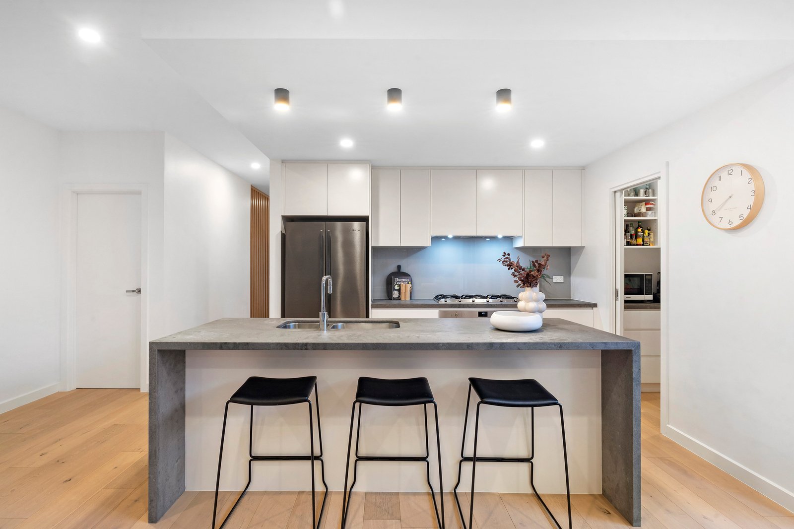 Designed for effortless entertaining, the open plan kitchen flows seamlessly into the dining and living domain, all complemented by warm wooden floorboards throughout the main living zone. At the heart of the home, a striking concrete island bench anchors the kitchen, complete with double sink, stainless steel appliances, dishwasher, walk-in pantry and ample storage — built for both everyday ease and weekend hosting.