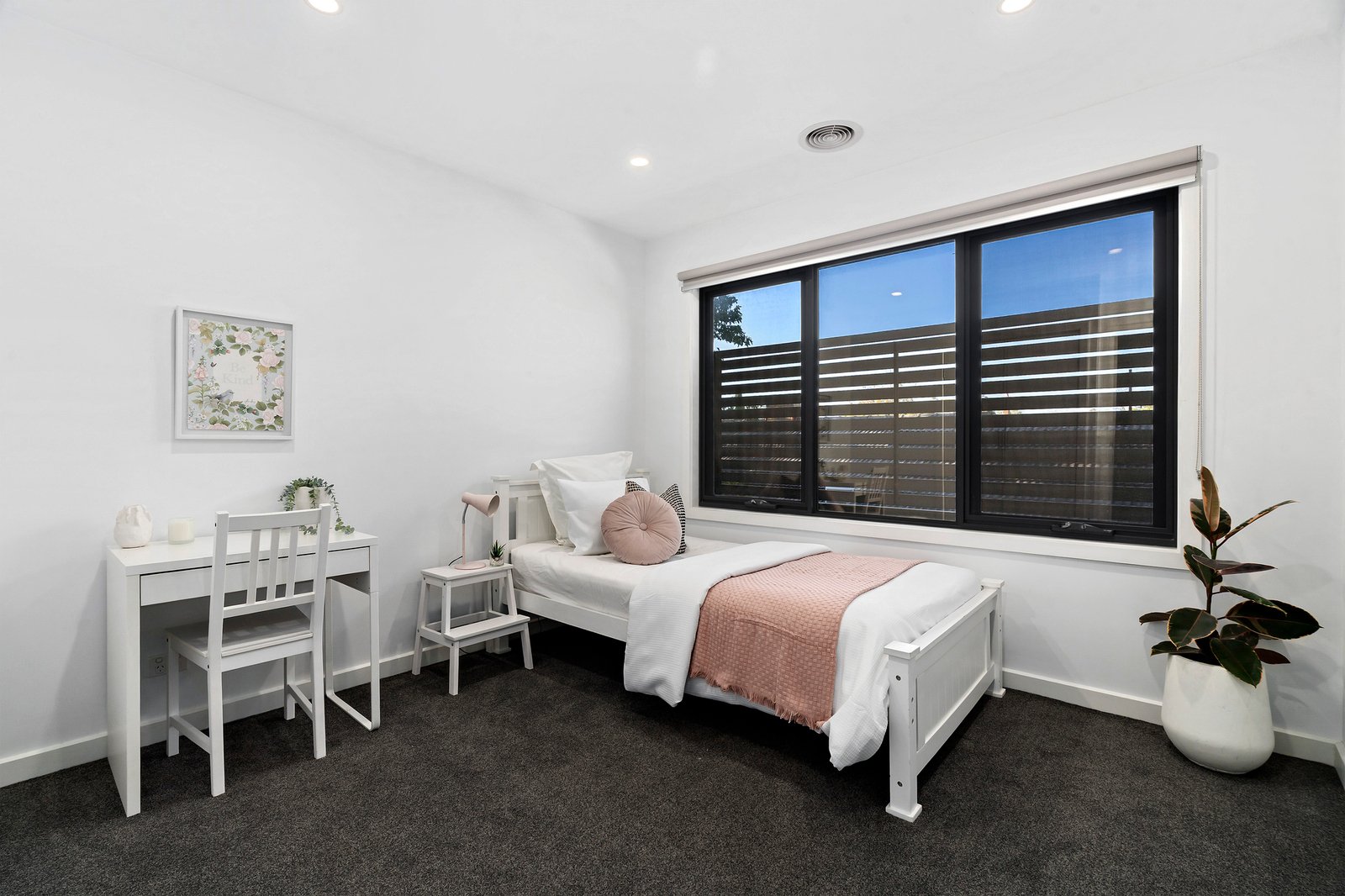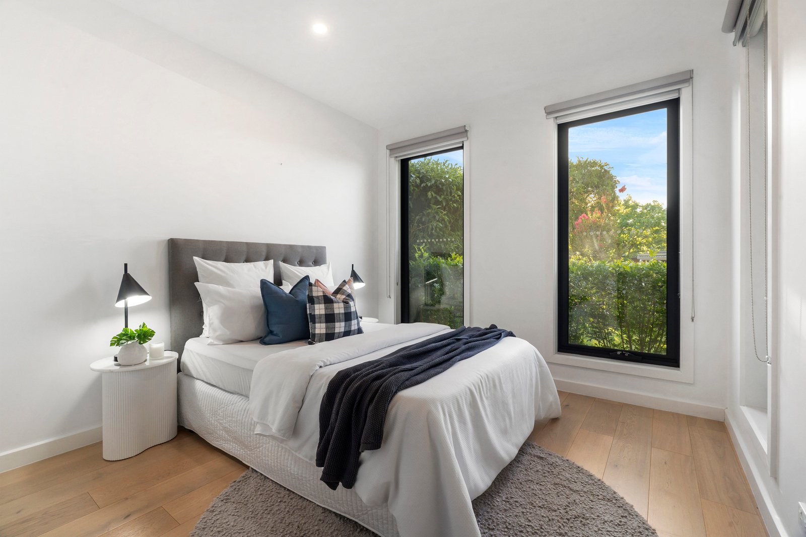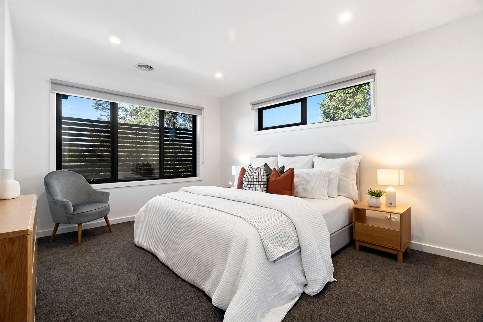 Designed for effortless entertaining, the open plan kitchen flows seamlessly into the dining and living domain, all complemented by warm wooden floorboards throughout the main living zone. At the heart of the home, a striking concrete island bench anchors the kitchen, complete with double sink, stainless steel appliances, dishwasher, walk-in pantry and ample storage — built for both everyday ease and weekend hosting.