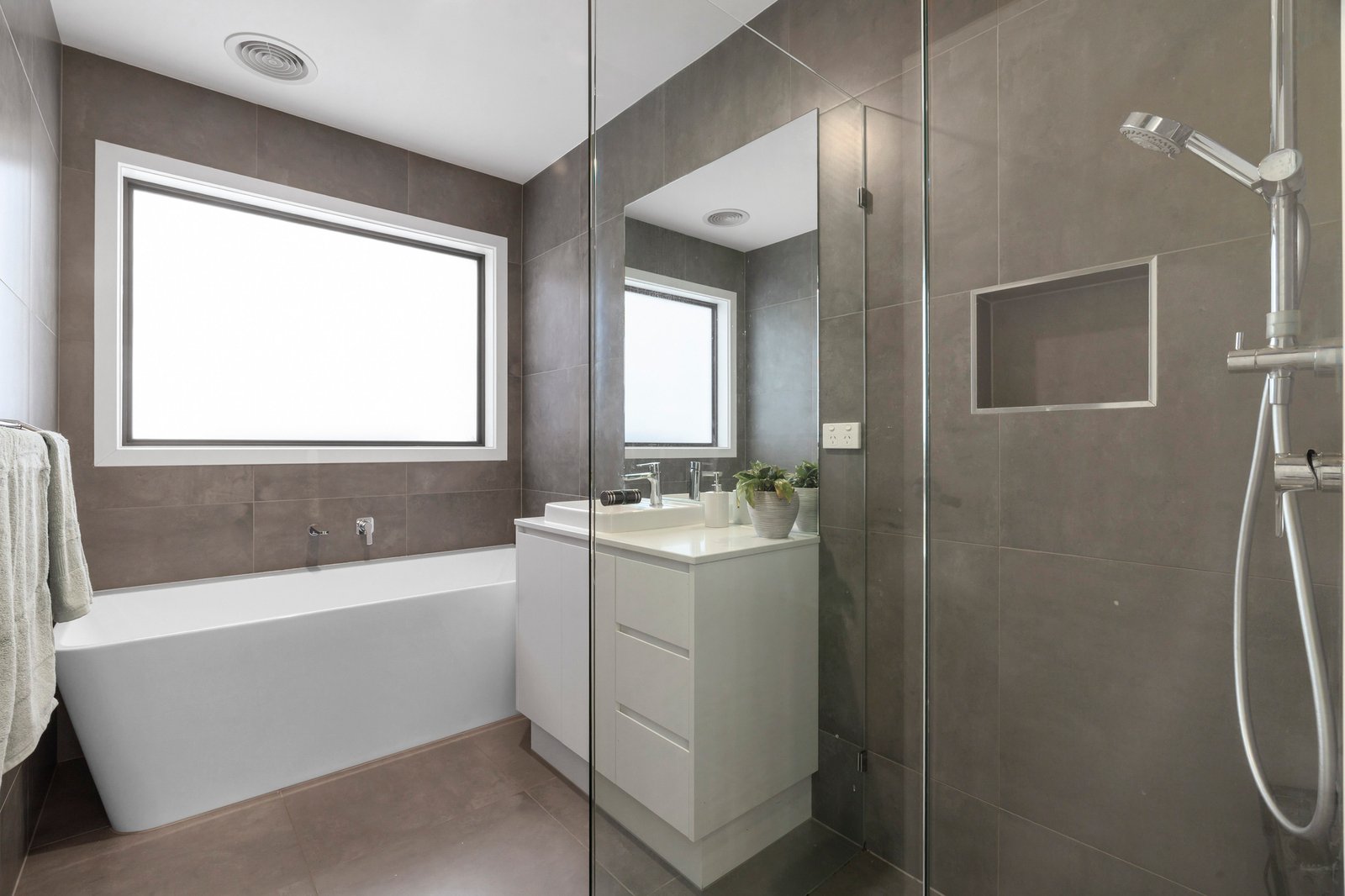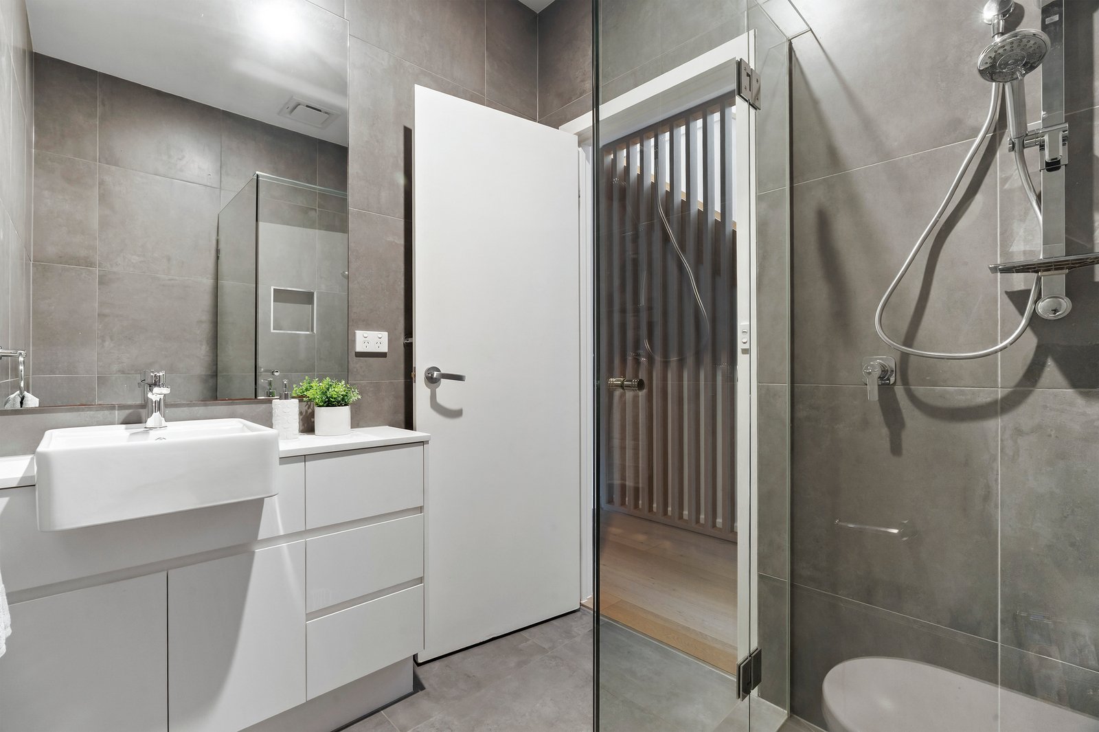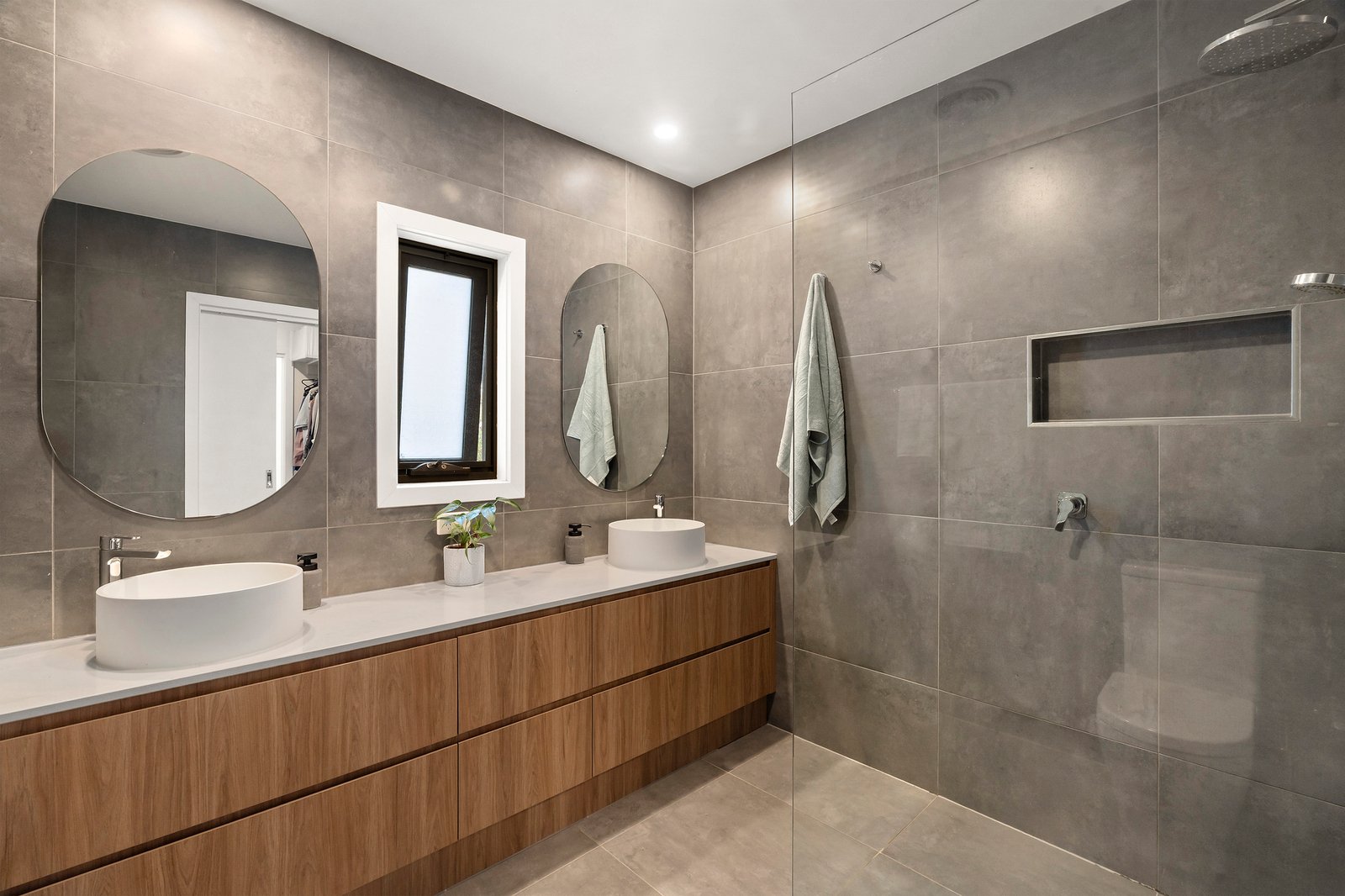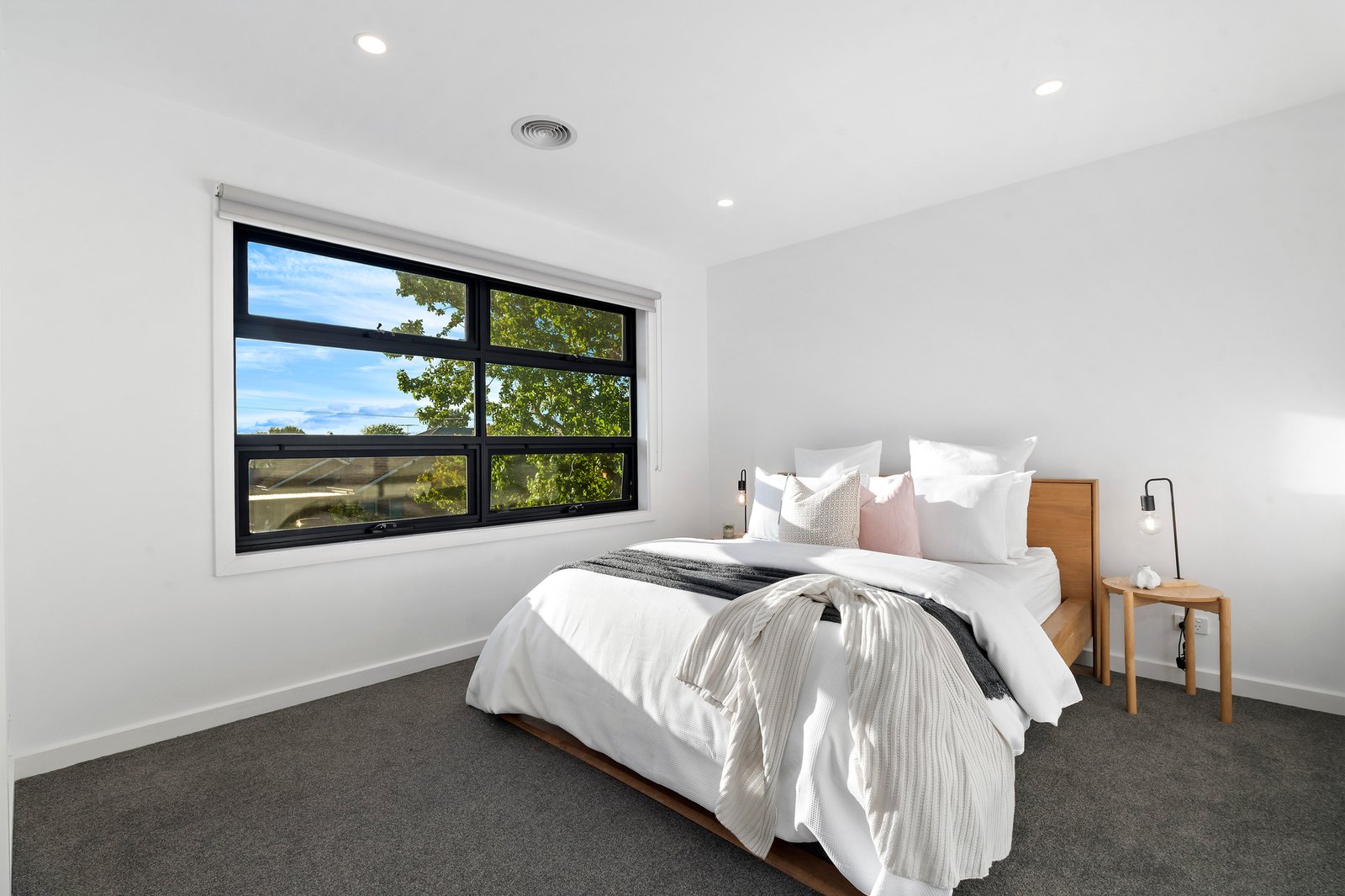 Designed for effortless entertaining, the open plan kitchen flows seamlessly into the dining and living domain, all complemented by warm wooden floorboards throughout the main living zone. At the heart of the home, a striking concrete island bench anchors the kitchen, complete with double sink, stainless steel appliances, dishwasher, walk-in pantry and ample storage — built for both everyday ease and weekend hosting.
