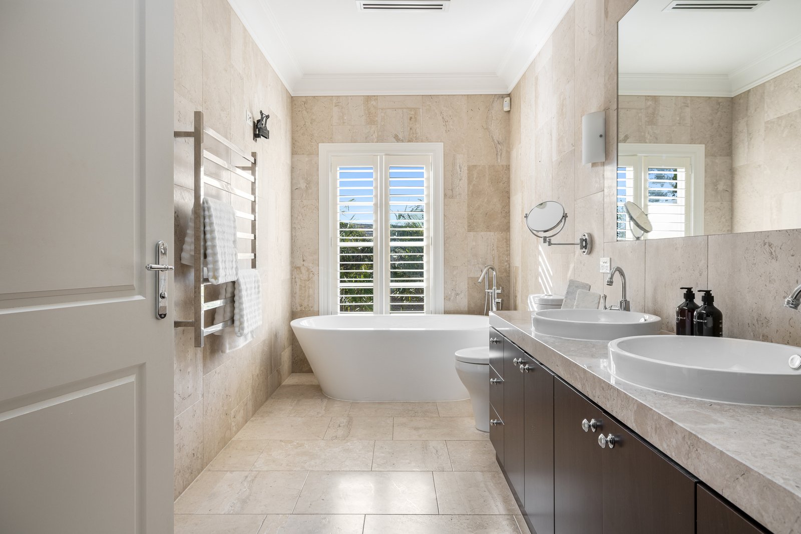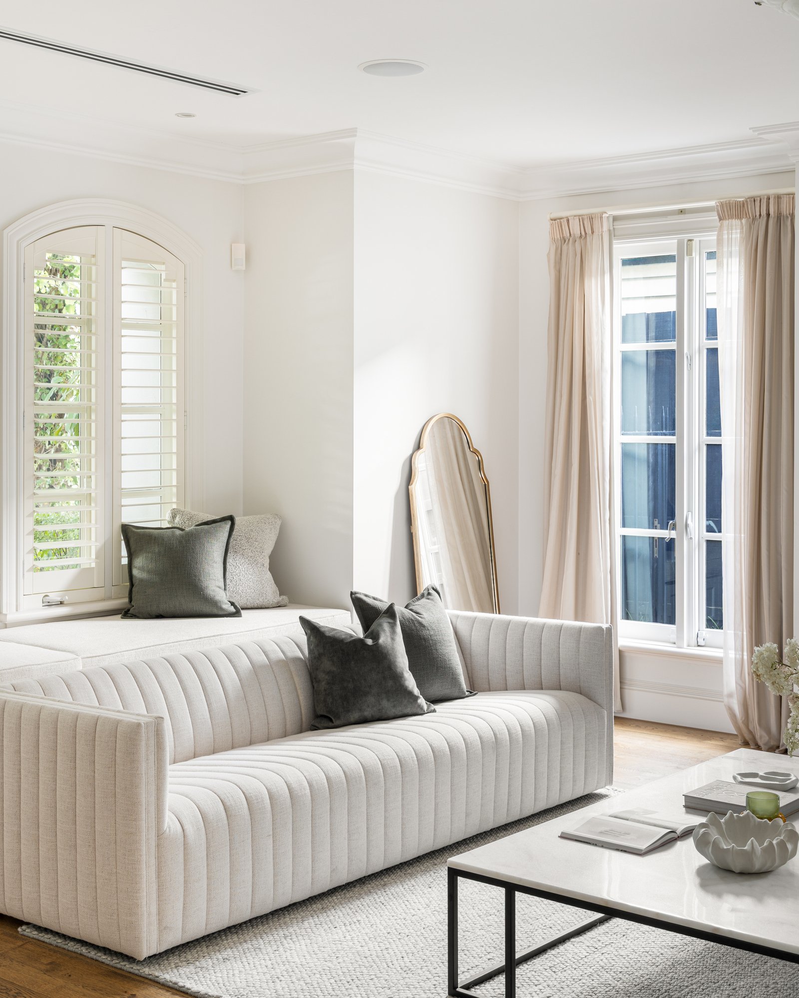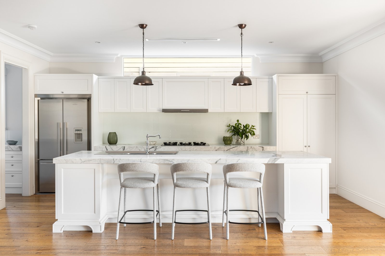 Offering three private suites over two levels, this ultra-accommodating home features a principal master domain flowing north to a curvaceous balcony, a second treetop suite with potential access to a separate lounge-sized retreat (currently configured as a fifth bedroom), and a ground-floor alternative master or guest suite. Offered with a full complement of family-wise features to match this multi-suite design, there are luxe fully tiled bathrooms cocooned in rich natural stone, endless storage including multiple walk-in robes, and a designer curation of aged oak floors and textural marble benchtops throughout the kitchen, laundry and even the butler’s pantry.