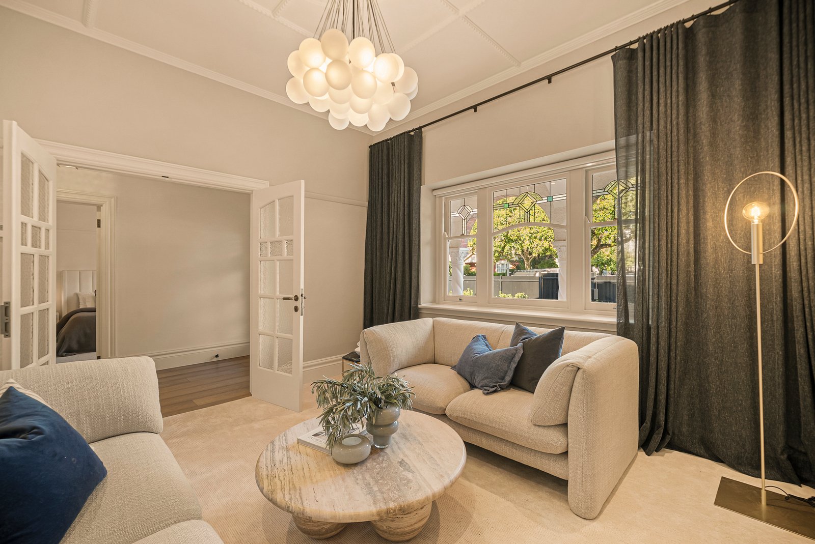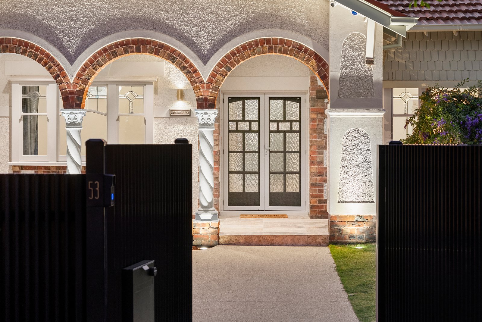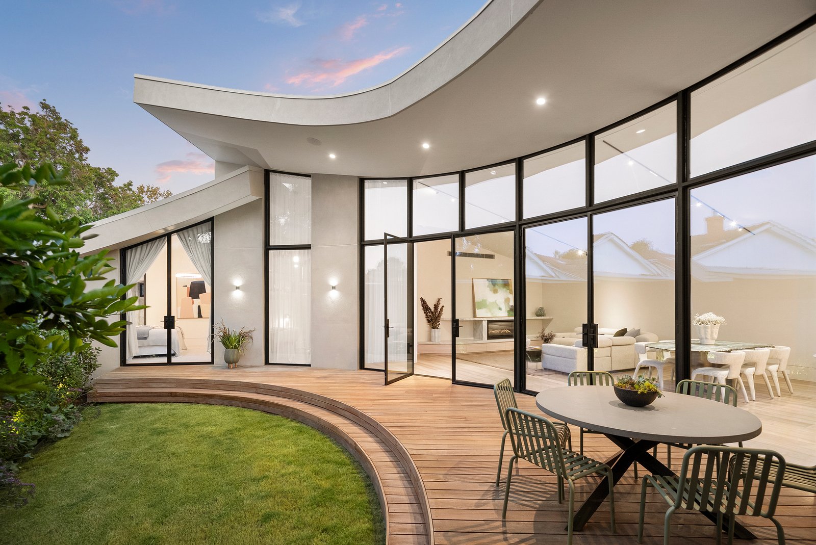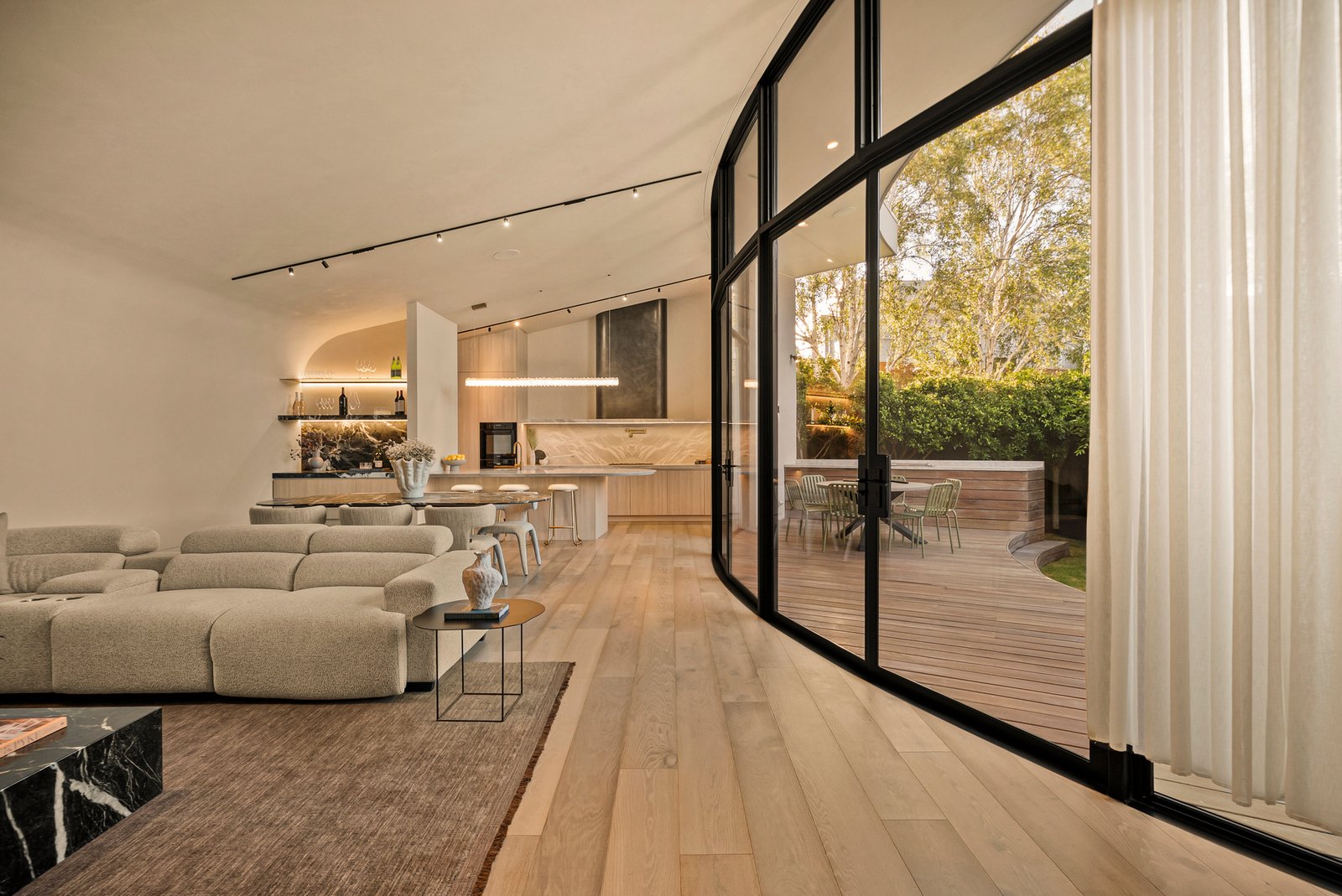 Making a gracious entry with beautiful original rooms including a fine formal lounge, the home unfolds through a vast double doors and a marble threshold into the curvaceous family spaces beyond; offering room to lounge and dine beneath a raked ceiling soaring to 4.5.m....and entertain beyond towering sheets of full-height glass on a quarter-circle sweep of deck.