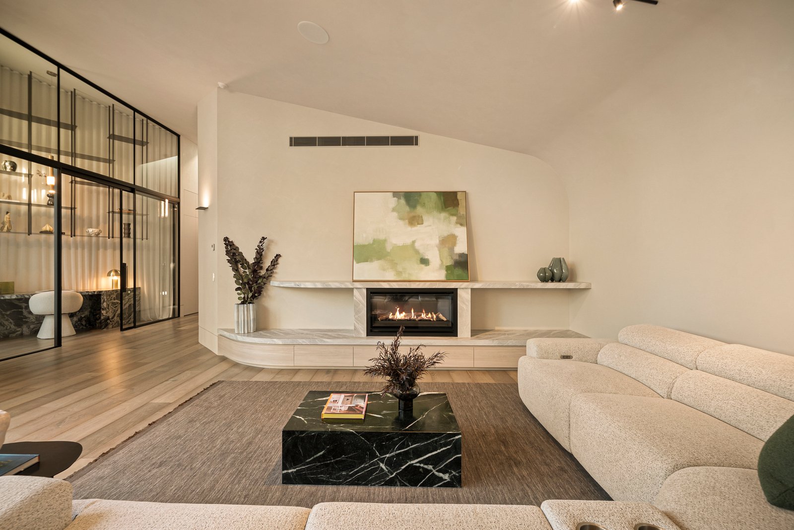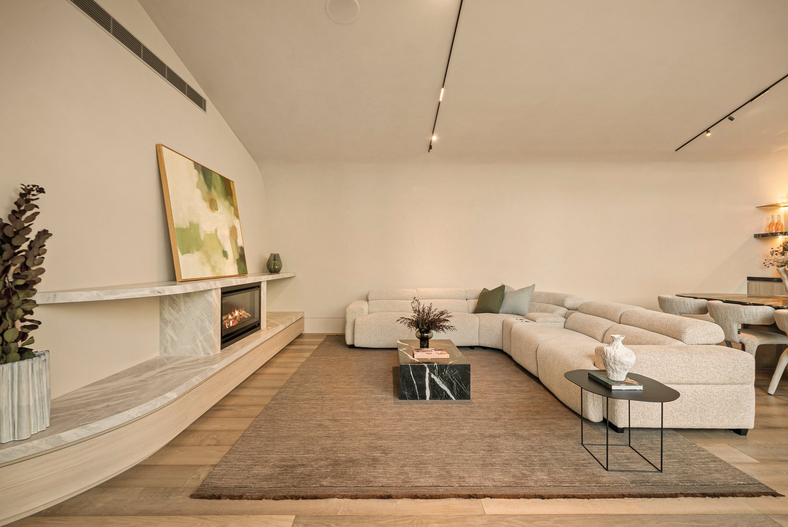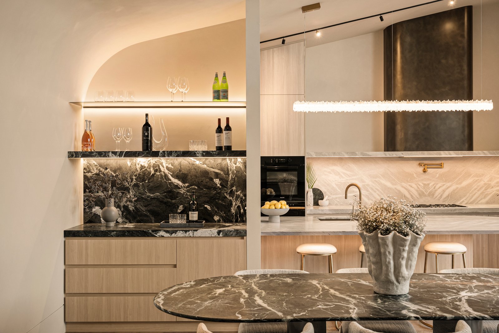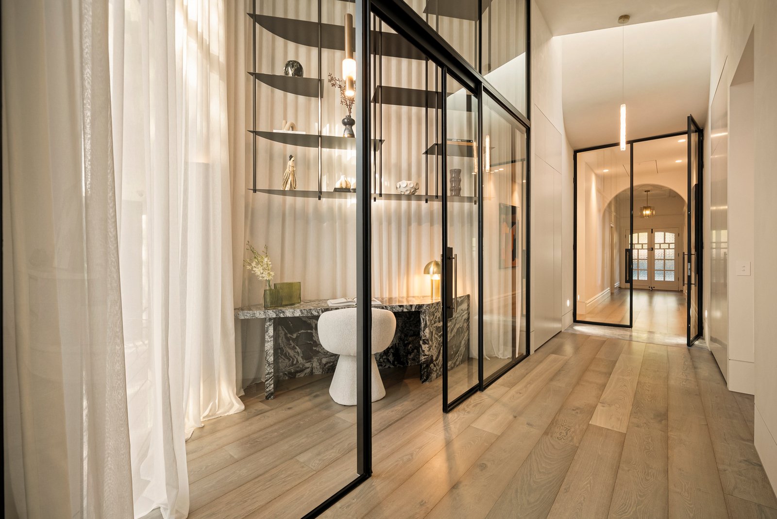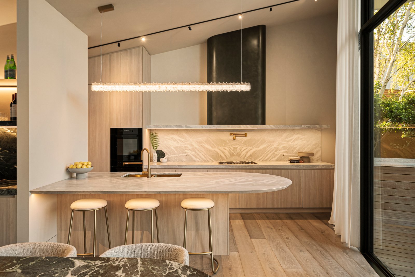 Curated with the finest natural stones and the widest French Oak wide-plank flooring, there are the tallest 2-Pac full-height doors, and the most velvety wool hand-tufted carpet. In this impeccable design, Carrara marble-topped vanities float in Tundra limestone-tiled bathrooms, motorised blinds backed Warwick sheer linen curtains, and About Space track-lighting shines beside Lucretia Lighting’s South American crystal pendants and alabaster wall lights. From Murowash textured paint finishes for the kitchen and living zone, to nickel and aged brass tapware and hardware (and even rangehood), to the Colefax and Fowler wallpaper and Carrara herringbone tiles of the powder-room, every detail is considered and crafted here.