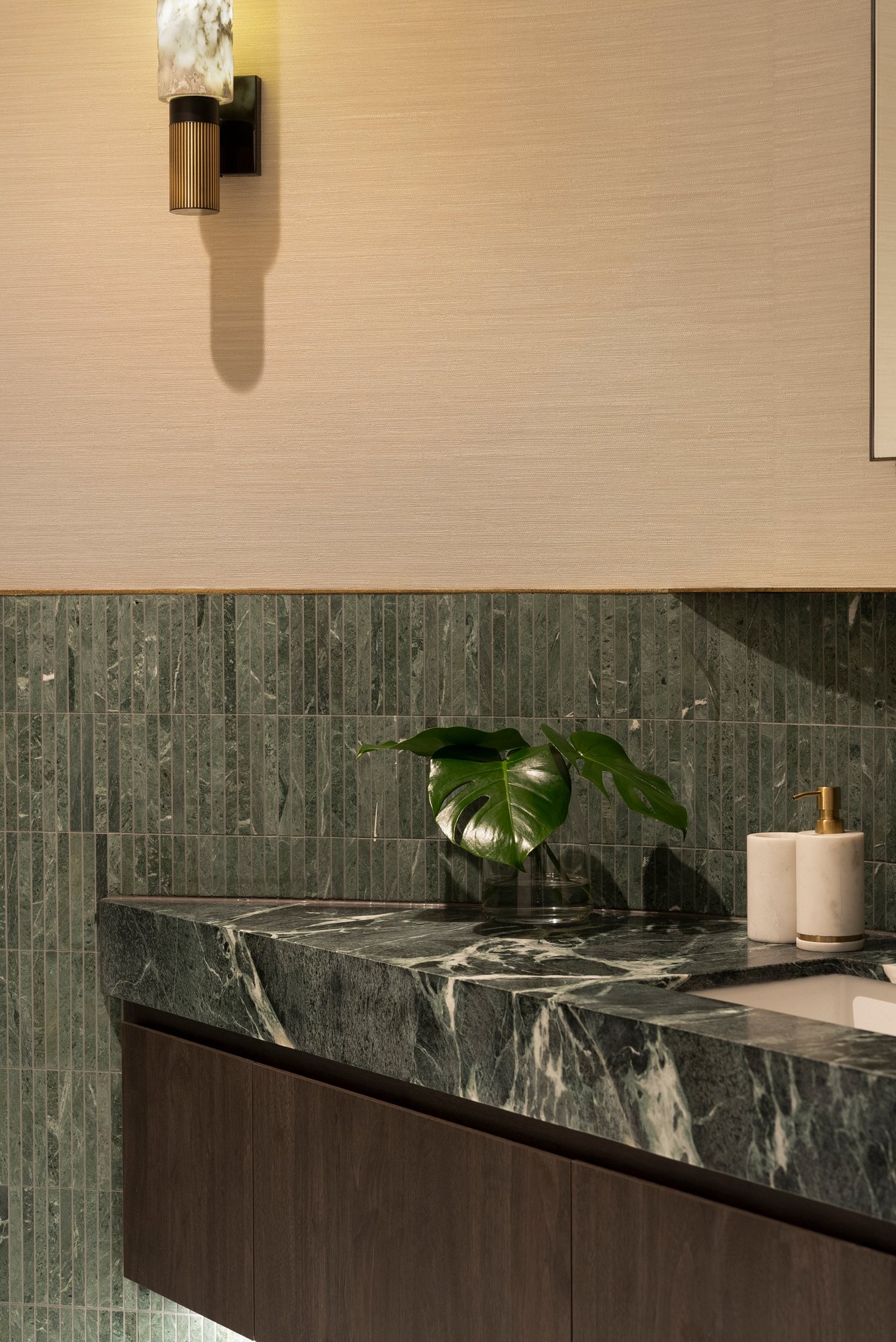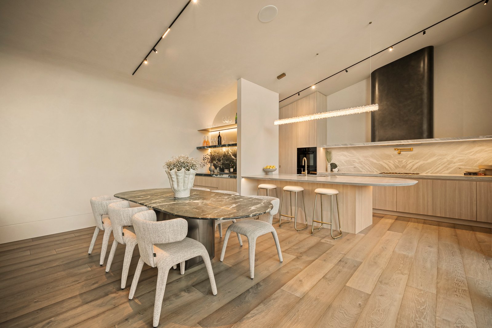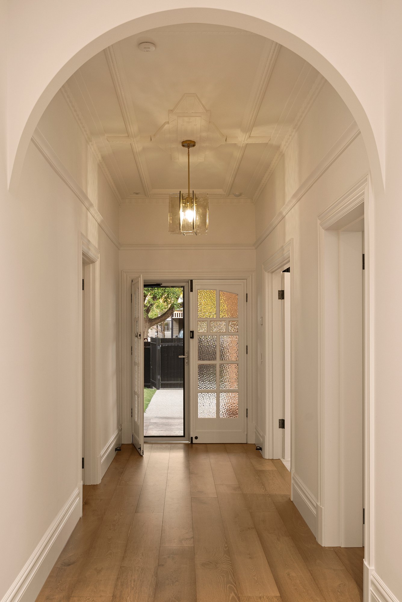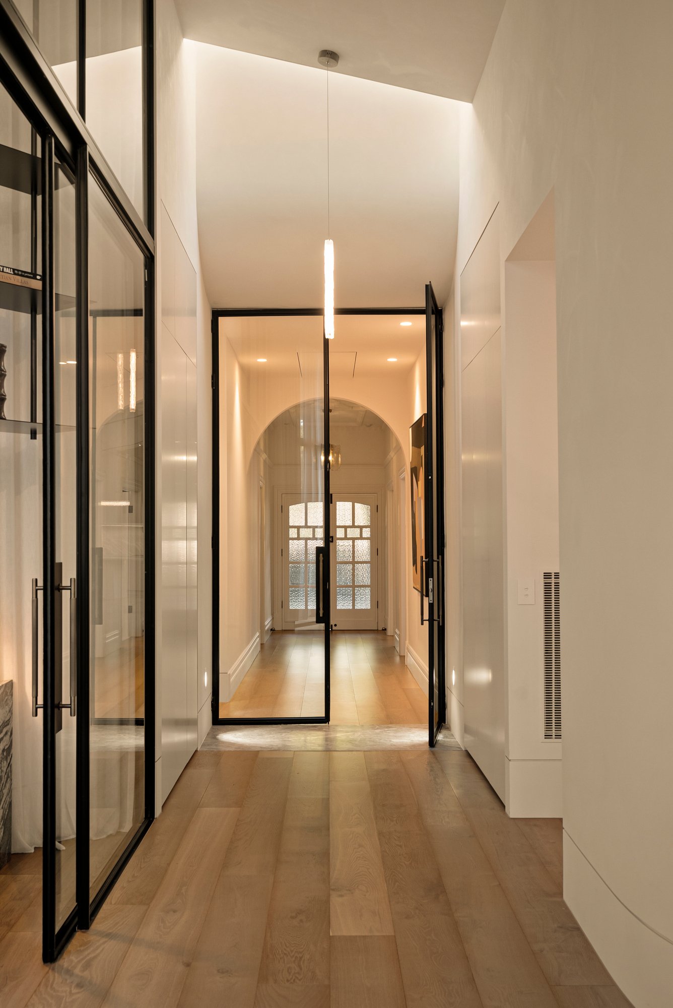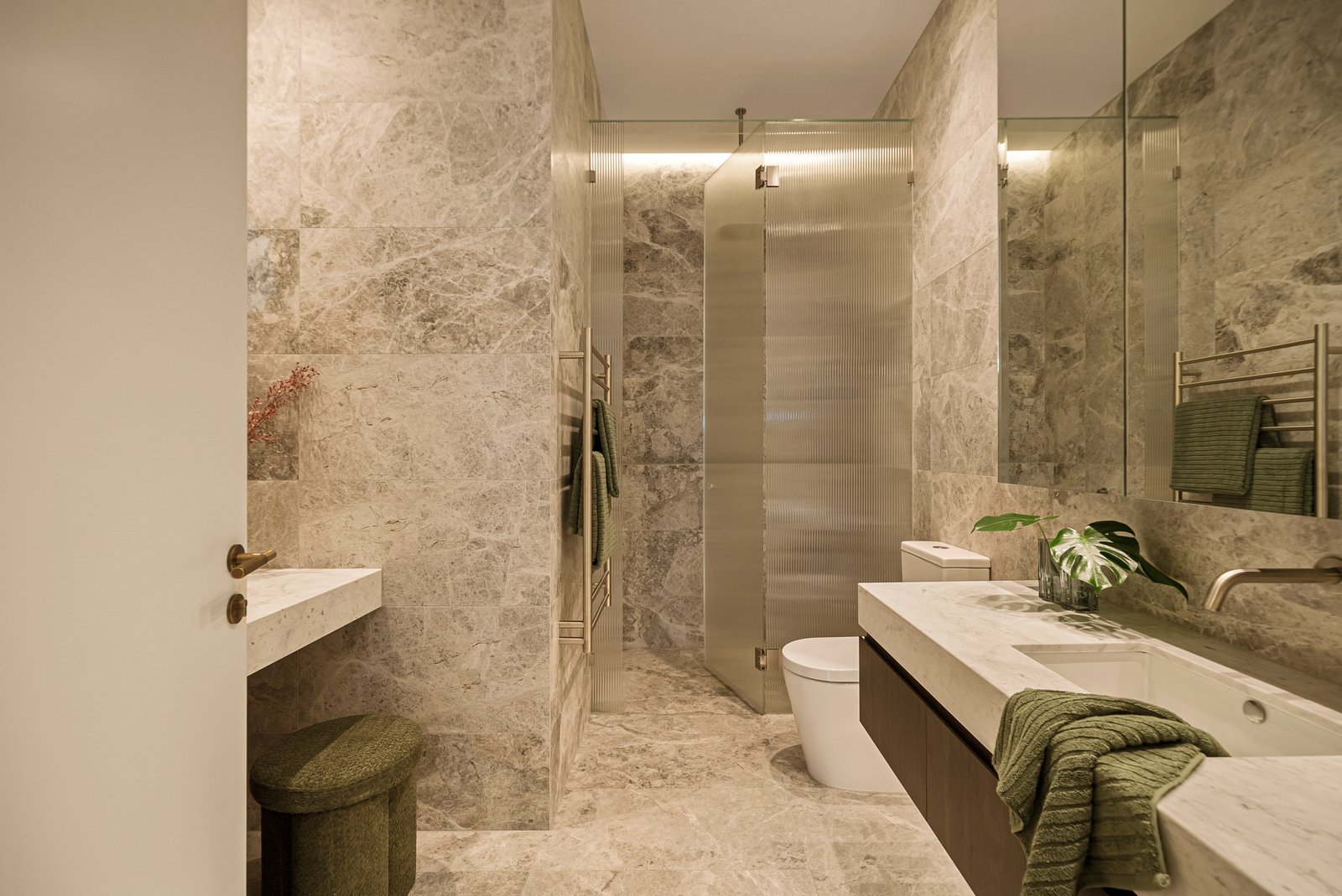 Curated with the finest natural stones and the widest French Oak wide-plank flooring, there are the tallest 2-Pac full-height doors, and the most velvety wool hand-tufted carpet. In this impeccable design, Carrara marble-topped vanities float in Tundra limestone-tiled bathrooms, motorised blinds backed Warwick sheer linen curtains, and About Space track-lighting shines beside Lucretia Lighting’s South American crystal pendants and alabaster wall lights. From Murowash textured paint finishes for the kitchen and living zone, to nickel and aged brass tapware and hardware (and even rangehood), to the Colefax and Fowler wallpaper and Carrara herringbone tiles of the powder-room, every detail is considered and crafted here.