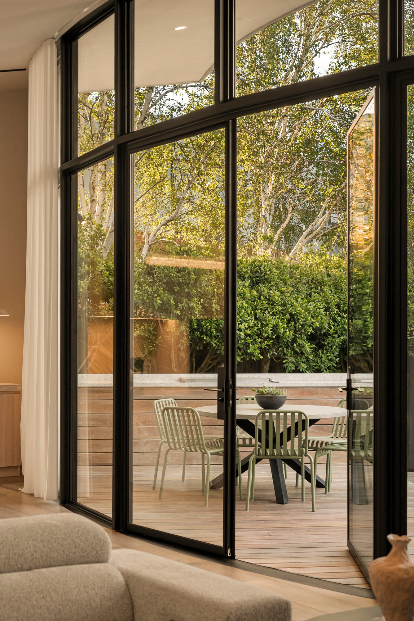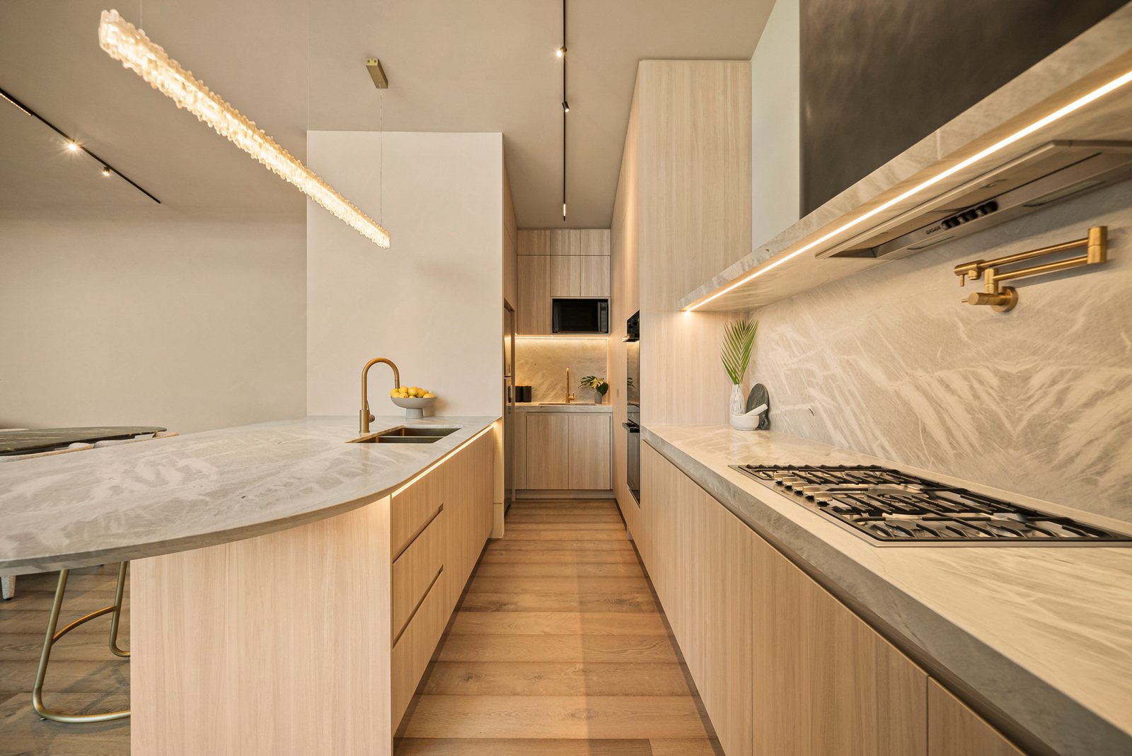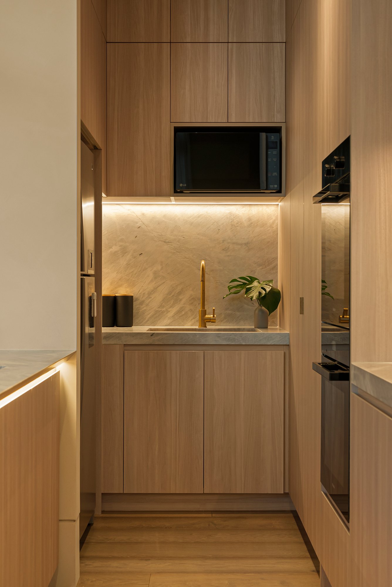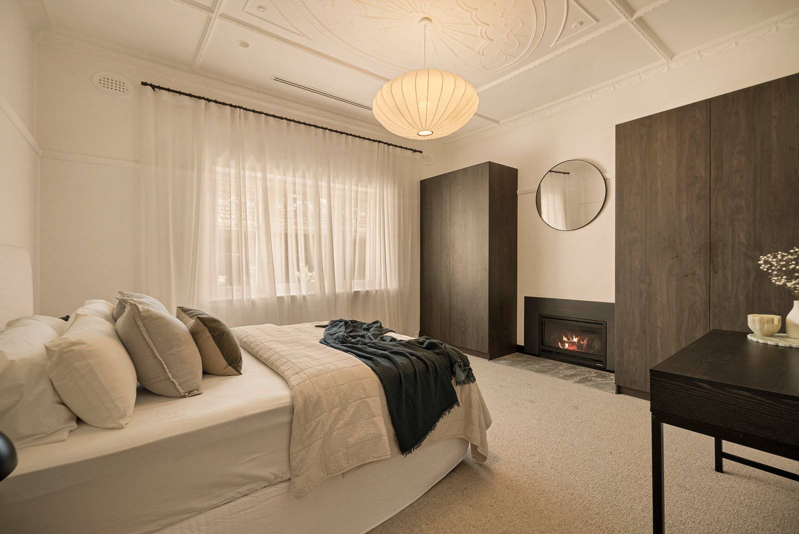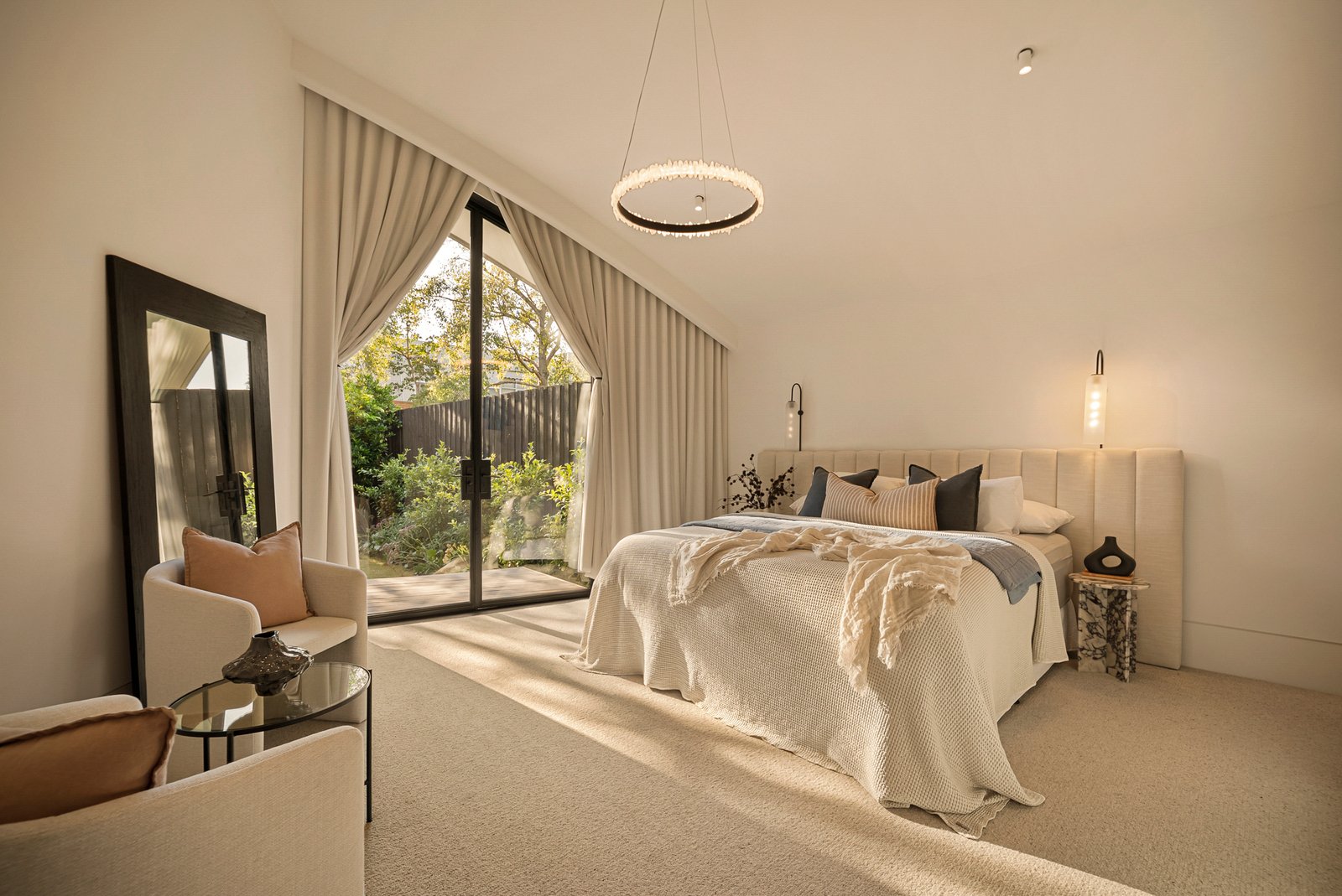 Curated with the finest natural stones and the widest French Oak wide-plank flooring, there are the tallest 2-Pac full-height doors, and the most velvety wool hand-tufted carpet. In this impeccable design, Carrara marble-topped vanities float in Tundra limestone-tiled bathrooms, motorised blinds backed Warwick sheer linen curtains, and About Space track-lighting shines beside Lucretia Lighting’s South American crystal pendants and alabaster wall lights. From Murowash textured paint finishes for the kitchen and living zone, to nickel and aged brass tapware and hardware (and even rangehood), to the Colefax and Fowler wallpaper and Carrara herringbone tiles of the powder-room, every detail is considered and crafted here.