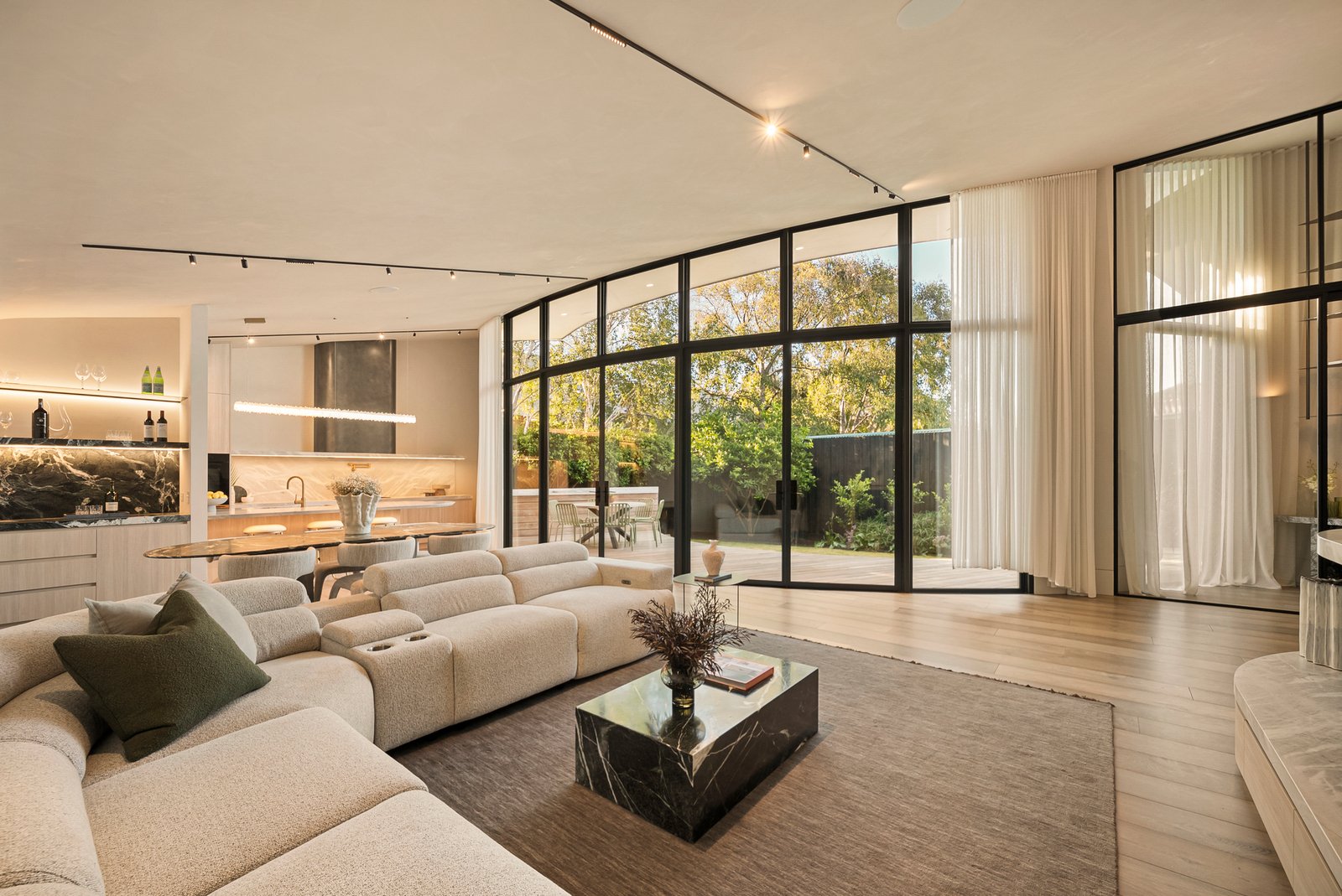 Designed for family harmony with a plushly-private master-suite inhabiting its own rear wing (while sharing a curvaceous portion of deck), there's work/life balance in an easily enclosed/easily supervised glass-walled curtained study (with sculptural hanging showcase-shelving)...and a seamless flow of entertaining from a cutting-edge Miele appliance kitchen with dual-ovens and butler's pantry area, to a Verde Green marble feature-bar, to a well-appointed BBQ area.