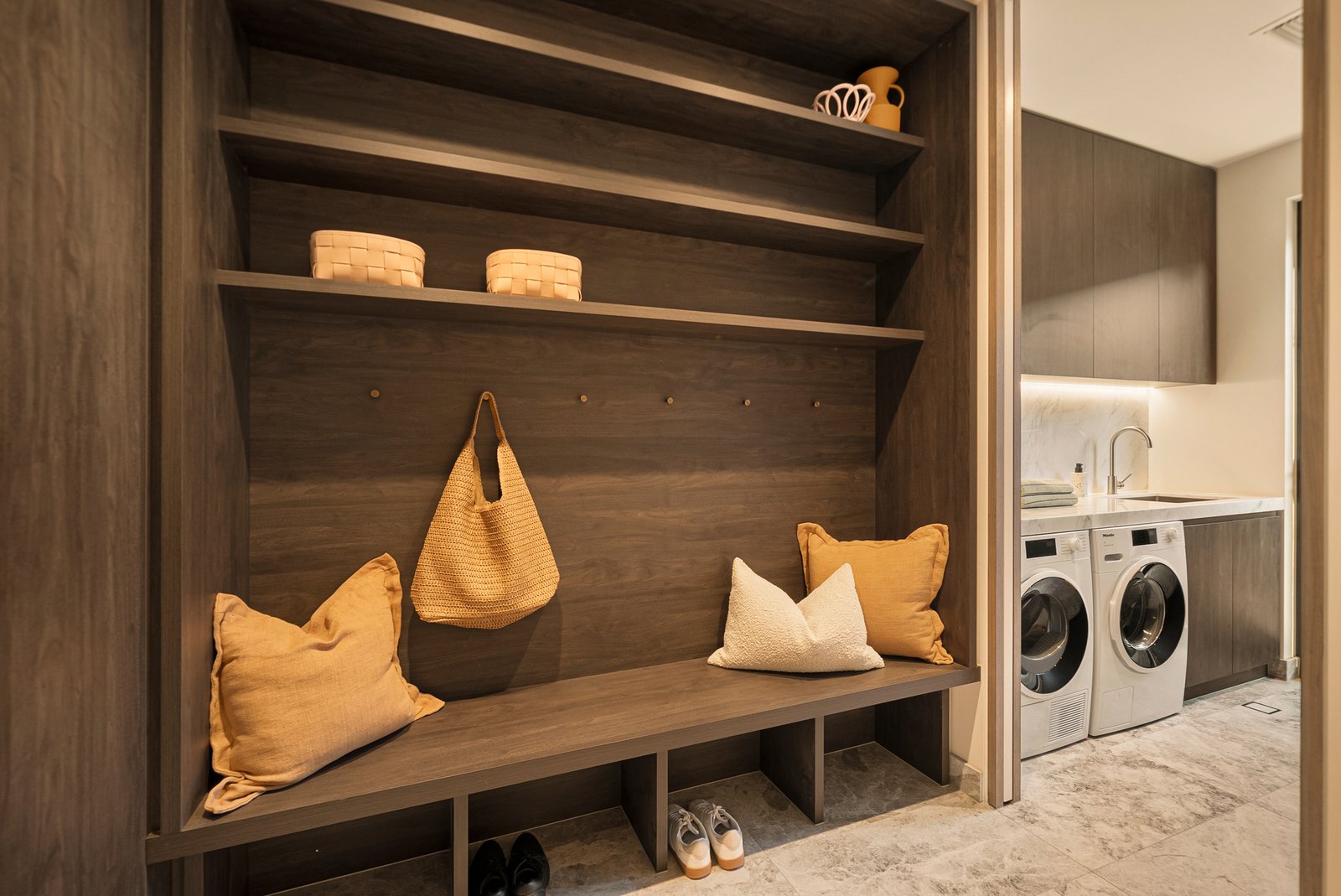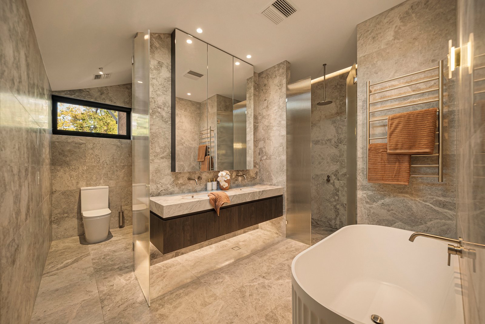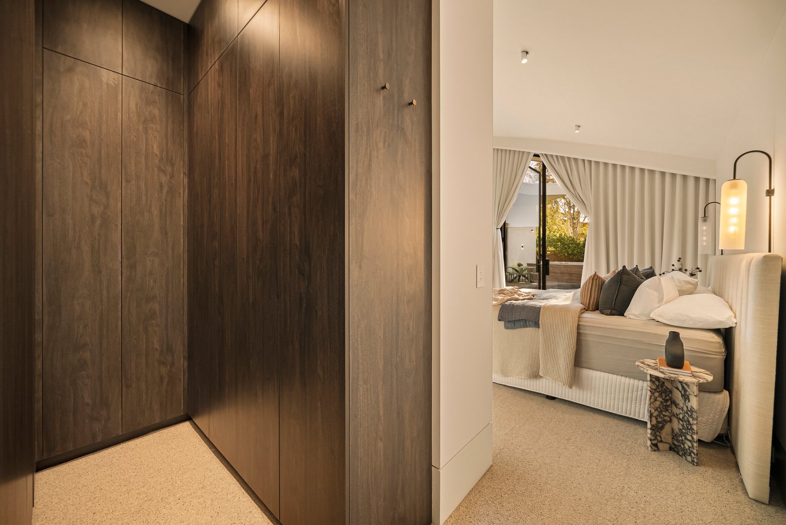 Even the outdoors are obsessively designed with Spotted Gum decking meeting Italian Travertine paving in an irrigated, spotlit landscape that includes a modern formal front yard, a north-facing entertainers’ garden, and a secret paved courtyard providing garage access via the laundry and mud-room).