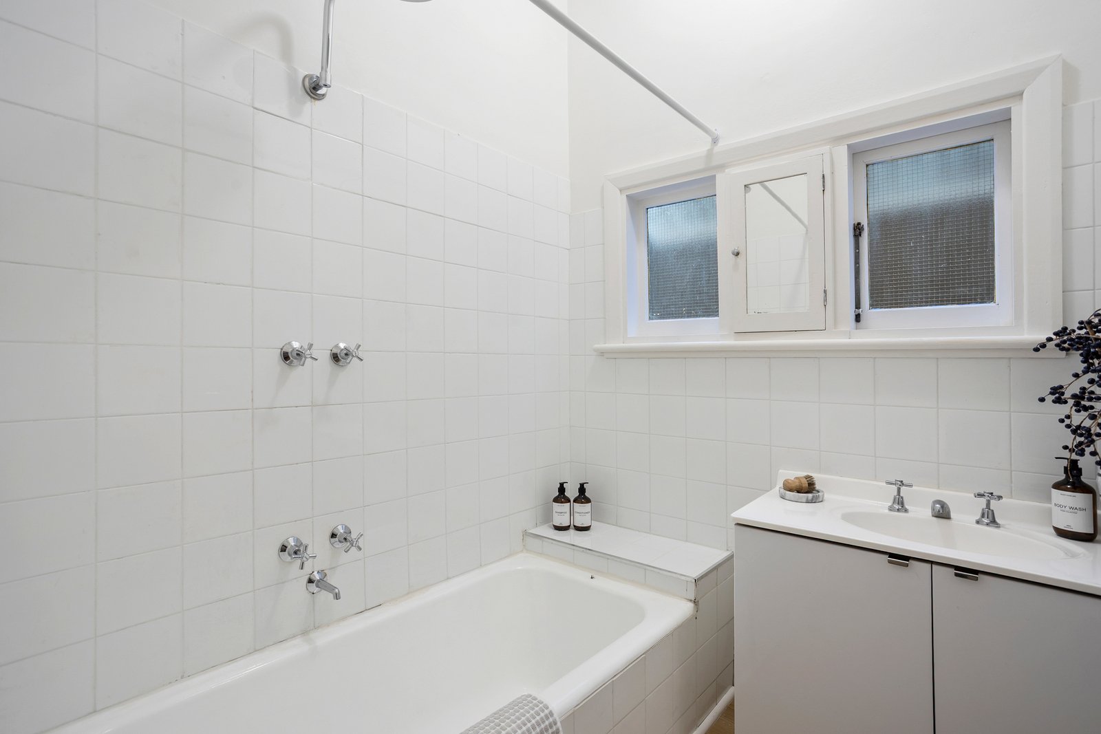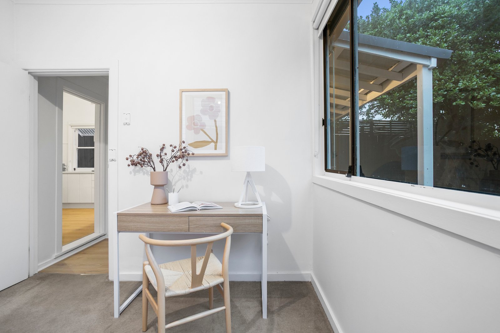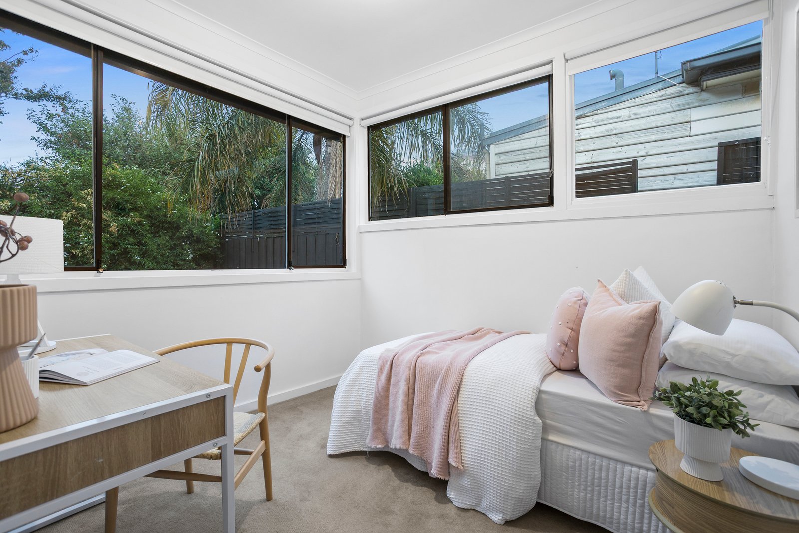 The oversized master bedroom is generously proportioned, complemented by two further bedrooms that offer flexibility for families, guests, or a home office. A central bathroom serves the home with quiet efficiency, while a substantial separate laundry with powder room adds the kind of everyday practicality that makes a real difference.