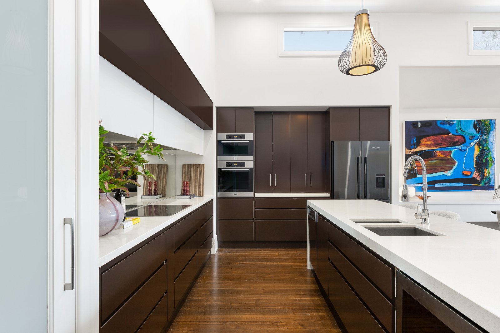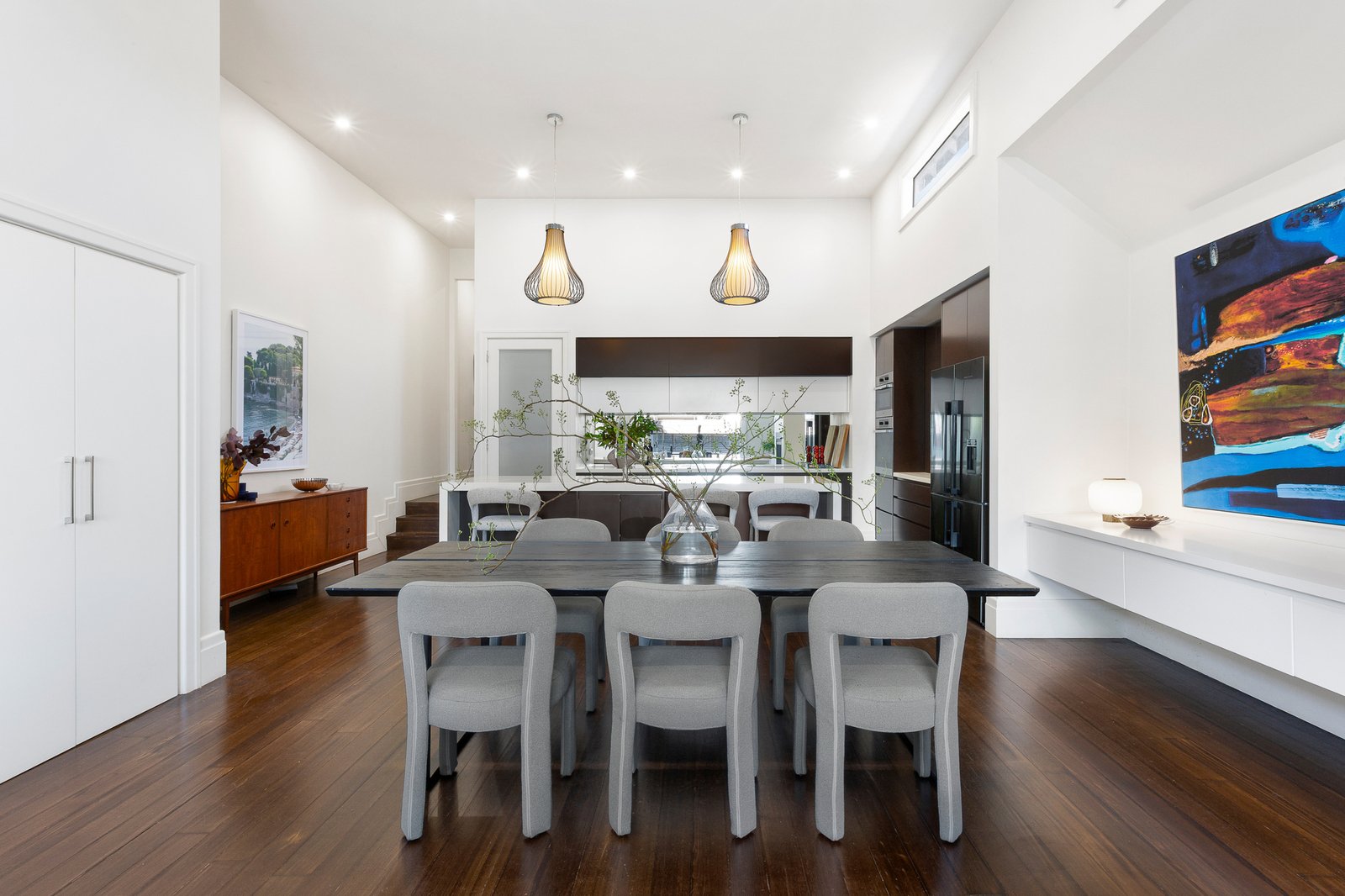 A home for all seasons featuring an inviting gas log fireplace for cosy nights, and long lunches through sunset soirees in the warmer months. At the heart of the spacious living and dining zone, a gourmet kitchen delivers exceptional functionality and style, appointed with premium Miele appliances including a combi oven, induction cooktop and dishwasher, a Vintec wine fridge, stone island and benchtops, and abundant custom storage. A concealed study nook and bespoke joinery enhances appeal.