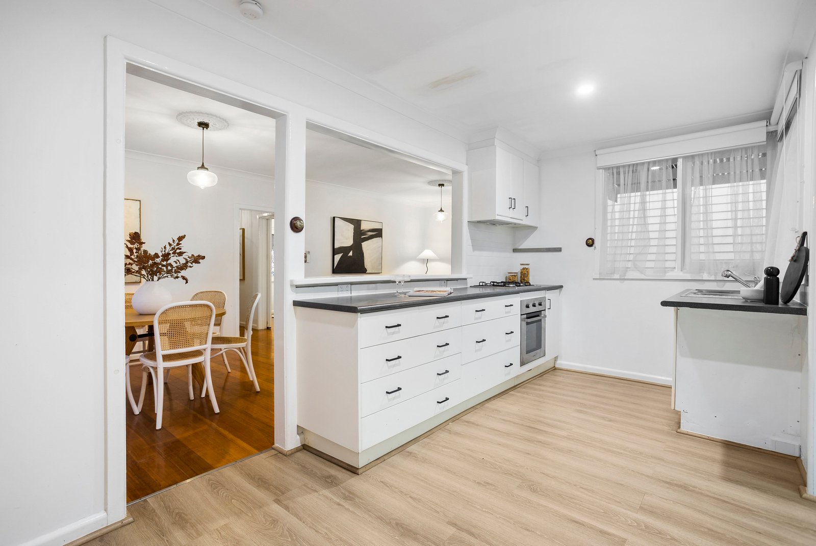 The open-plan living and dining area at the rear of the home is bathed in natural light, creating a relaxed and connected space for daily life. The contemporary kitchen, complete with stainless steel appliances, ample cabinetry and an open breakfast bar, flows seamlessly into the living area, making it effortless to cook, dine and entertain.