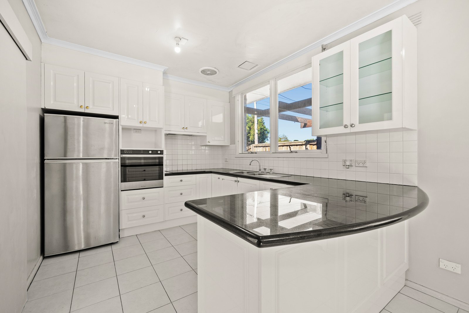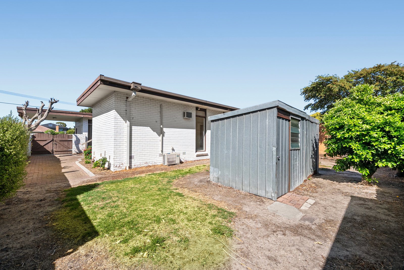 The semi-renovated kitchen is tiled and equipped with stainless steel appliances, a large bench, and ample storage, seamlessly connecting to the backyard with a handy shed—perfect for family living or further development. Adjacent to the kitchen is a functional laundry, which can be neatly shut off from the kitchen and dining areas by louvred doors. Three carpeted bedrooms include built-in robes, complementing the home’s timeless layout.
