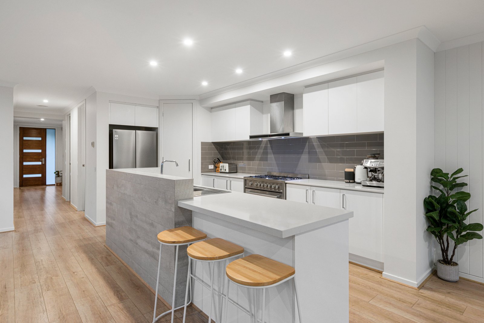 The fabulous alfresco zone, bathed in northern sunshine, complements interiors designed to capture streams of natural light. The open-plan entertaining area flows seamlessly into a well-equipped stone kitchen, while oversized sliding doors connect the indoors with the landscaped garden and sun-drenched deck overlooking the solar-heated pool.