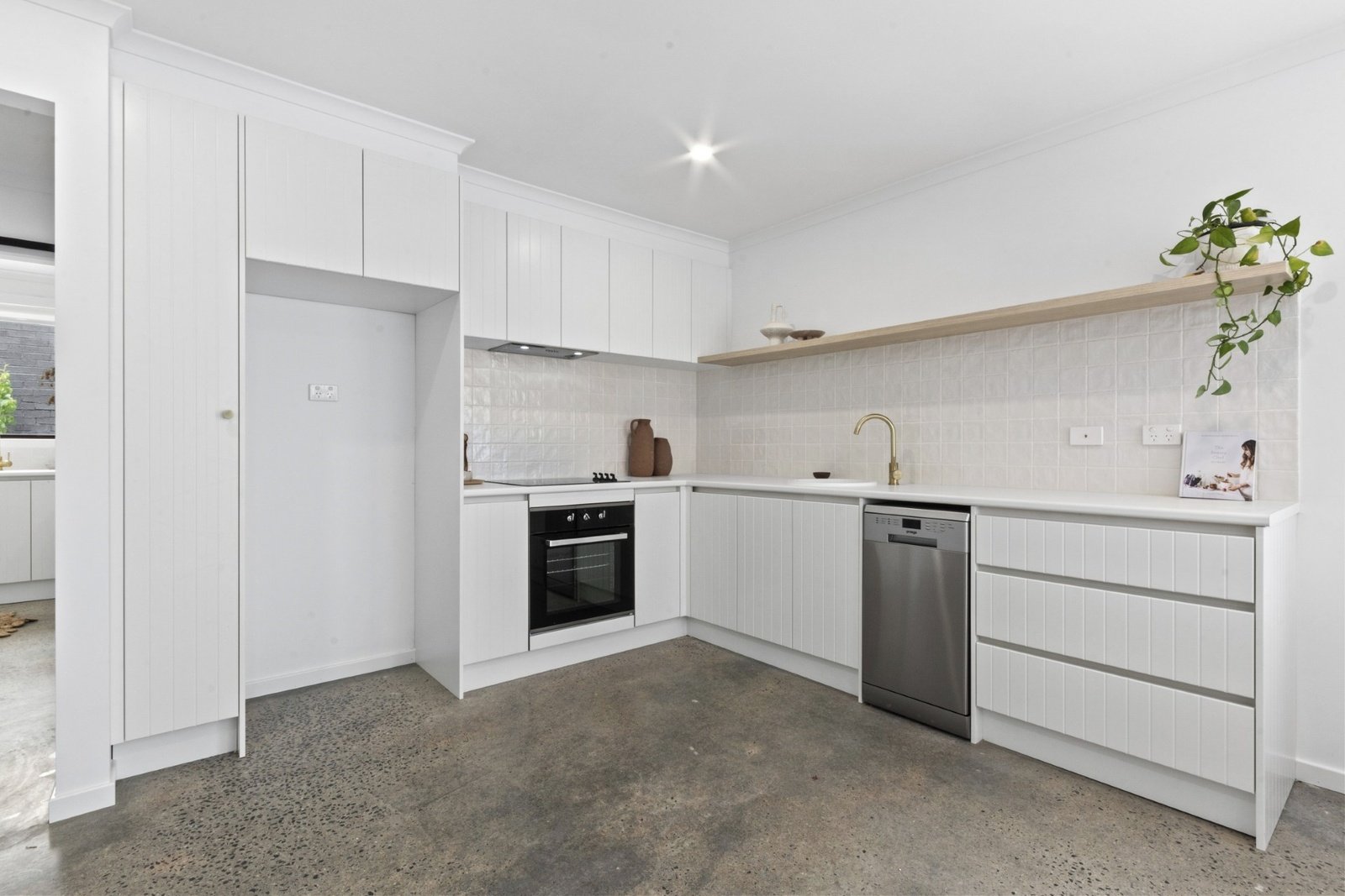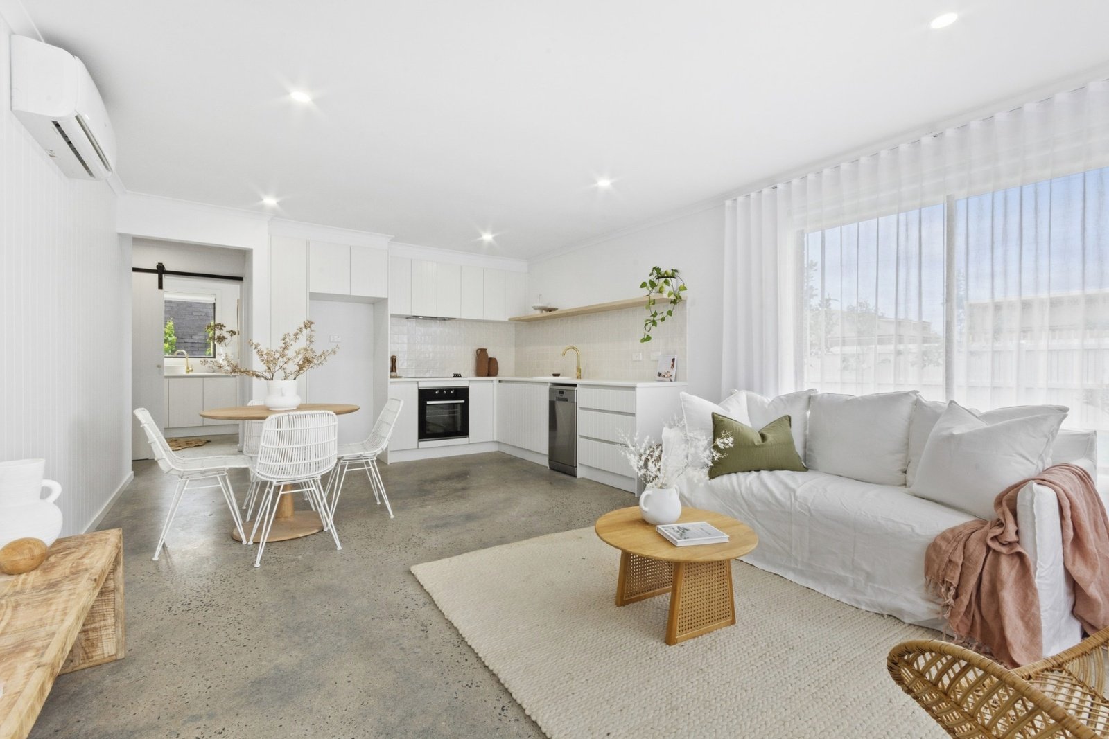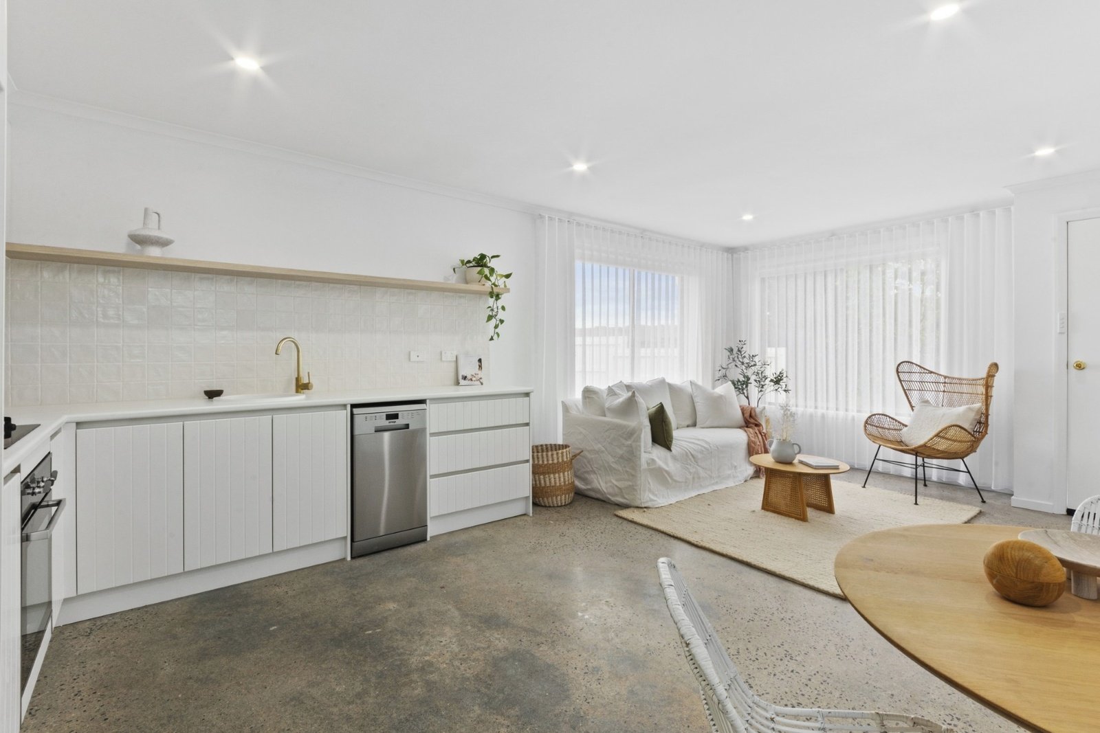 Polished concrete floors and crisp white walls enhance the on-trend interiors, with an abundance of northern light sweeping through the open plan living/dining/kitchen zone. The kitchen exudes style with beautiful cabinetry, brass...
