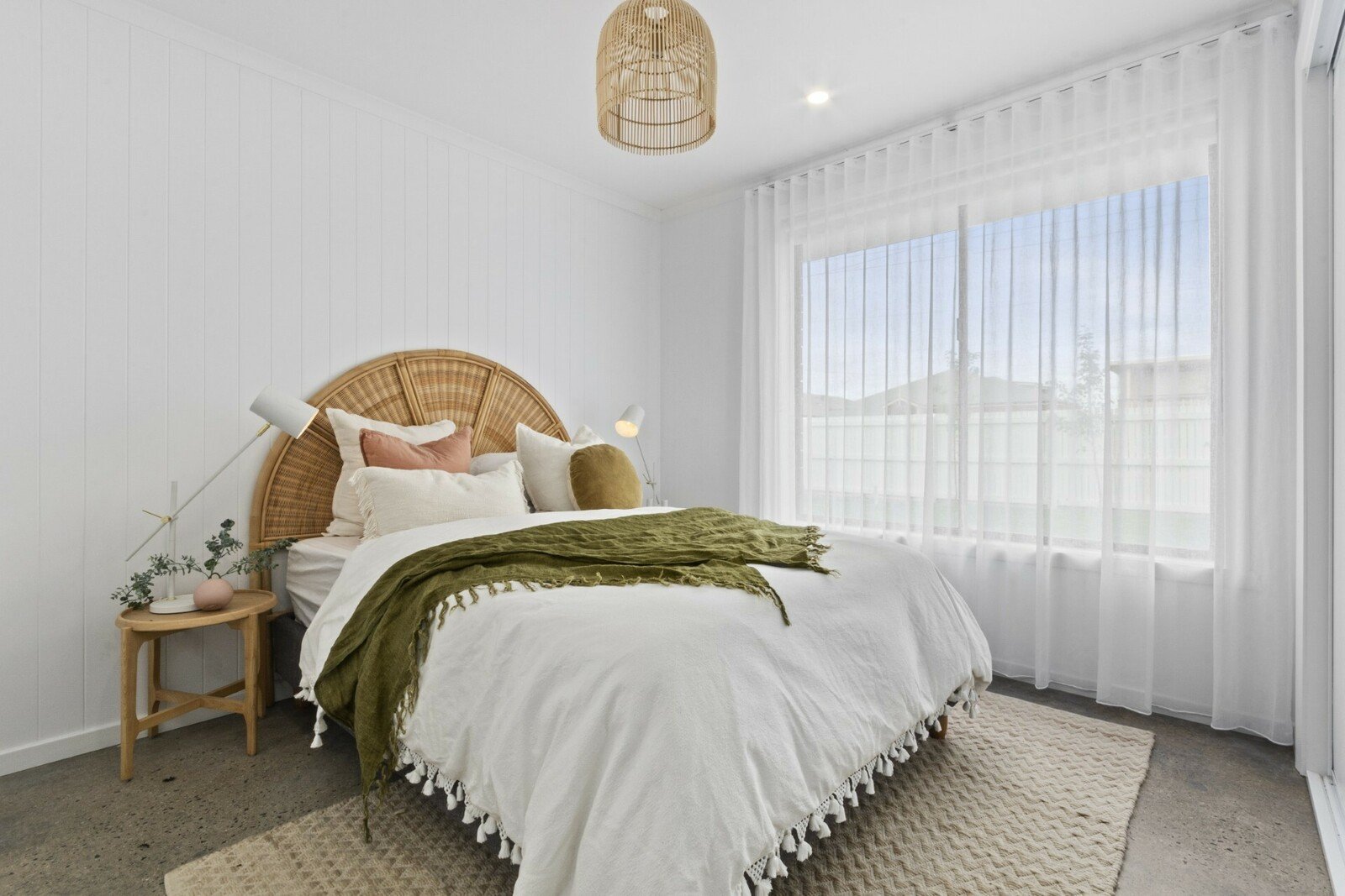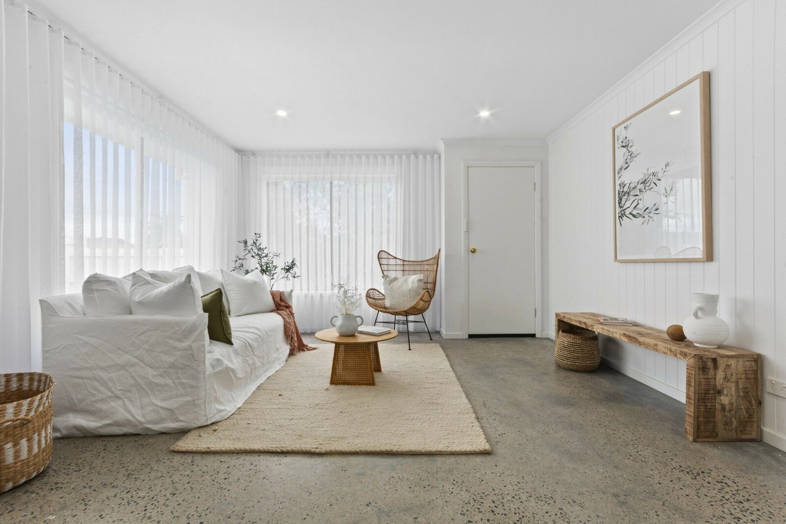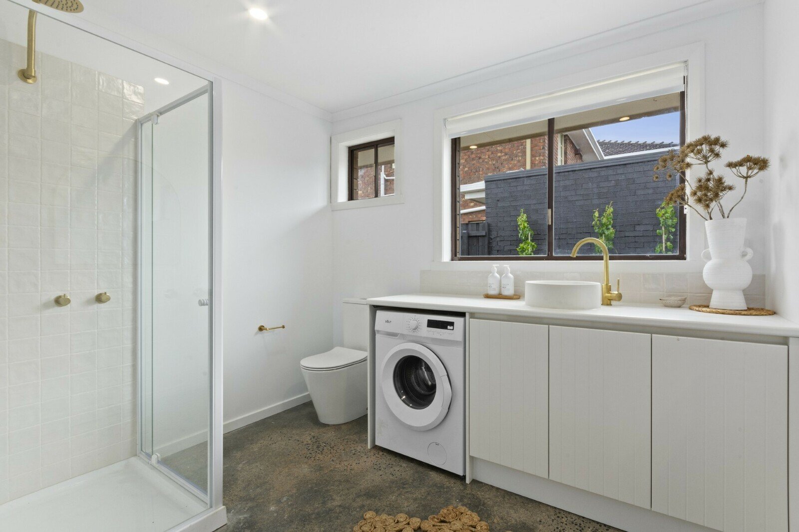 Polished concrete floors and crisp white walls enhance the on-trend interiors, with an abundance of northern light sweeping through the open plan living/dining/kitchen zone. The kitchen exudes style with beautiful cabinetry, brass...