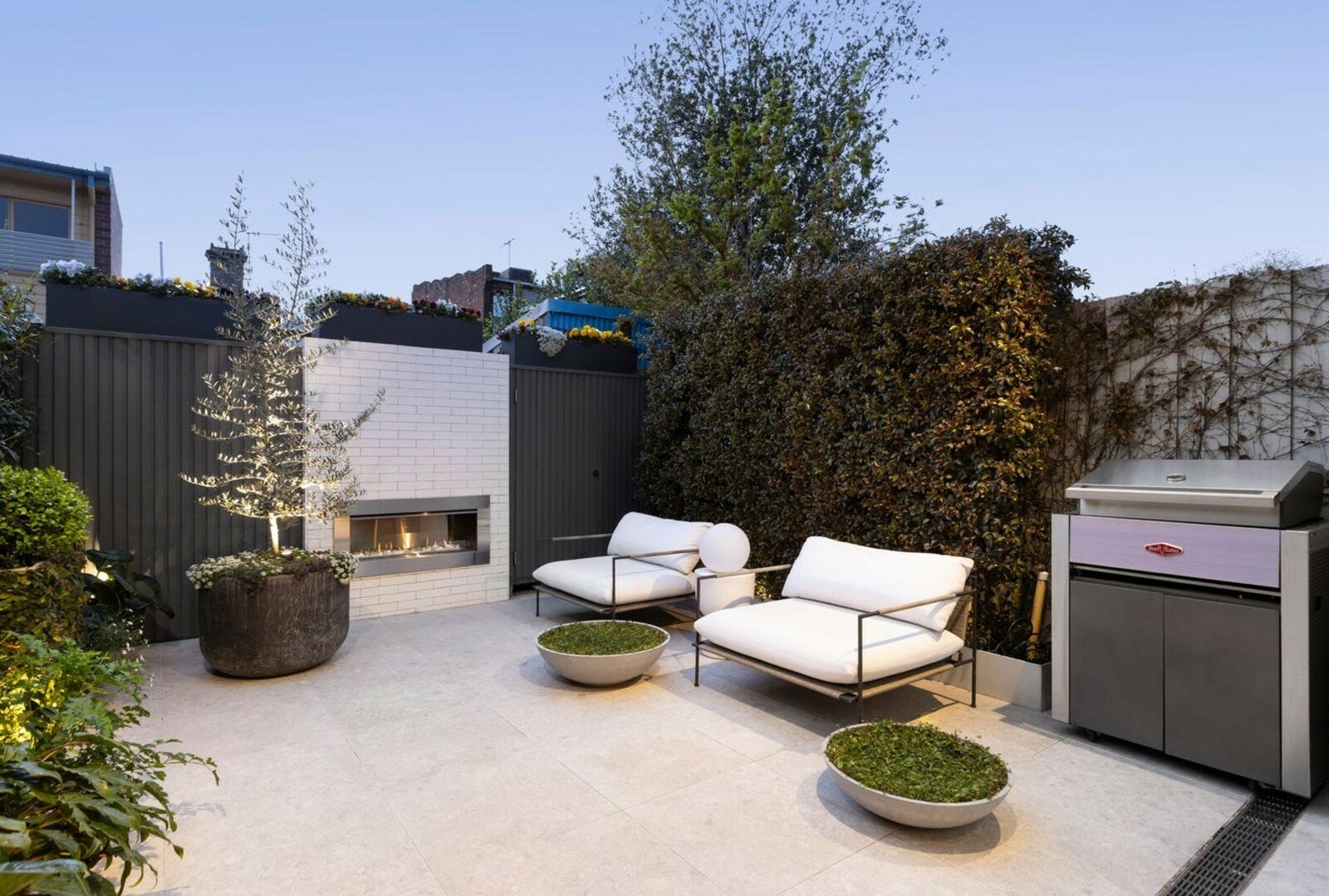 Sliding glass stacker doors open to a professionally landscaped courtyard, bathed in northern sunlight and enhanced by a feature gas fireplace - creating a private outdoor retreat for year-round enjoyment.