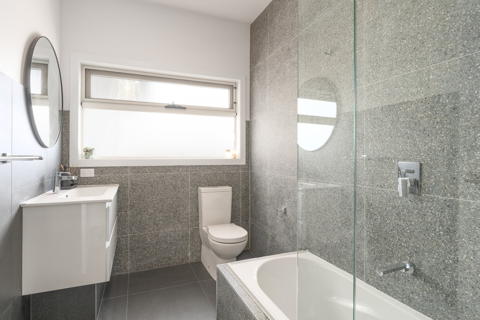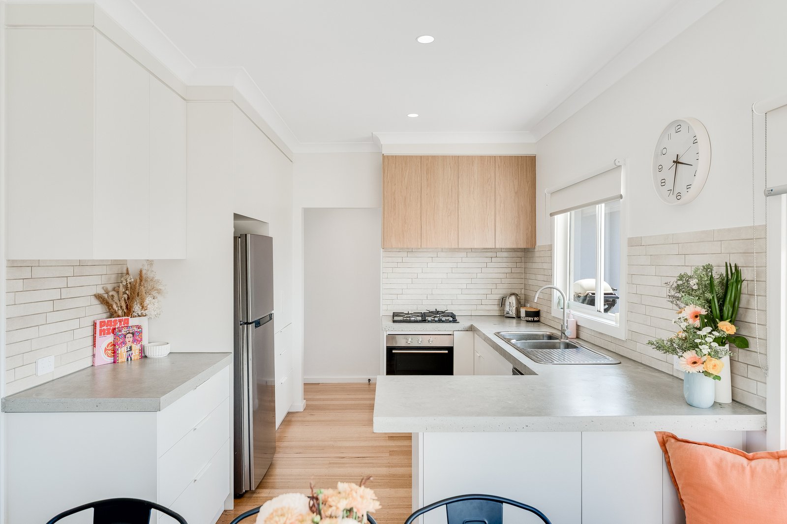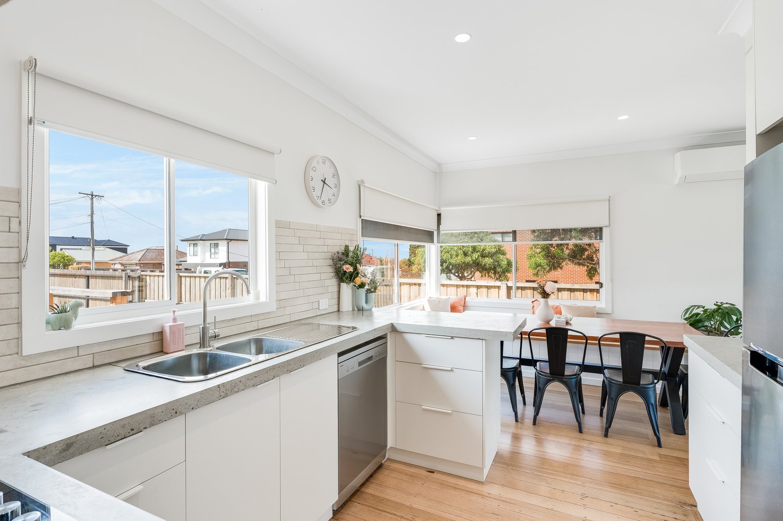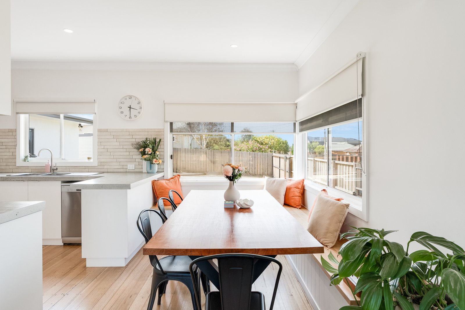 The kitchen and dining space have been cleverly designed for both functionality and style. A wraparound bench seat maximises dining space, while the kitchen offers exceptional storage and generous bench space. Custom concrete benchtops complement the soft-close cabinetry, and quality appliances including a four-burner gas cooktop and 600mm fan-forced oven make everyday cooking and entertaining a breeze.