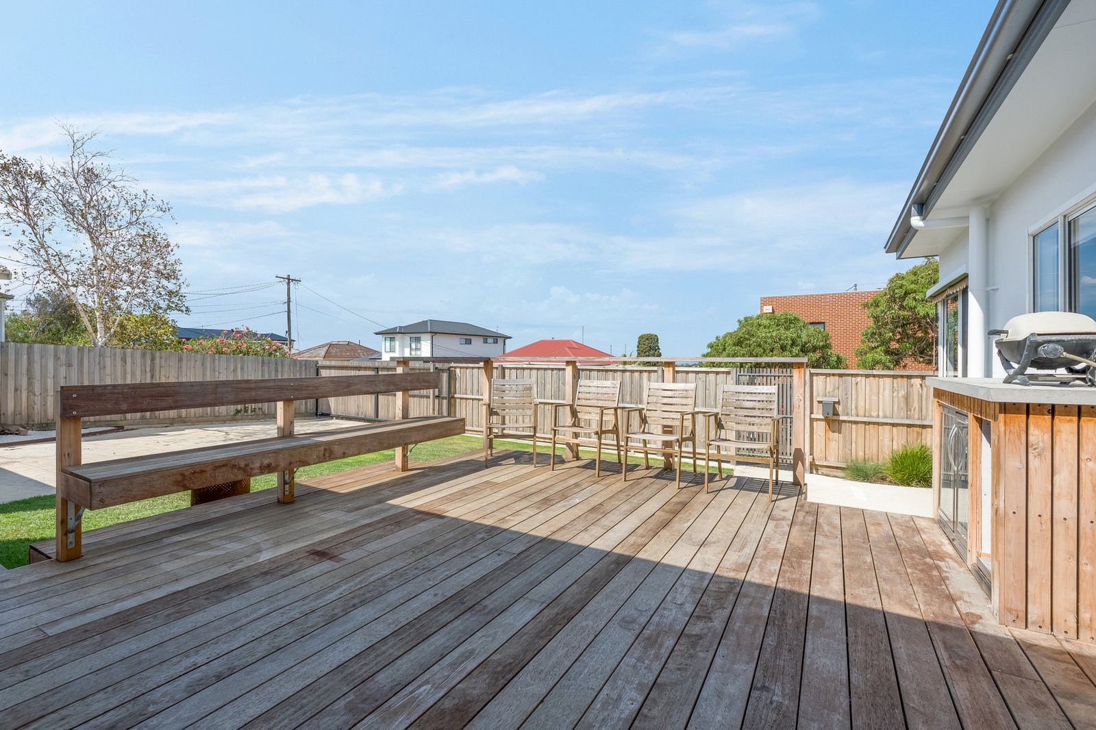 Outside, the home continues to impress. A large entertaining deck with built-in bench seating creates the perfect space for hosting friends and family, while additional seating at the rear of the deck provides a second relaxed area overlooking the lawn. Maximising the corner block position, an electric sliding gate provides secure off-street parking ideal for a car, caravan, boat or trailer.