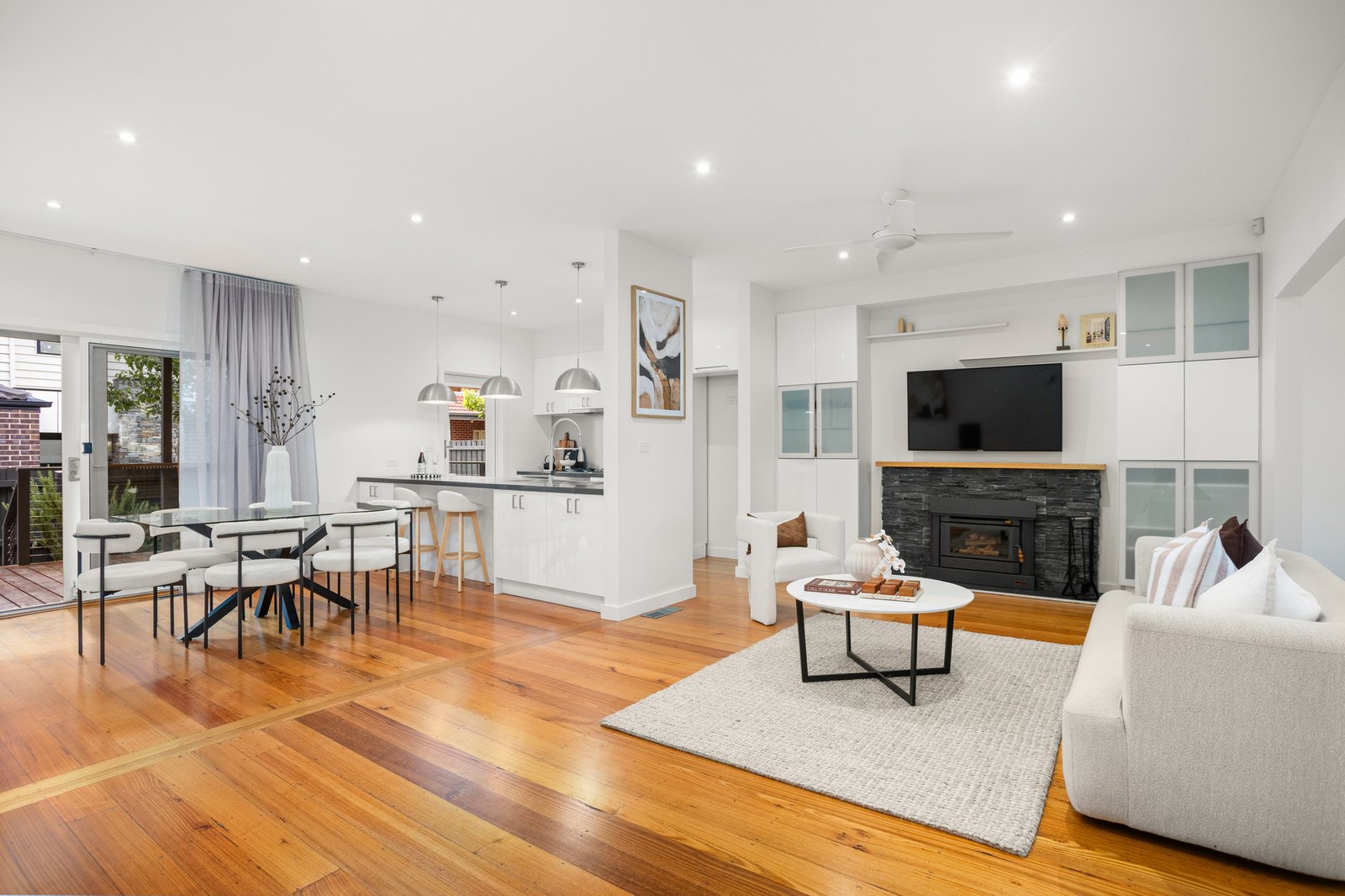 Warm timber floors flow throughout the expansive open-plan living and dining domain, where generous proportions create a welcoming space for everyday relaxation and entertaining. The contemporary kitchen is superbly appointed with stone benchtops, quality stainless steel appliances, excellent storage and a breakfast bar that connects seamlessly with the living zone. Sliding doors extend the space outdoors to a private deck – ideal for weekend BBQs, morning coffee or hosting friends all year round.