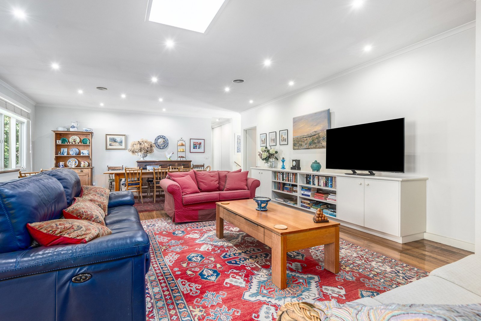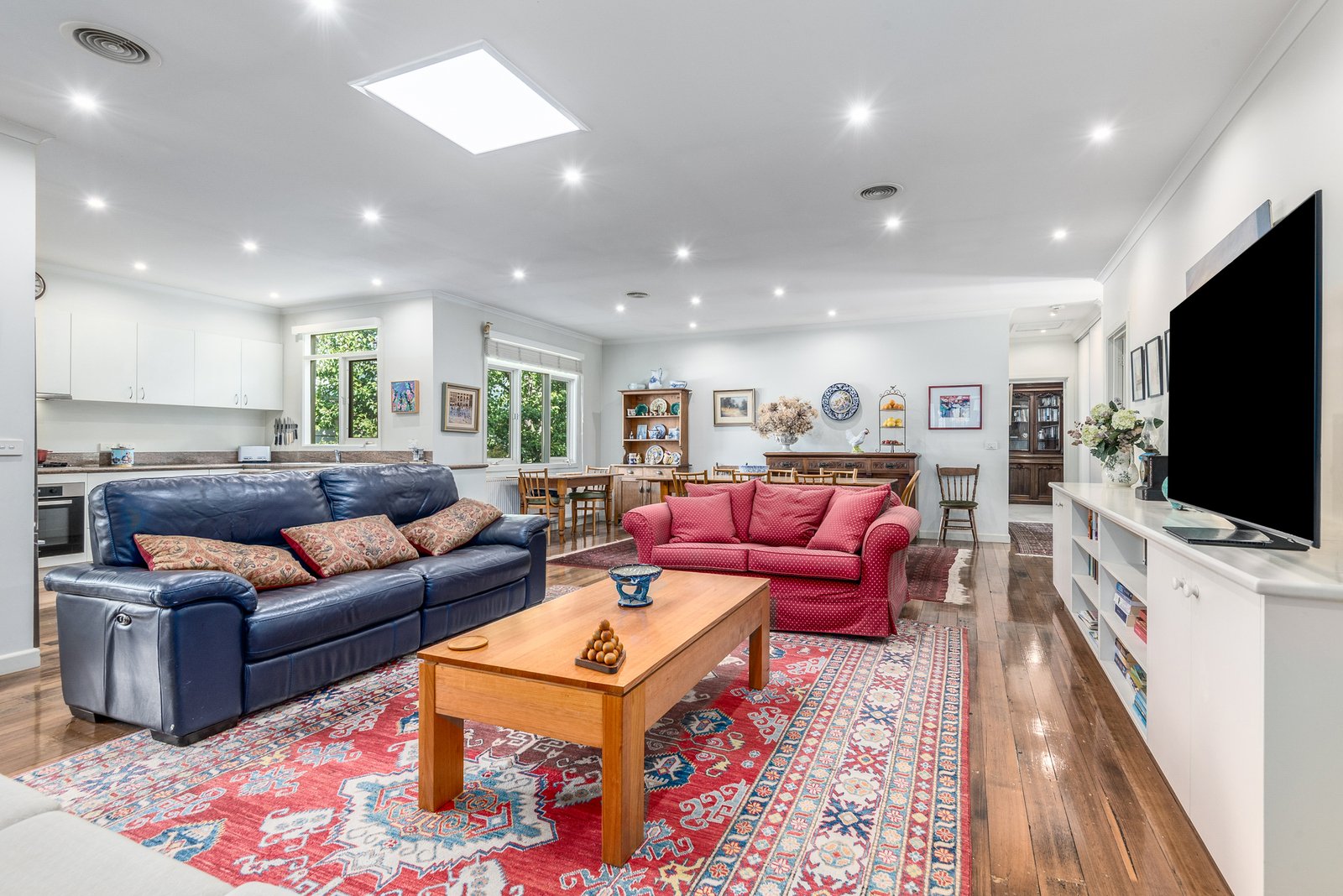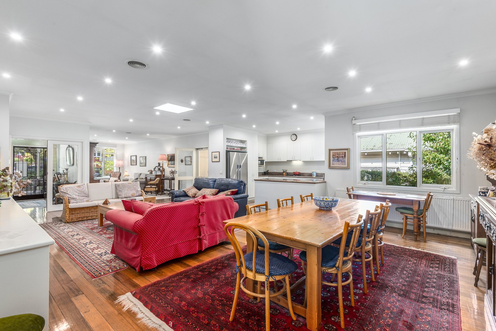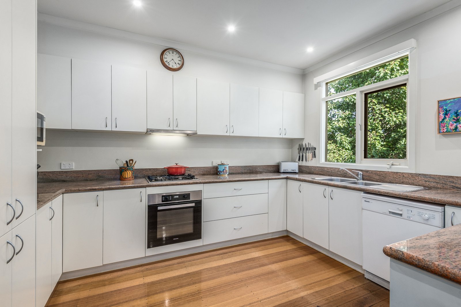 Inside a generous entry foyer leads into the heart of the home, revealing an expansive open-plan layout showcasing polished recycled timber floors, modern downlights, a skylight for warm natural light and ample dining space. The elegant kitchen is centrally positioned for easy everyday living and effortless entertaining, featuring granite benchtops and quality appliances including a Miele 600mm oven, Andi gas cooktop, and Miele dishwasher, with ample bench space and generous storage provisions.