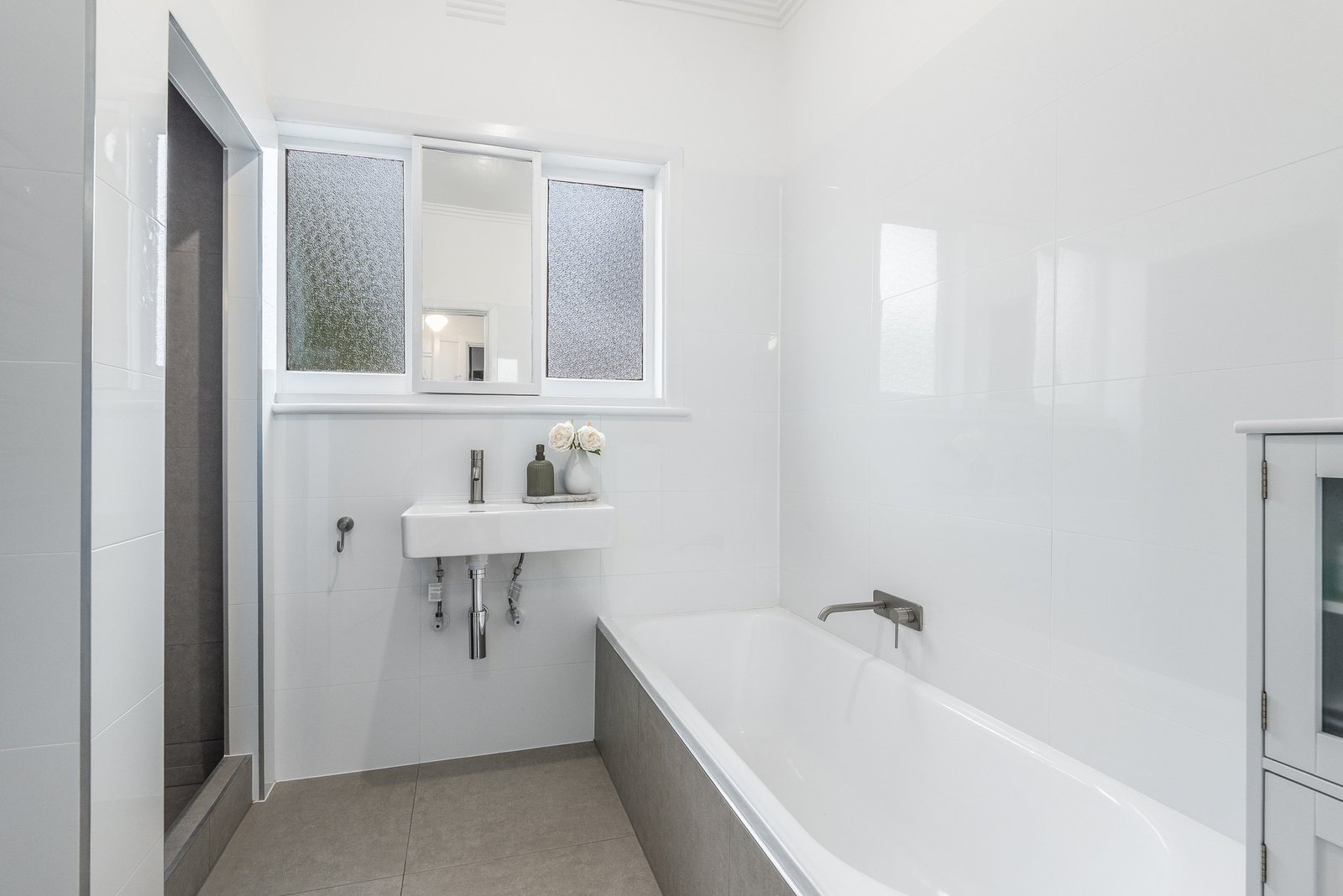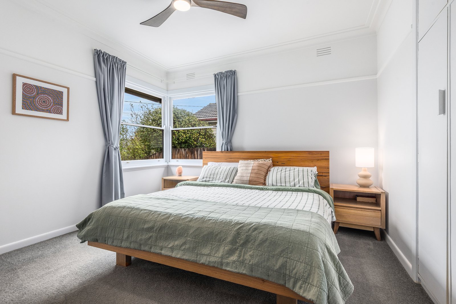 Comprising two generous bedrooms, both include ceiling fans and built-in robes, serviced by an updated central bathroom presented in modern finishes, with a bath, separate shower, and heated towel rail. To the rear, a well-appointed laundry and separate wc caters for fantastic functionality.