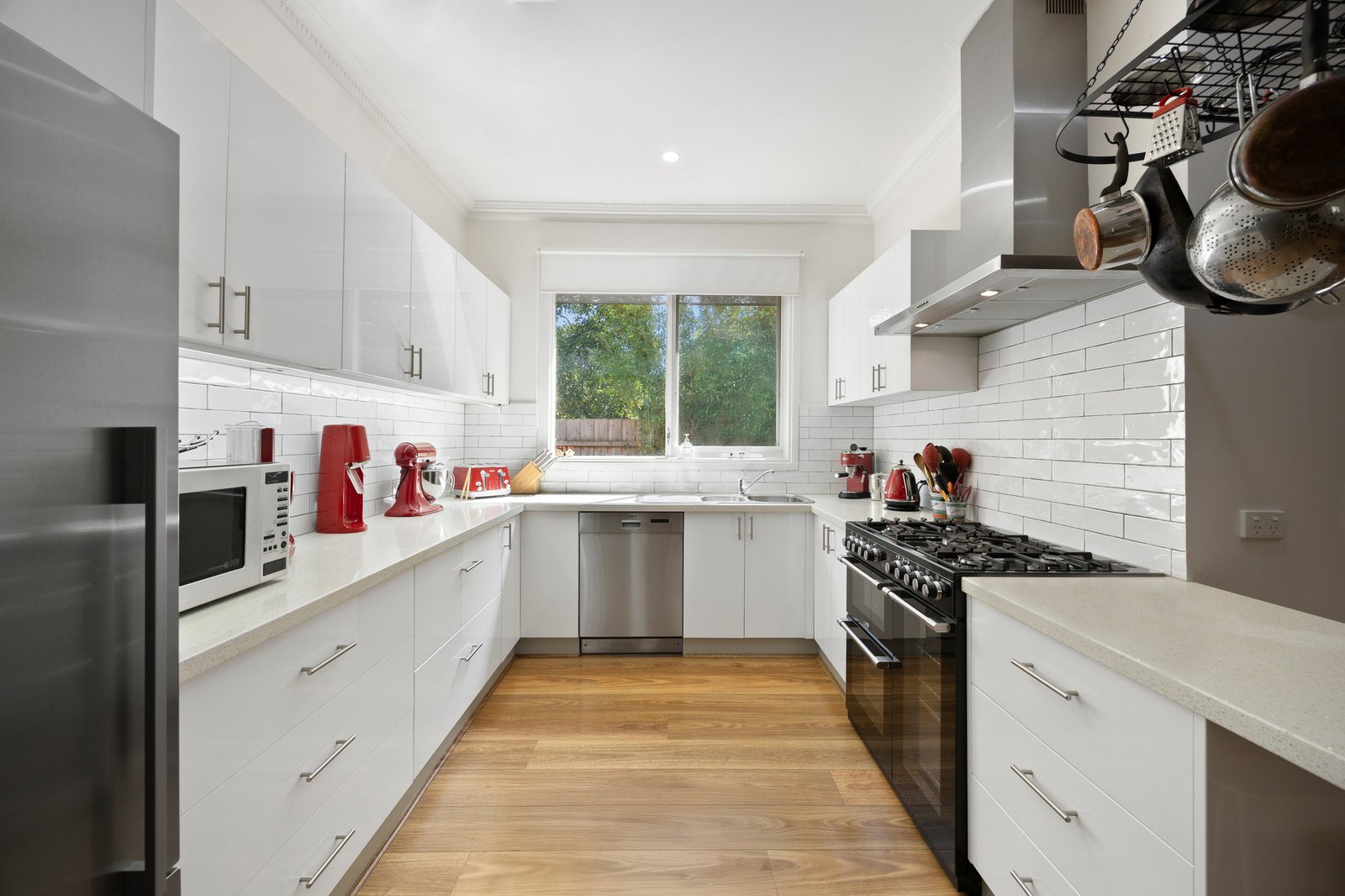 Entertainers will love the modern kitchen which features stone benchtops and a glorious black Belling range oven to welcome guests inside before heading out to a sheltered alfresco deck that spills to the very generous garden.