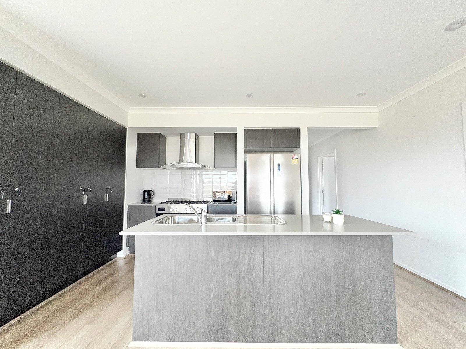 - A central common area including kitchen, dining and living area