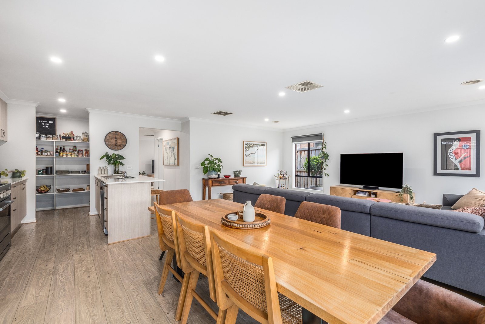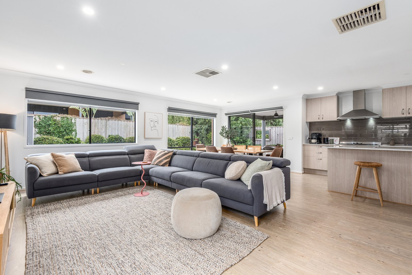 The first of two living areas is positioned at the heart of the home, offering a quiet space to retreat, watch a movie, or send the kids to play. The rear opens up to a light-filled open plan layout connecting with the alfresco for effortless indoor-outdoor living and entertaining. The quality kitchen features stone benchtops, stainless steel appliances including a 900mm oven and cooktop, rangehood, dishwasher, classic subway tile splashback, and a large walk-in pantry.