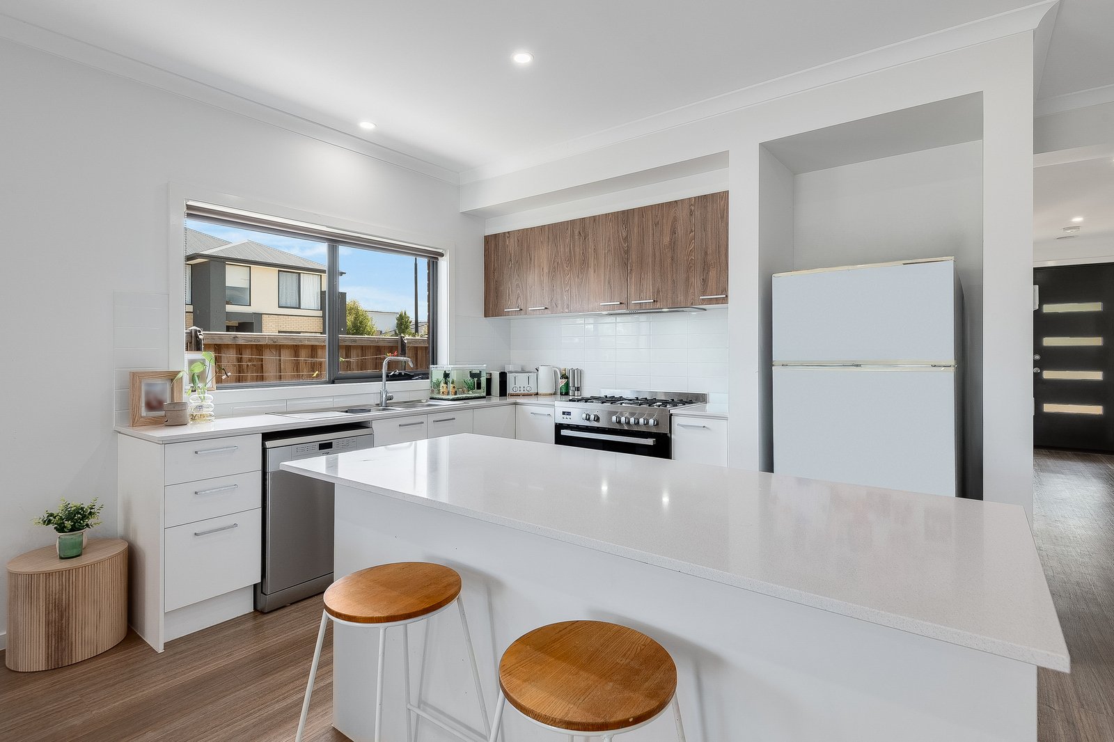 The main living area offers a light-filled open plan layout with connecting access to the alfresco for seamless indoor-outdoor entertaining. The quality kitchen features stone benchtops, a 900mm oven and cooktop, dishwasher, sleek cabinetry, and generous storage with a large walk-in pantry.