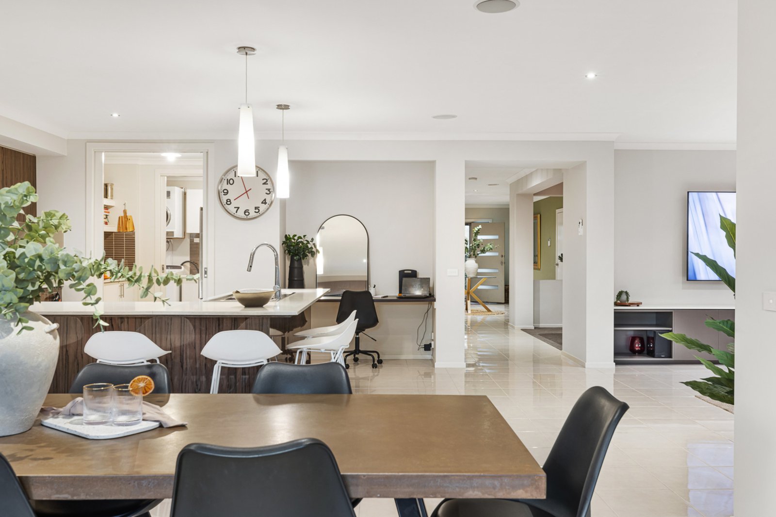 The heart of the home seamlessly connects indoor and outdoor living, with expansive windows capturing beautiful views across the waterways and filling the interiors with natural light. Spacious proportions and quality finishes throughout create a warm yet refined atmosphere that truly feels like home.