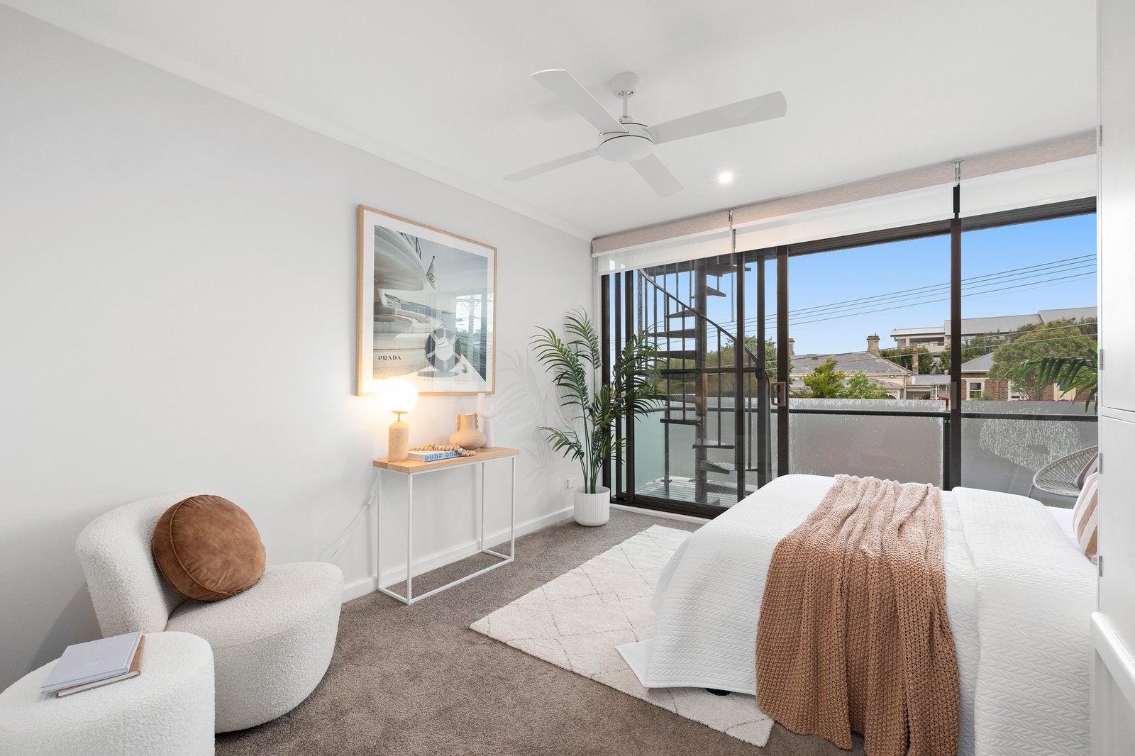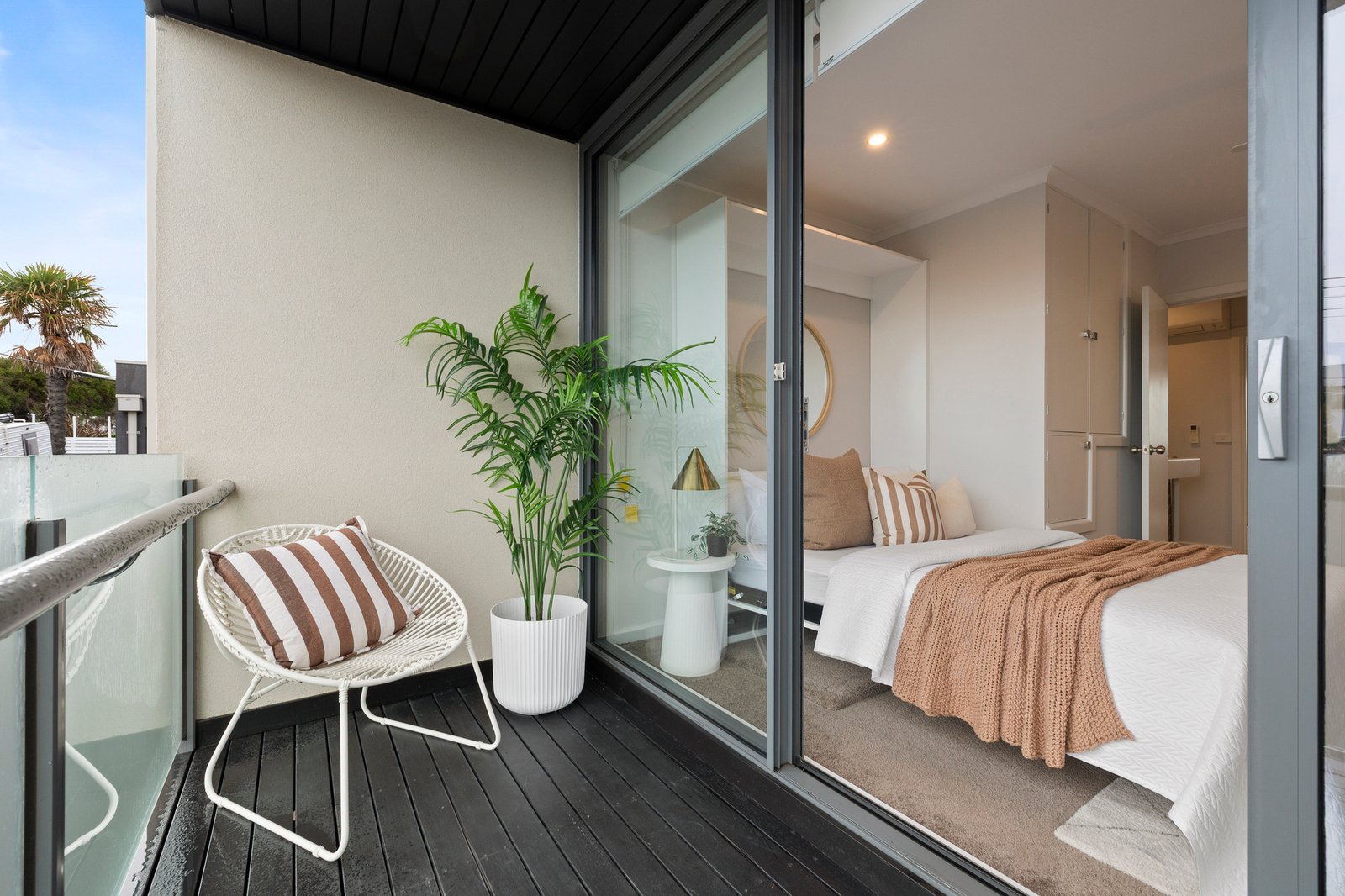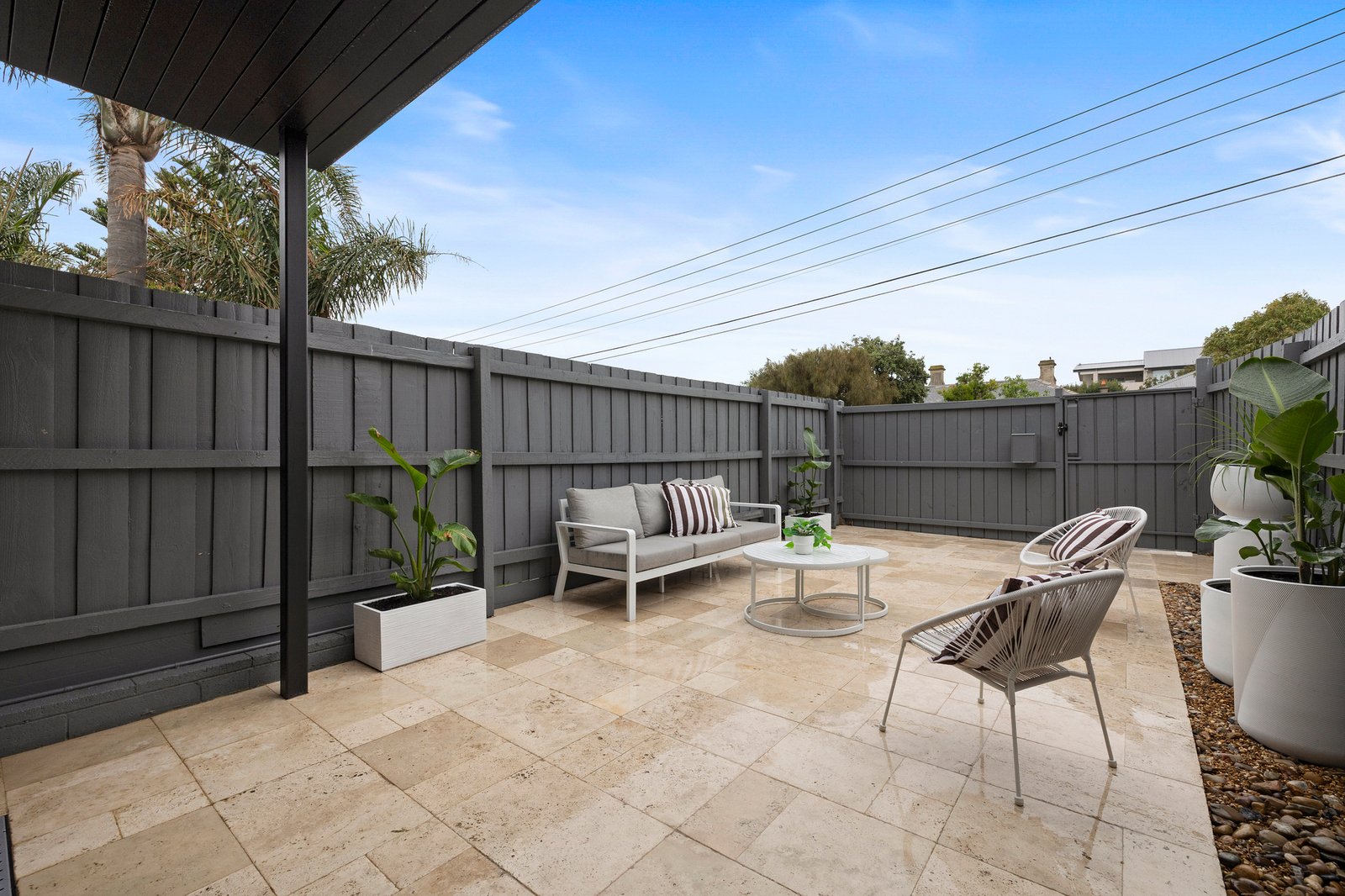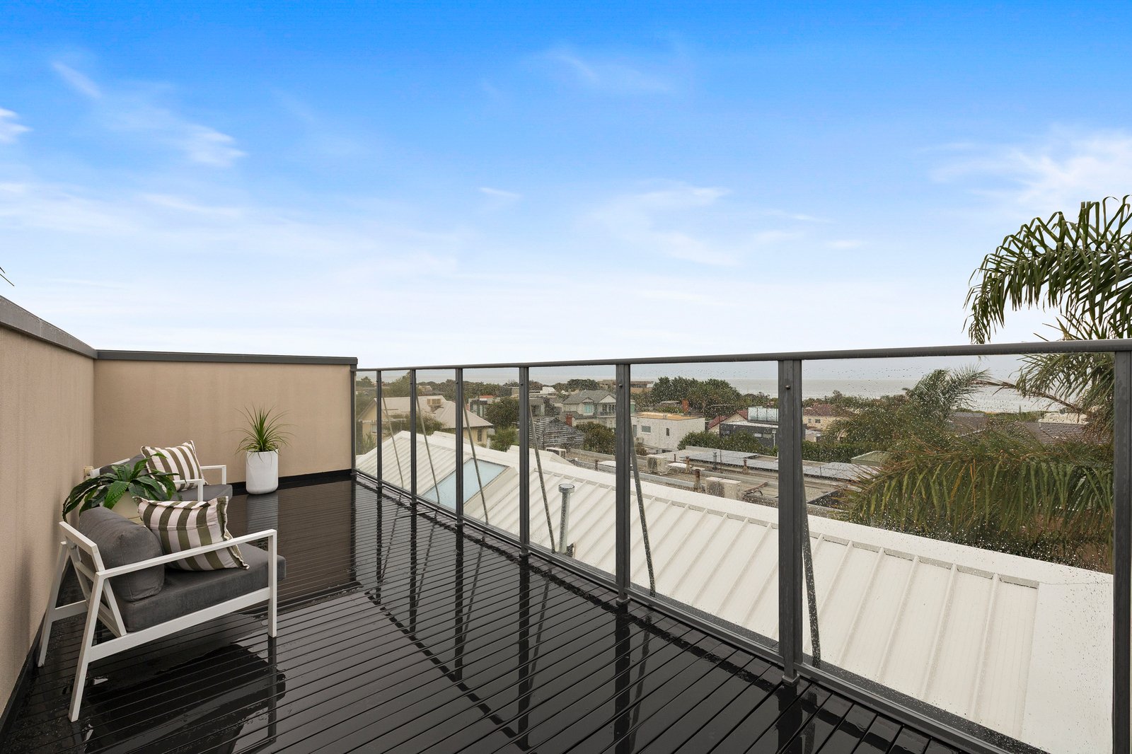 At the rear, a separate laundry and powder room add everyday convenience, opening to a private back gate and courtyard with handy storage. Upstairs, two generous bedrooms provide peaceful retreats — one with sliding built-in robes, and the second with ample cupboard space and a beautiful balcony that leads directly up to the rooftop terrace, a stunning spot for entertaining or soaking in the sparkling bay views.
