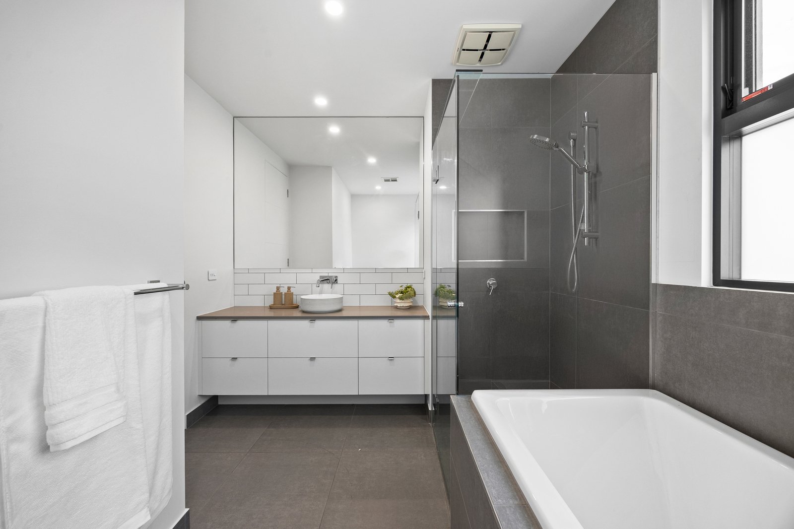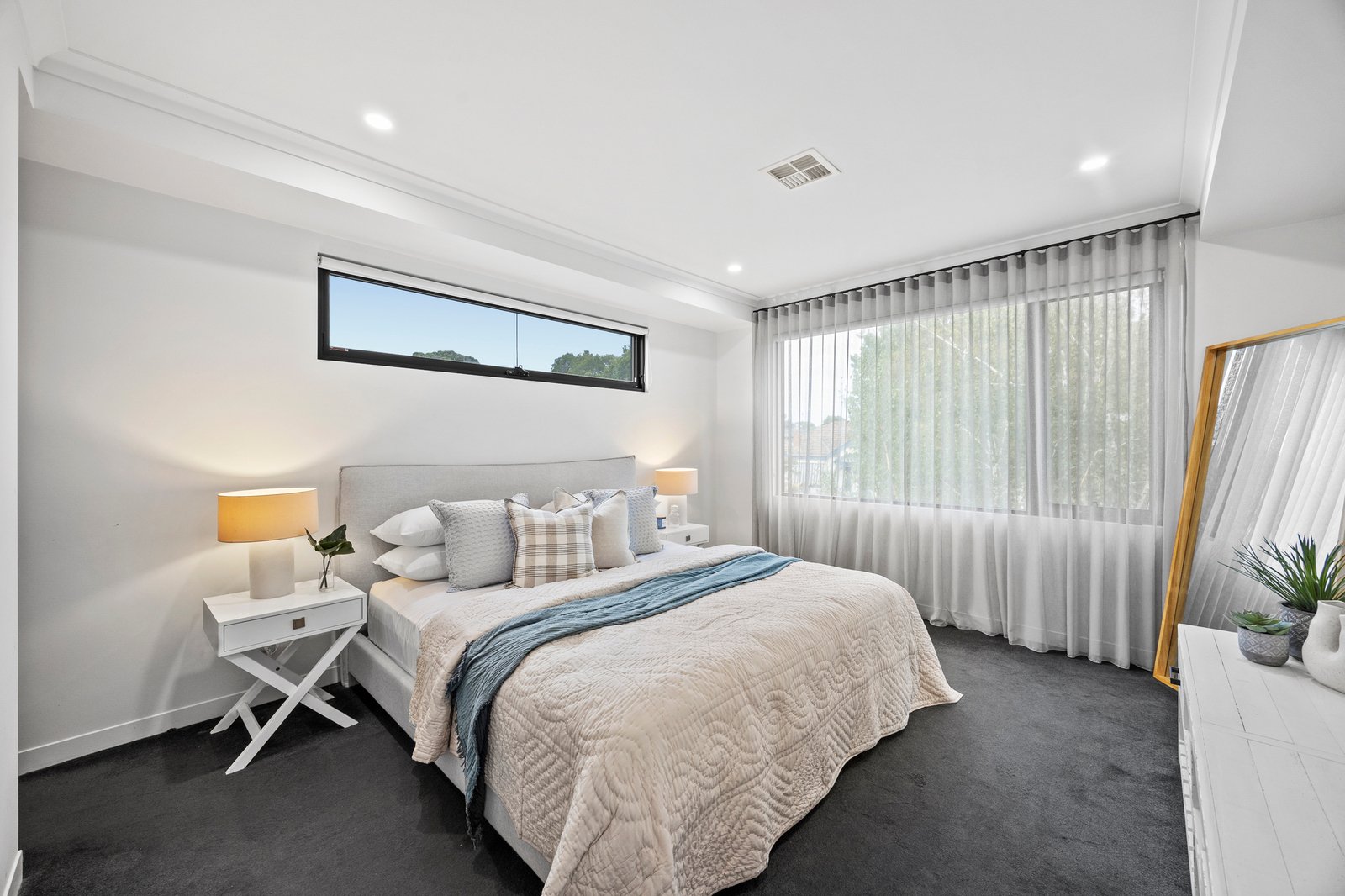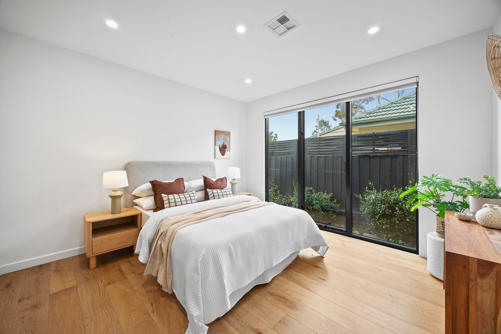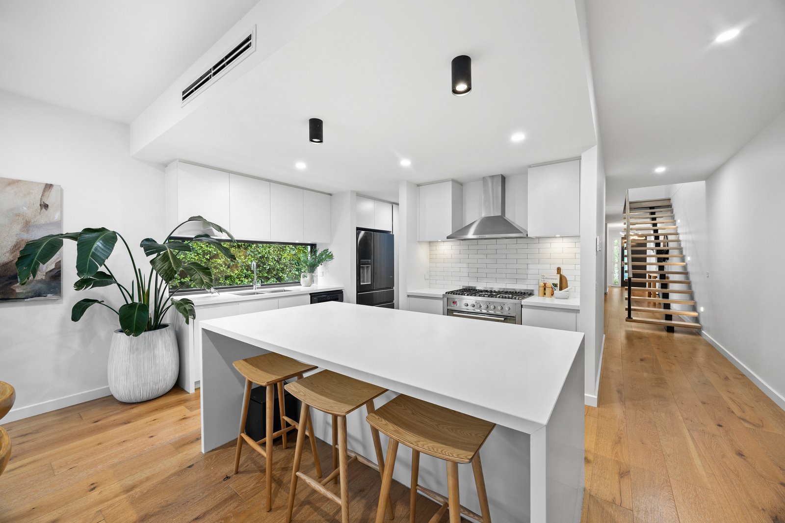 Accommodation is intelligently zoned for flexibility. Upstairs, the generous main bedroom features a walk-through robe, luxe ensuite and picture window with treetop views, accompanied by two additional bedrooms with built-in robes, a central retreat and a sleek family bathroom. A ground-floor bedroom with fitted wardrobes and leafy aspects adds versatility to the floorplan.