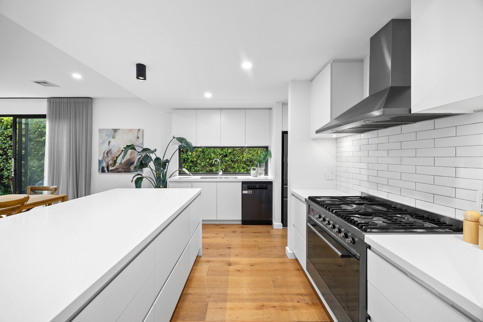 A streamlined stone kitchen with crisp white cabinetry, subway-tile splashback and quality Ilve appliances, including a 5-burner freestanding cooker, forms an efficient centrepiece. An island bench invites informal gathering, while a storage-rich walk-in pantry supports practical family living with ease.
