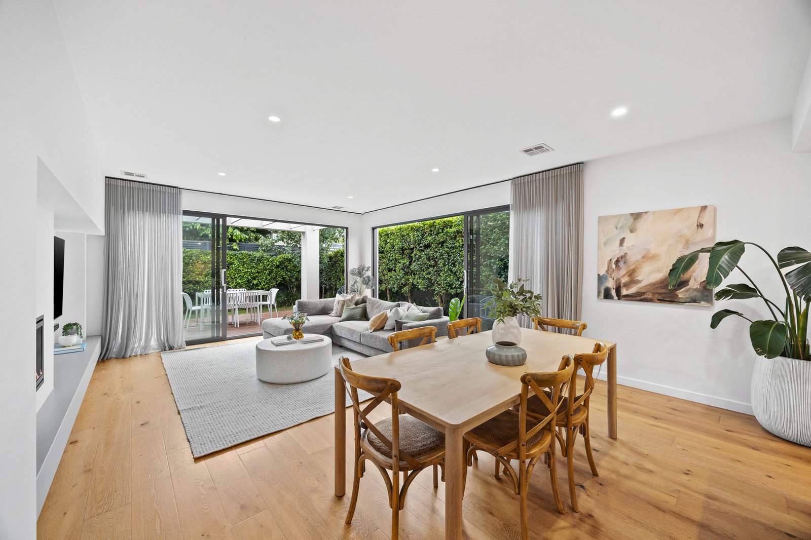 Engineered oak floors guide the eye through a wide entrance hall, past a custom study nook overlooking the front gardens, while a powder room precedes the expansive open-plan living and dining domain anchored by a landscape fireplace.