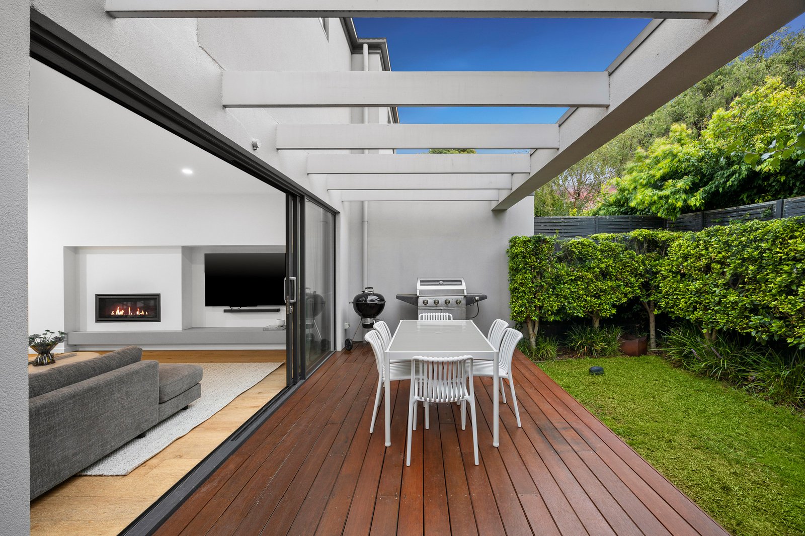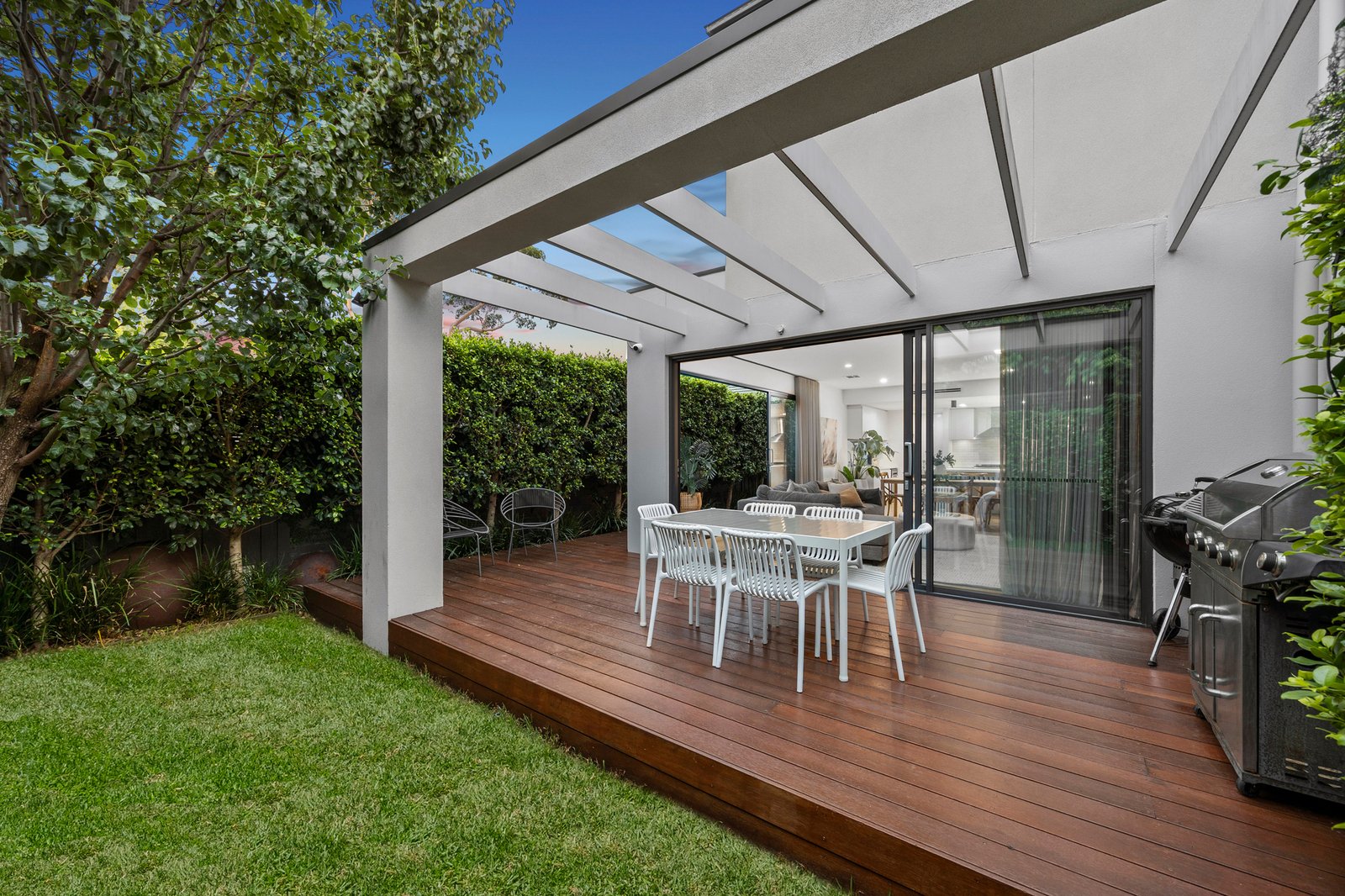 Living zones extend seamlessly through two expansive glazed aspects to a wraparound deck, creating an outdoor space for leisurely entertaining and relaxed weekends at home, while landscaped surrounds provide privacy and lush green outlooks.