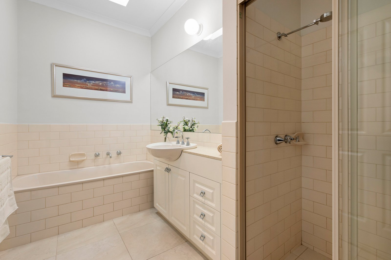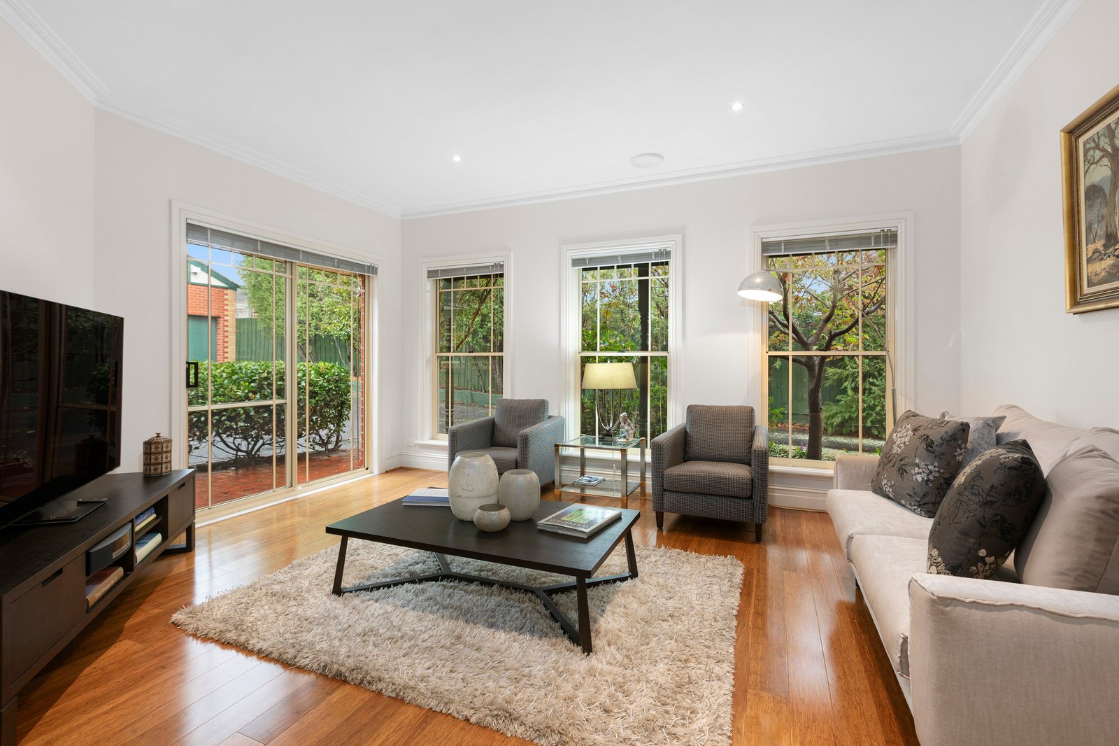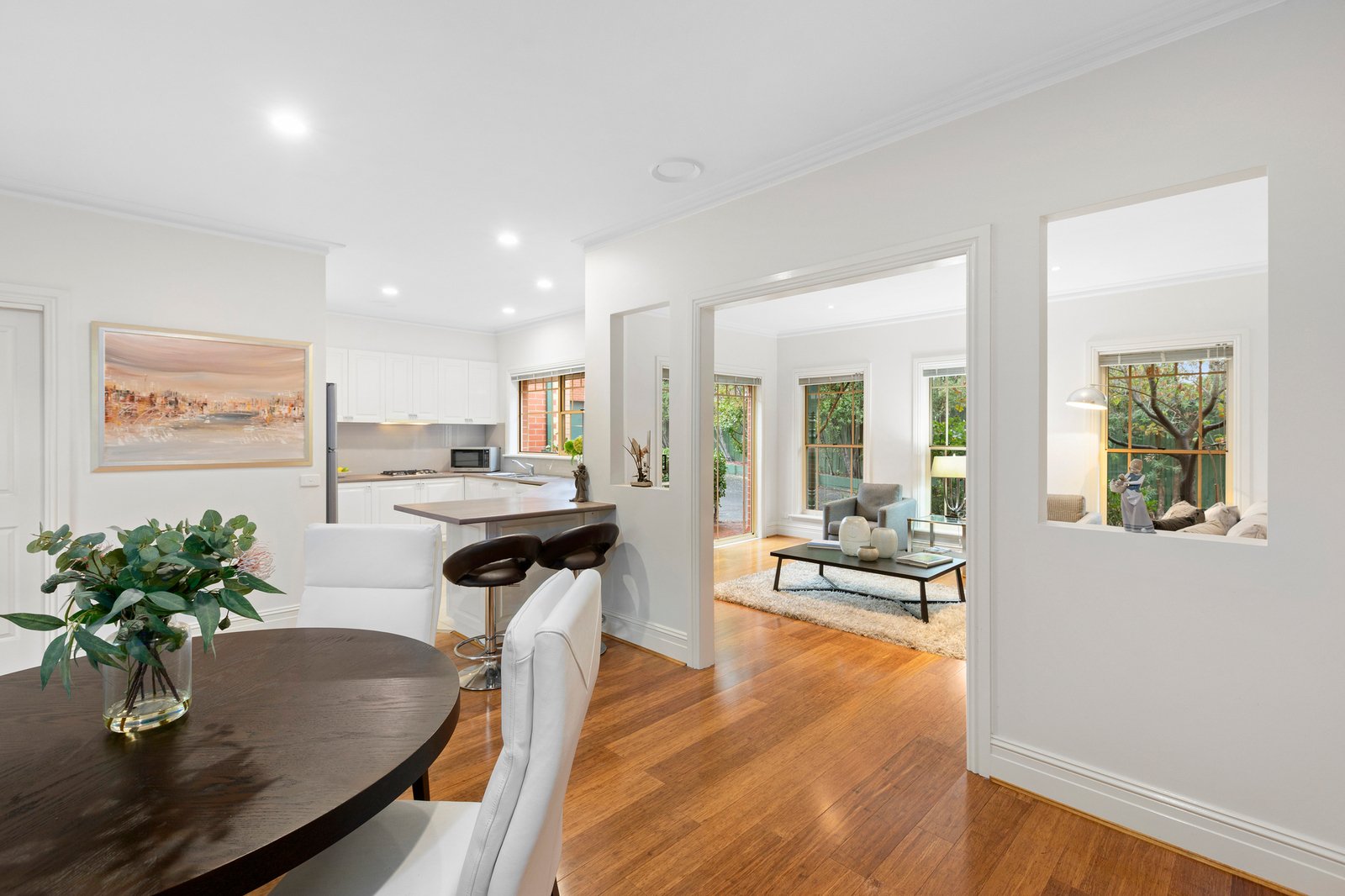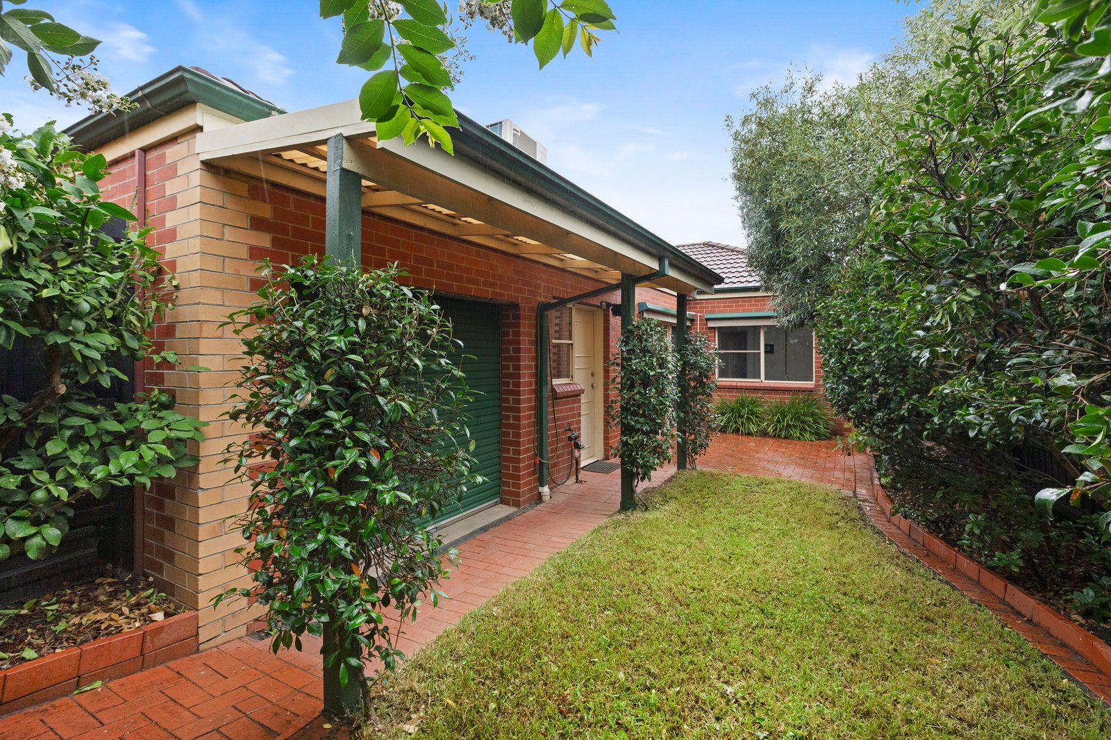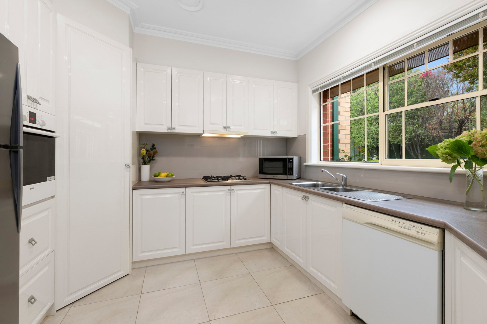 Giving a true feeling of light and space through the welcoming accommodation, the interiors comprise a generous lounge with multiple garden-view windows along with a welcoming full-size dining zone offering room to gather with loved ones. The kitchen also doesn’t scrimp on space, providing plenty of preparation and storage, including corner pantry and quality appliances, while outside, the perfectly private, leafy patio & garden extend the living area out into the afternoon sunshine.