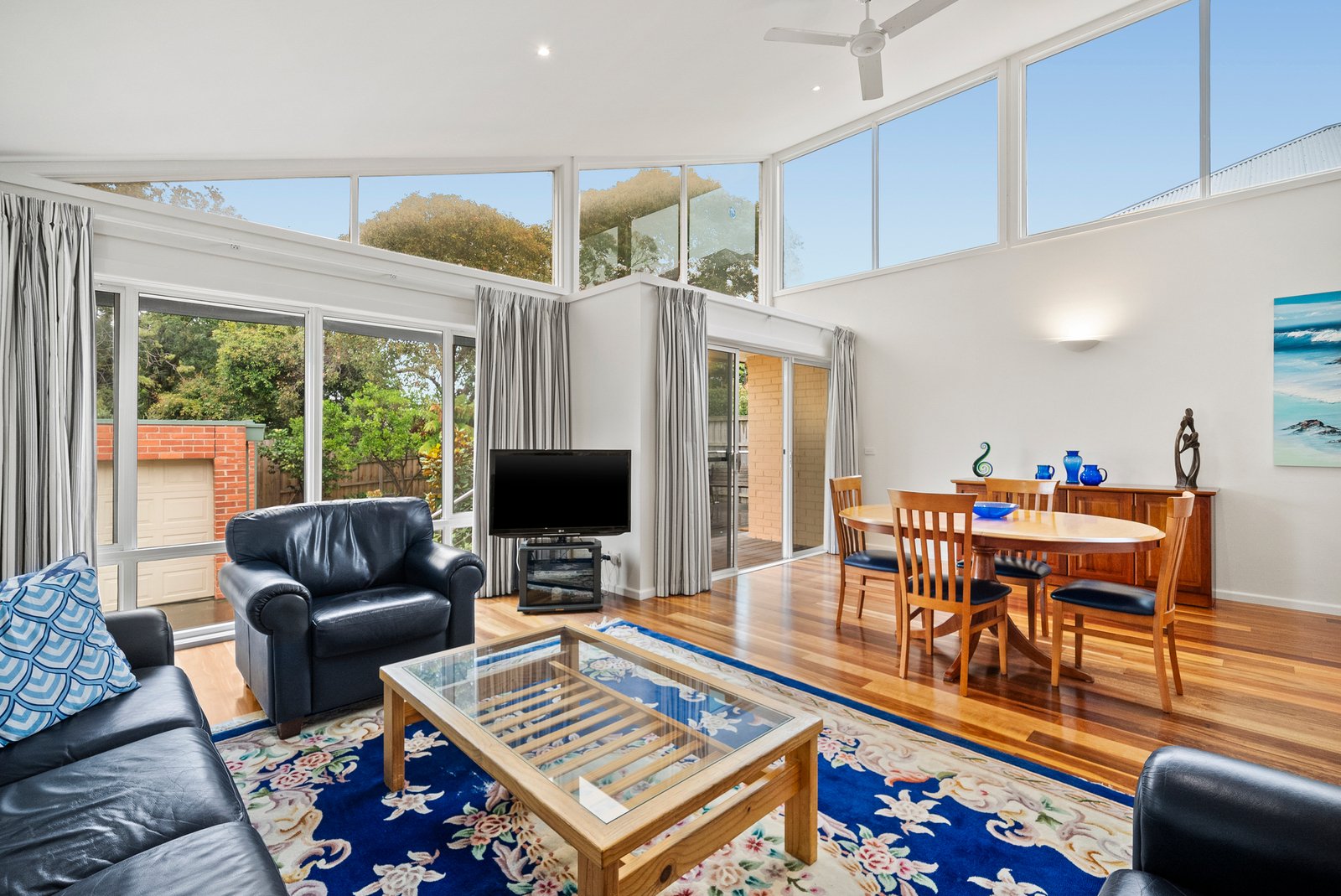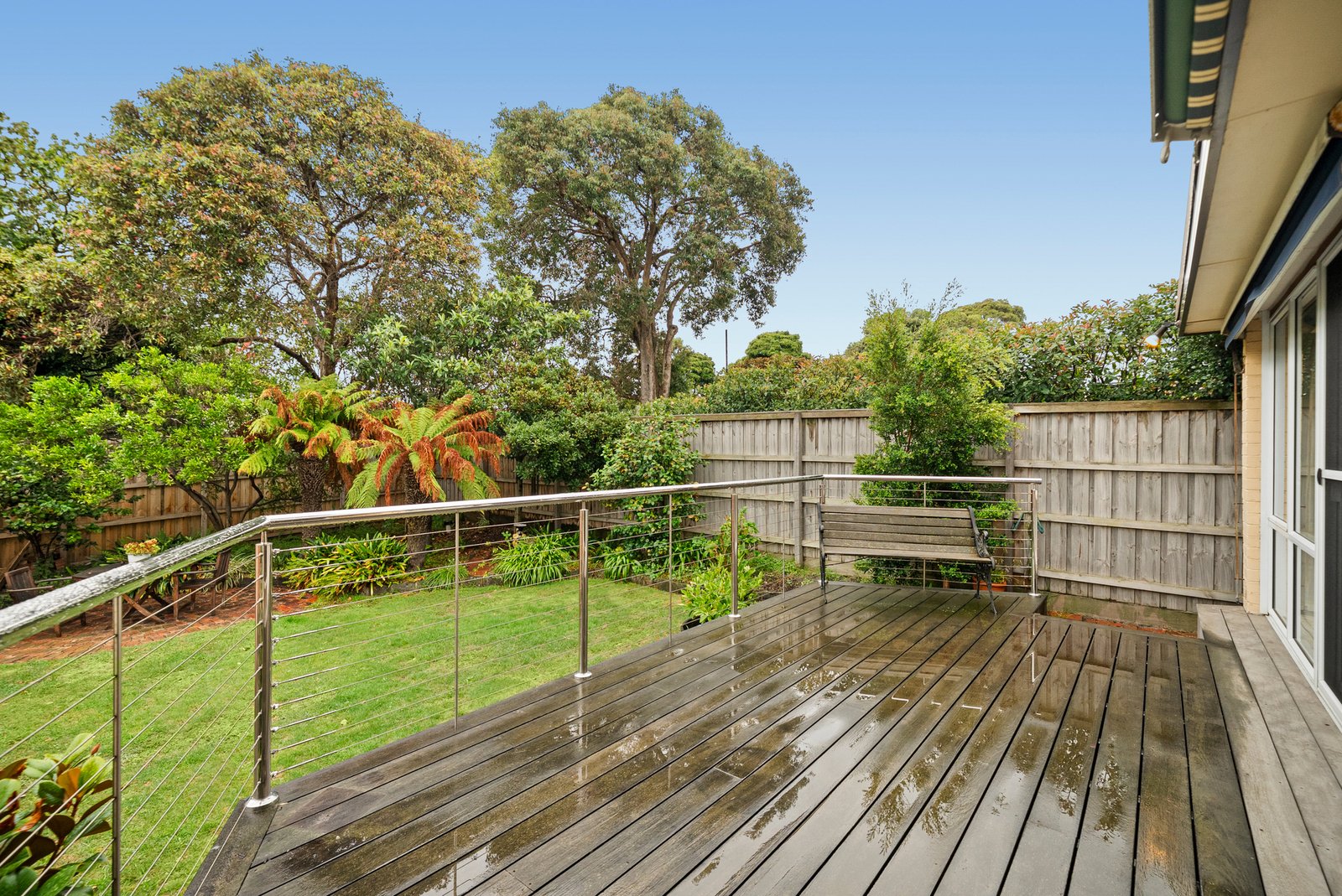 Sliding doors extend the interiors to an elevated al fresco deck perfect for outdoor dining and relaxed gatherings, overlooking established gardens that deliver genuine privacy and year-round enjoyment.
