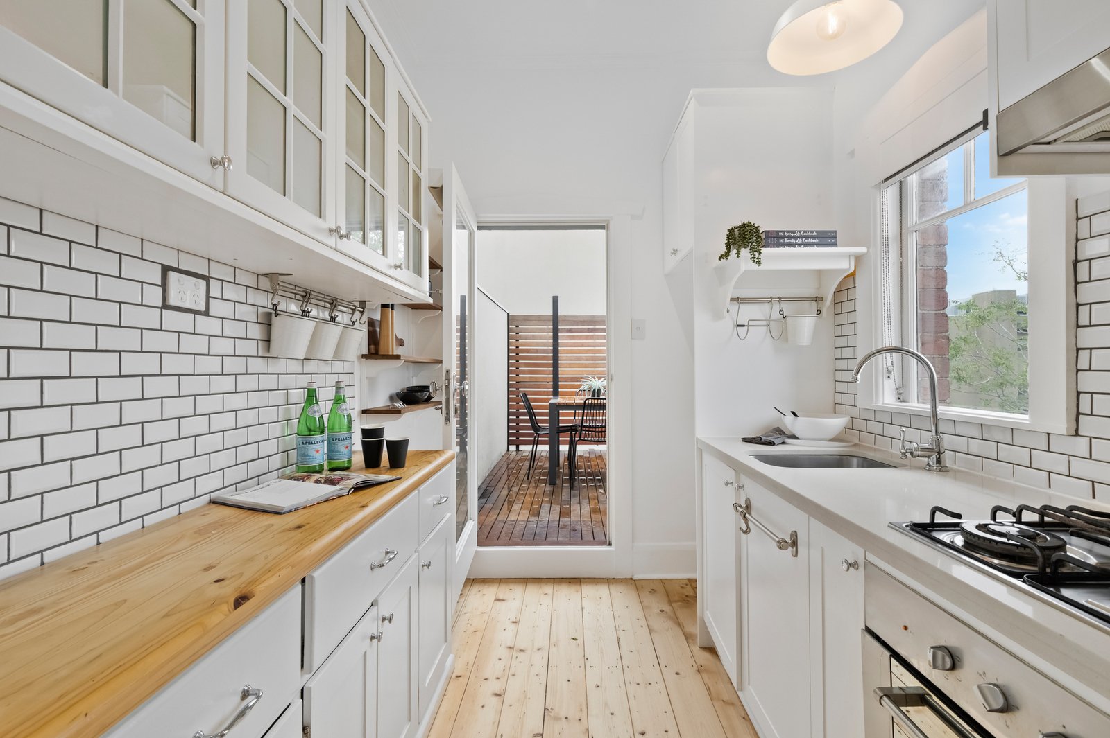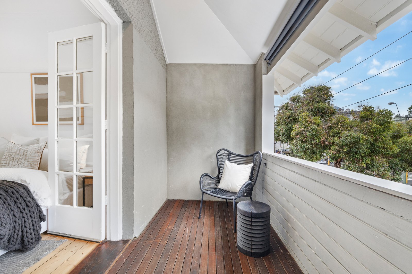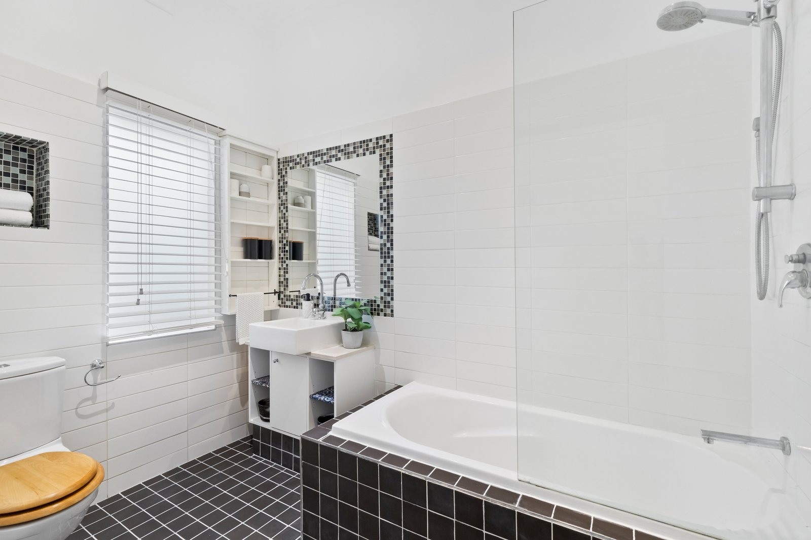 A light-filled bedroom boasts a ceiling fan, wall-to-wall-built-in robes, and direct access to a private undercover balcony overlooking the street below, while the pristine bathroom will impress with a shower over a bathtub.